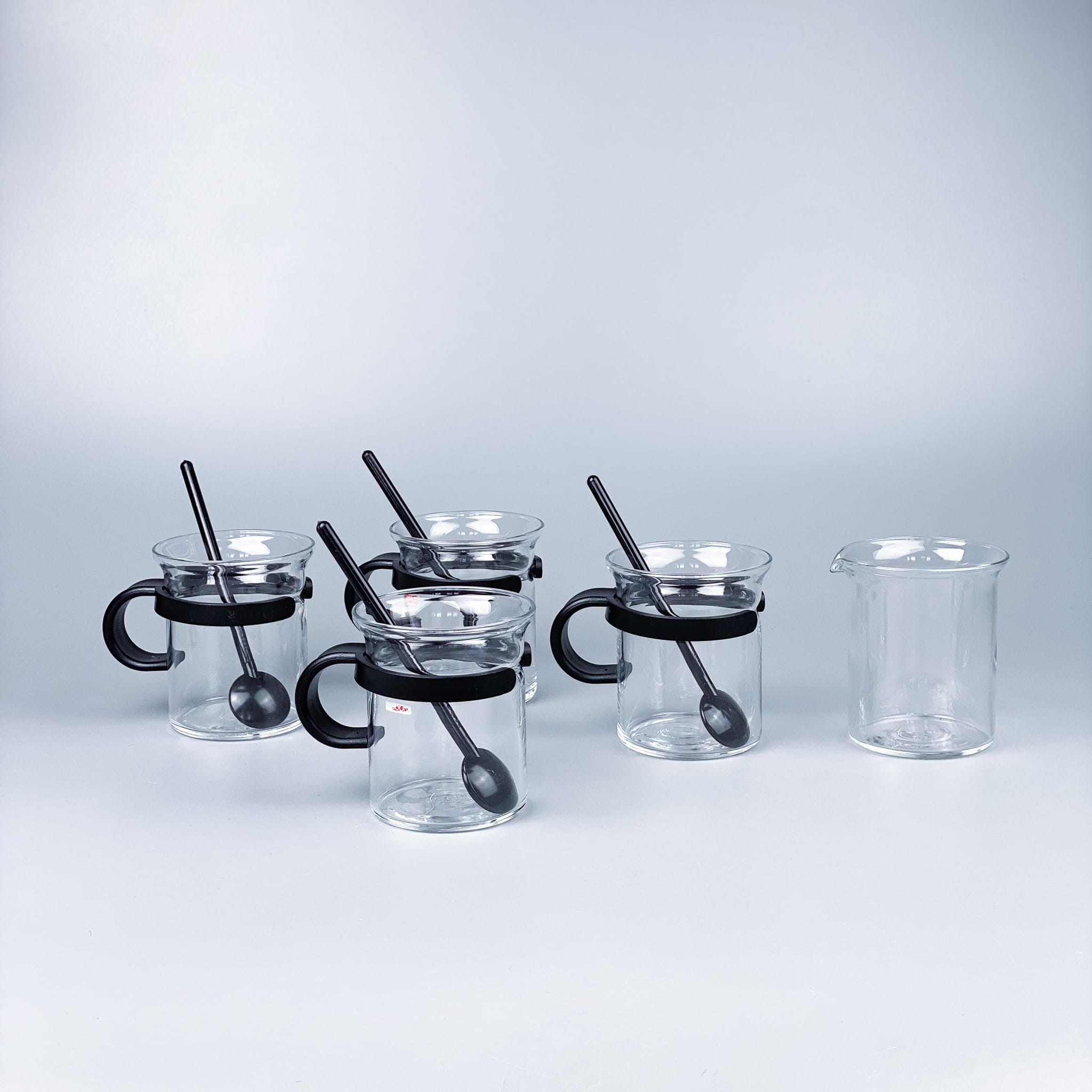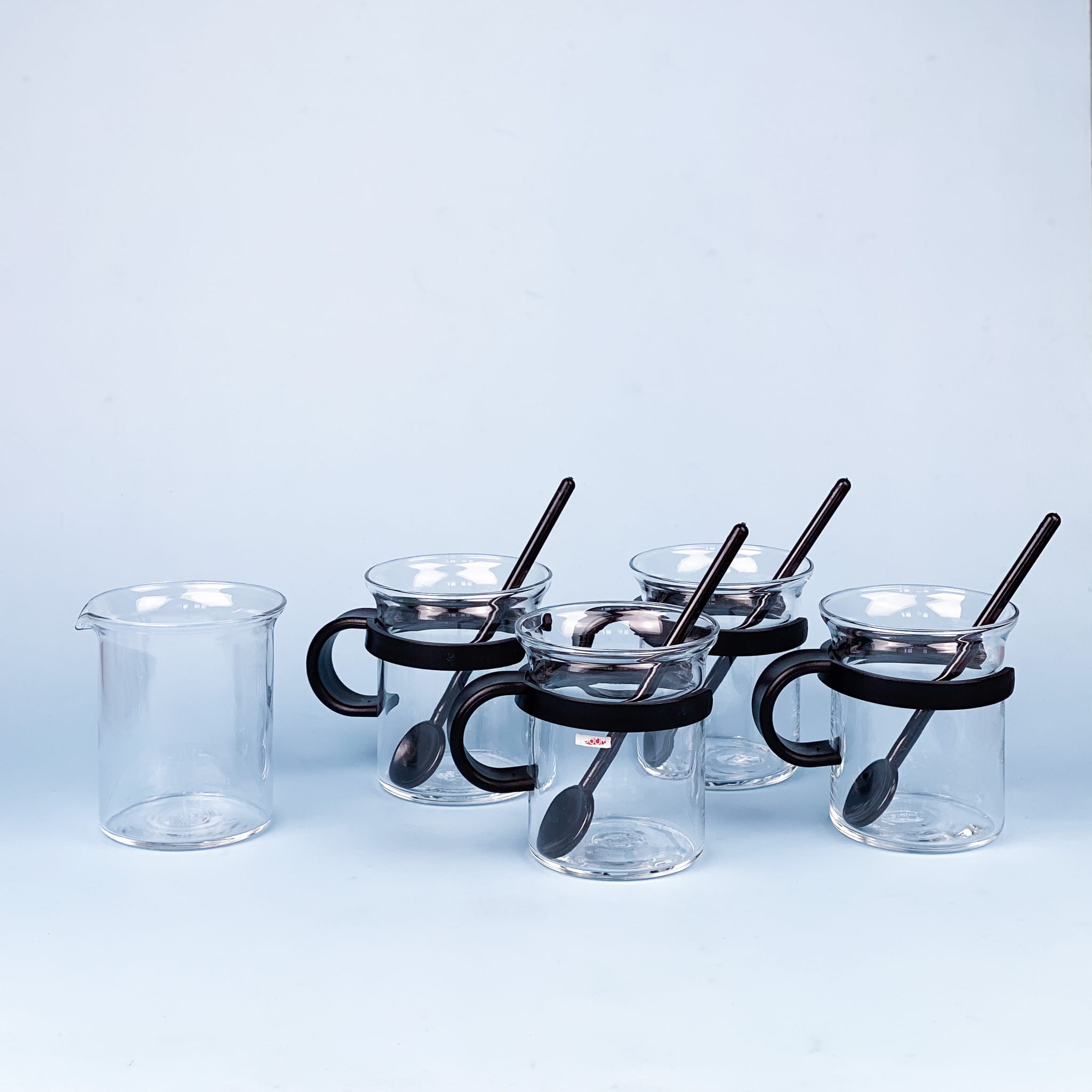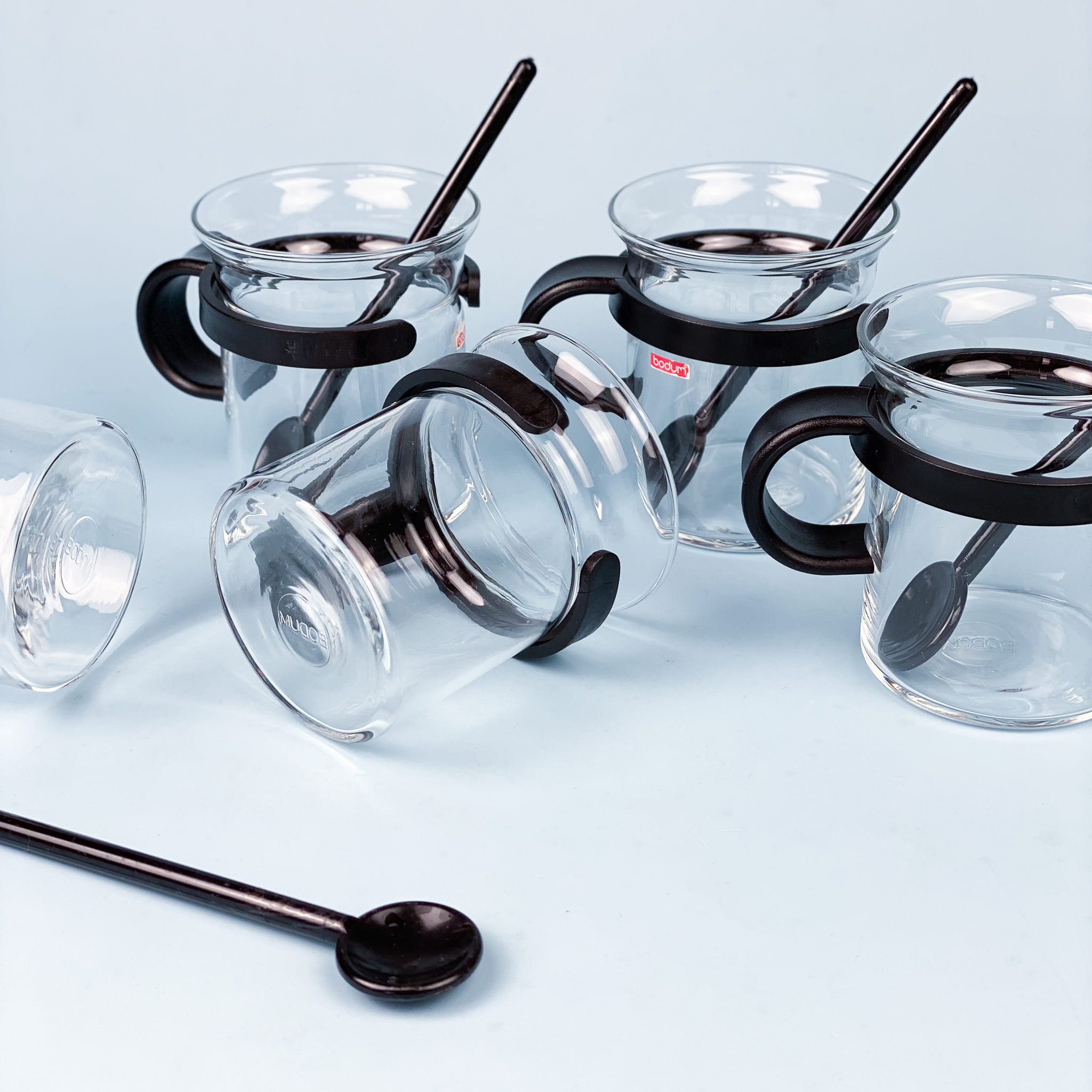 Zestaw 4 kubków z łyżeczkami i mlecznikiem Bodum Bistro z lat 70., zaprojektowanych przez duńskiego projektanta Carstena Jørgensena, z okrągłymi uszkami. Żaroodporny szklany korpus i zdejmowany, czarny, plastikowy uchwyt. Stan bardzo dobry / Pojemność: 0,2 l / 160 zł