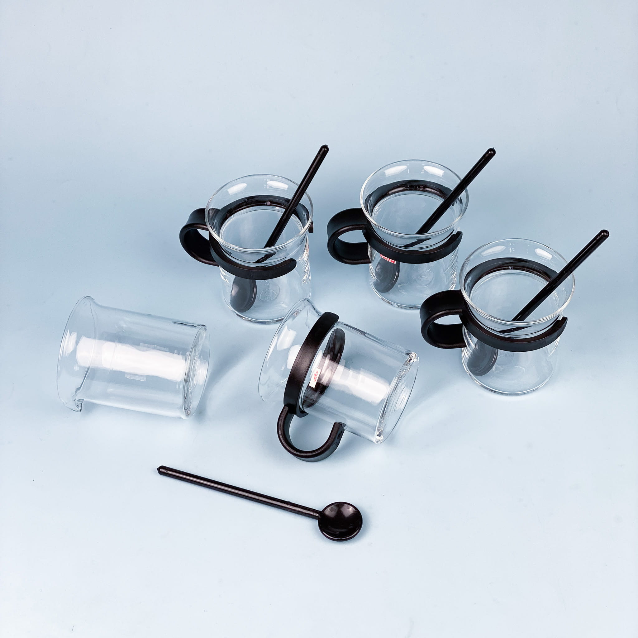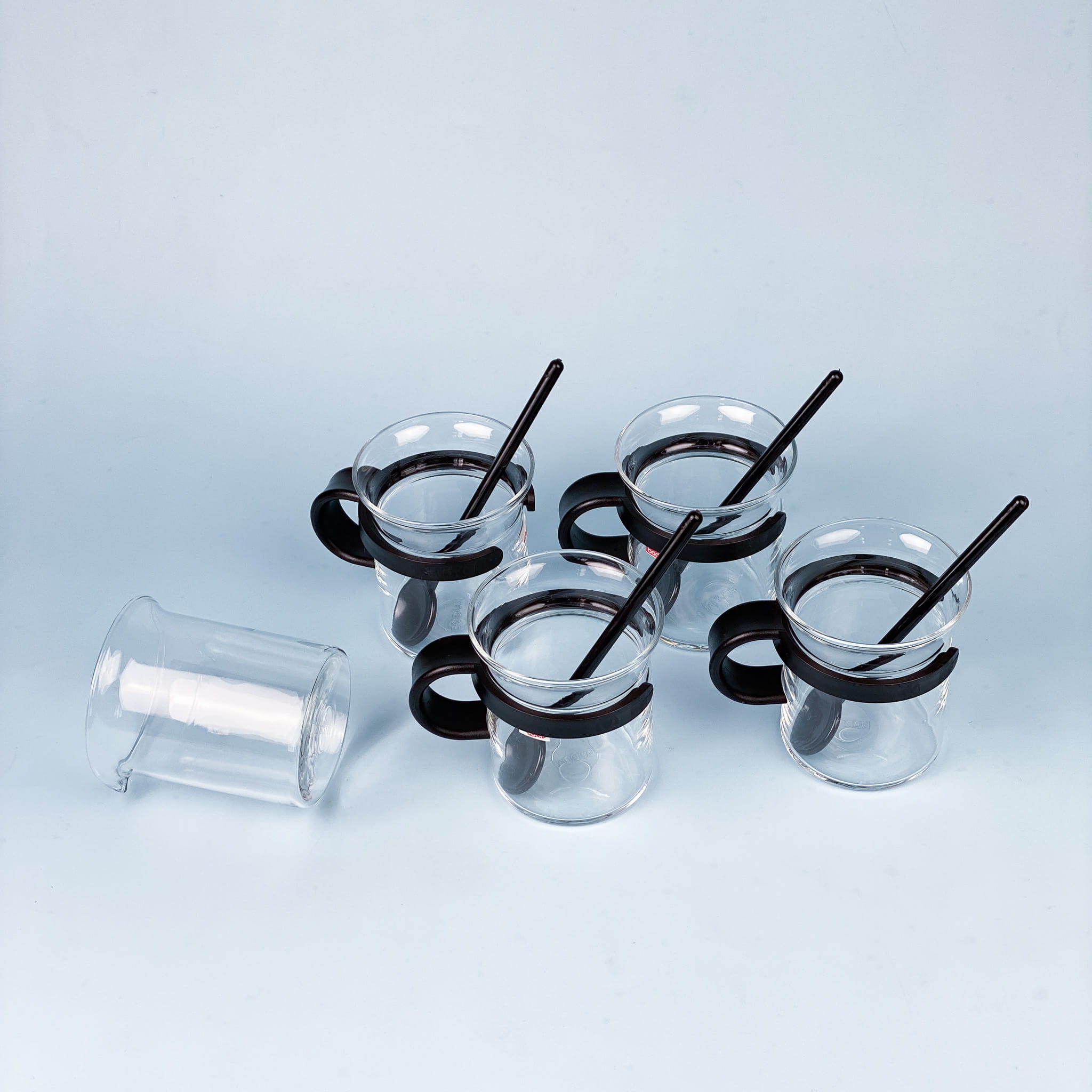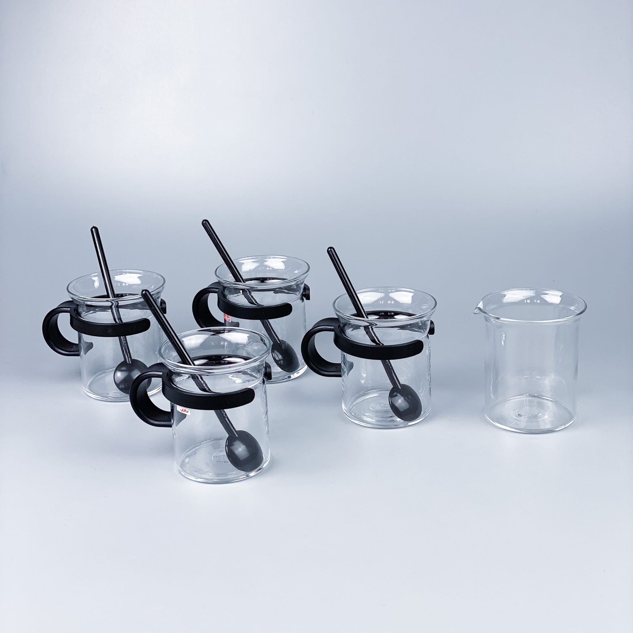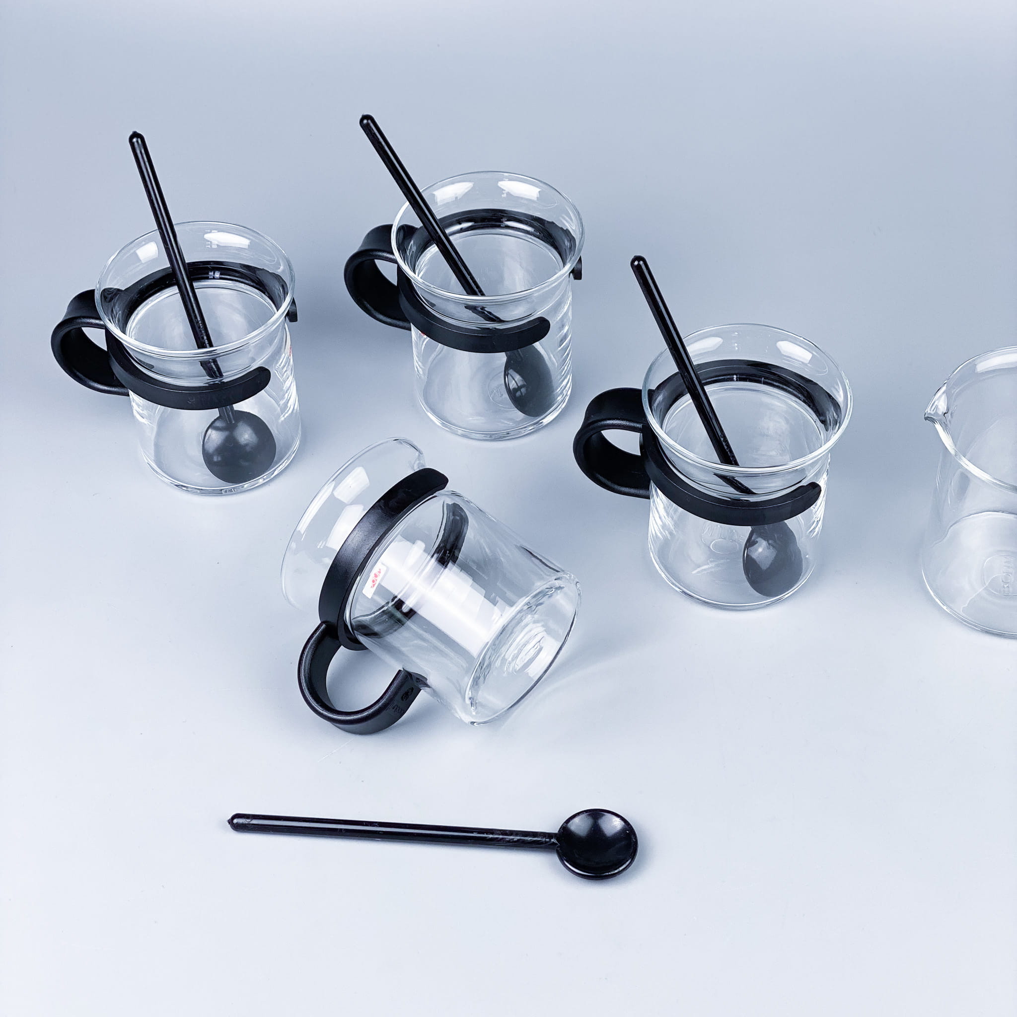 Zestaw 4 kubków z łyżeczkami i mlecznikiem Bodum Bistro z lat 70., zaprojektowanych przez duńskiego projektanta Carstena Jørgensena, z okrągłymi uszkami. Żaroodporny szklany korpus i zdejmowany, czarny, plastikowy uchwyt. Stan bardzo dobry / Pojemność: 0,2 l / 160 zł