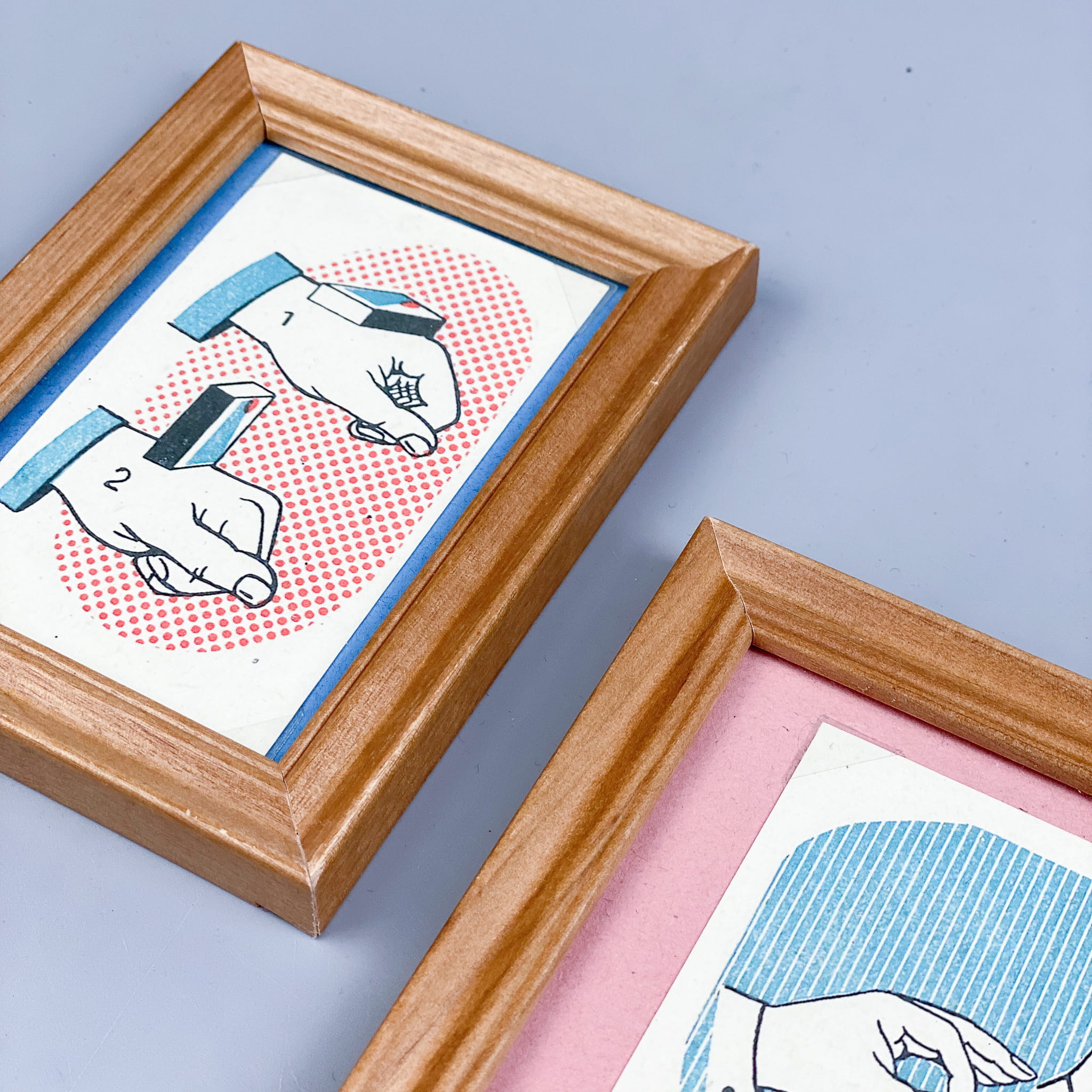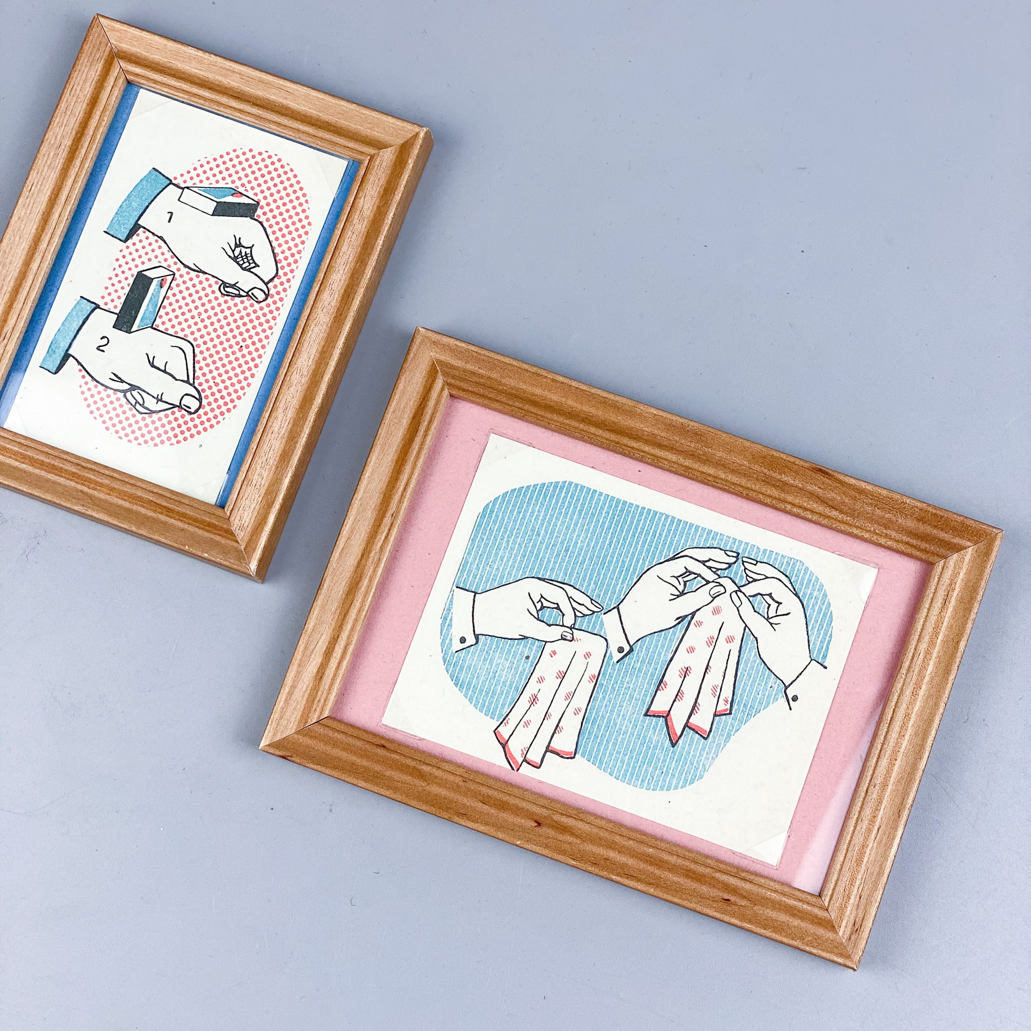 Dyptyk "Sztuczki". Reprinty grafik z książki dla dzieci o magicznych sztuczkach, jakościowy wydruk atramentowy na papierze Munken Pure 300g. Tutaj dwie malutkie w drewnianych ramkach (całość: 110 zł):