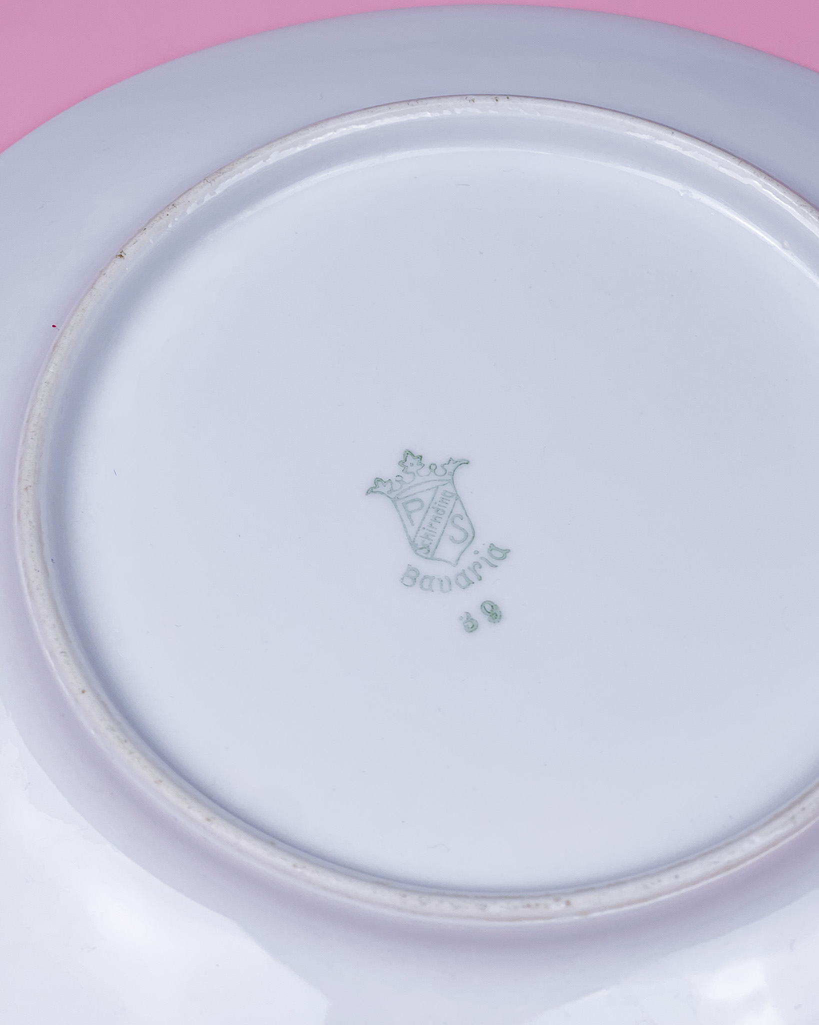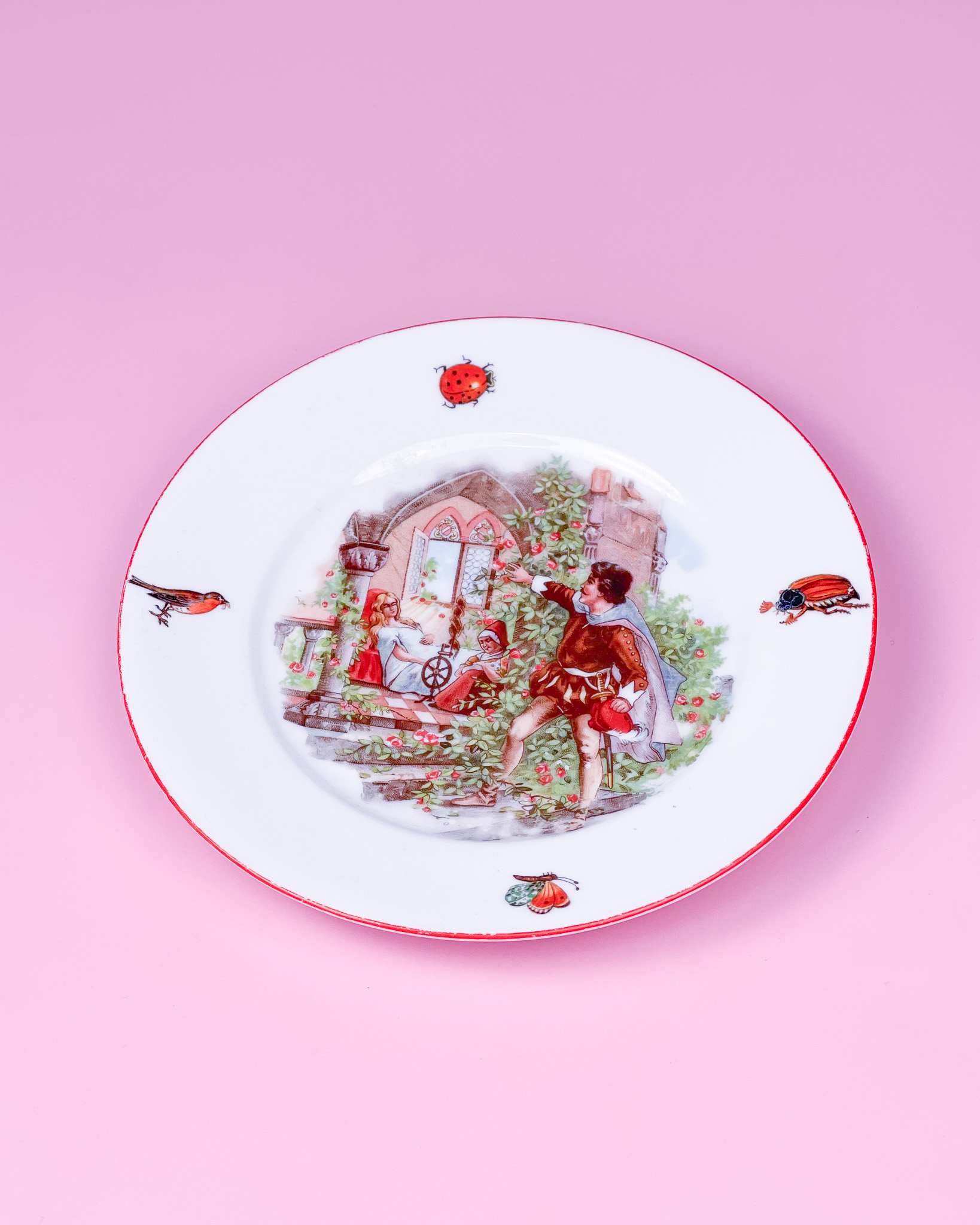 Dziecięcy talerzyk porcelanowy z motywem z bajki Śpiąca Królewna. Porcelana Bavaria Schirnding, trochę nie chce mi się wierzyć ale sygnatura świadczy o tym że to produkcja sprzed 1925 roku.. No nie wiem, ale no takiej, nawet podobnej ani w innym kolorze nie stosowano po 25 więc chyba tak.. I tak najlepszy jest ten chrabąszcz majowy! To jest hit. Na tym pączuś, ciasteczko, galaretka będzie wyglądała jak z bajki i jak dla królewny. Ej, świetny na Walentynki w sumie / średnica: 19 cm / 150 zł