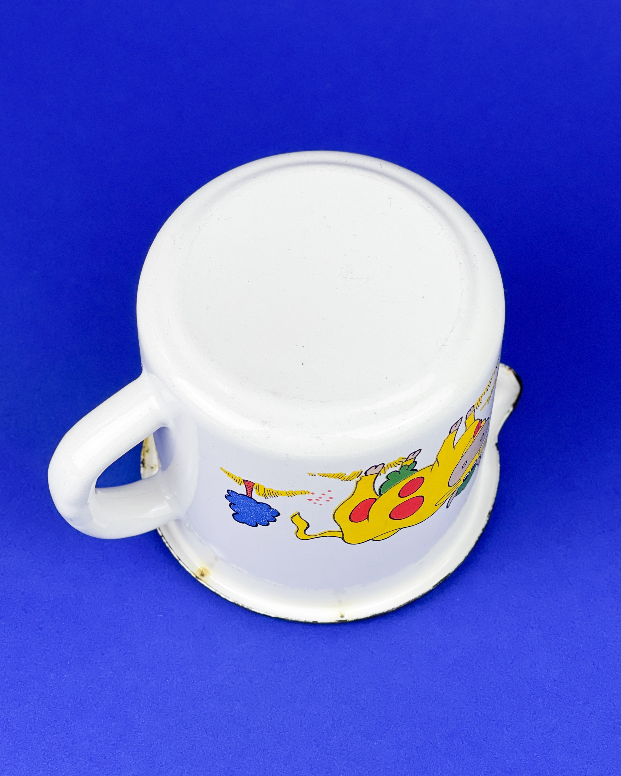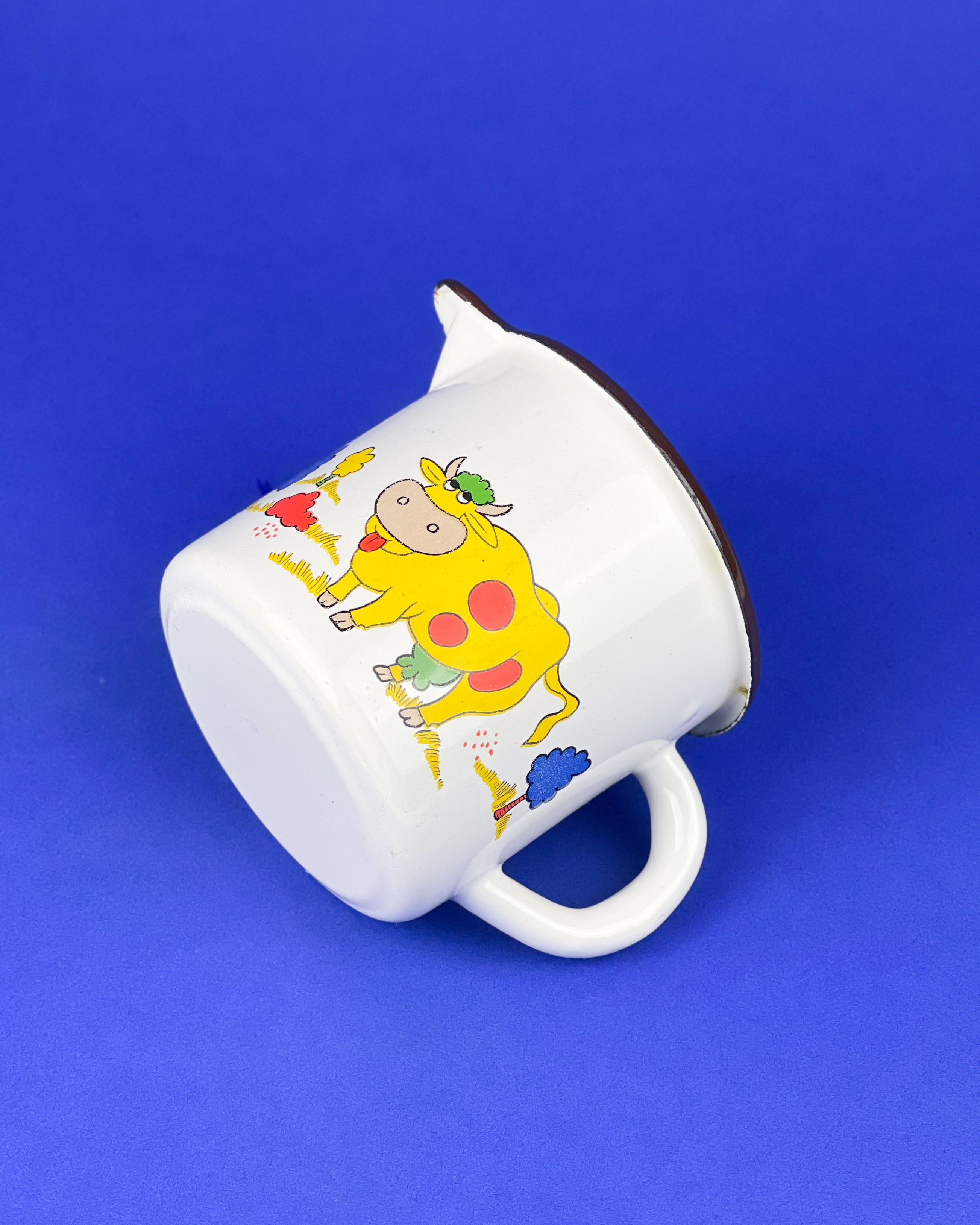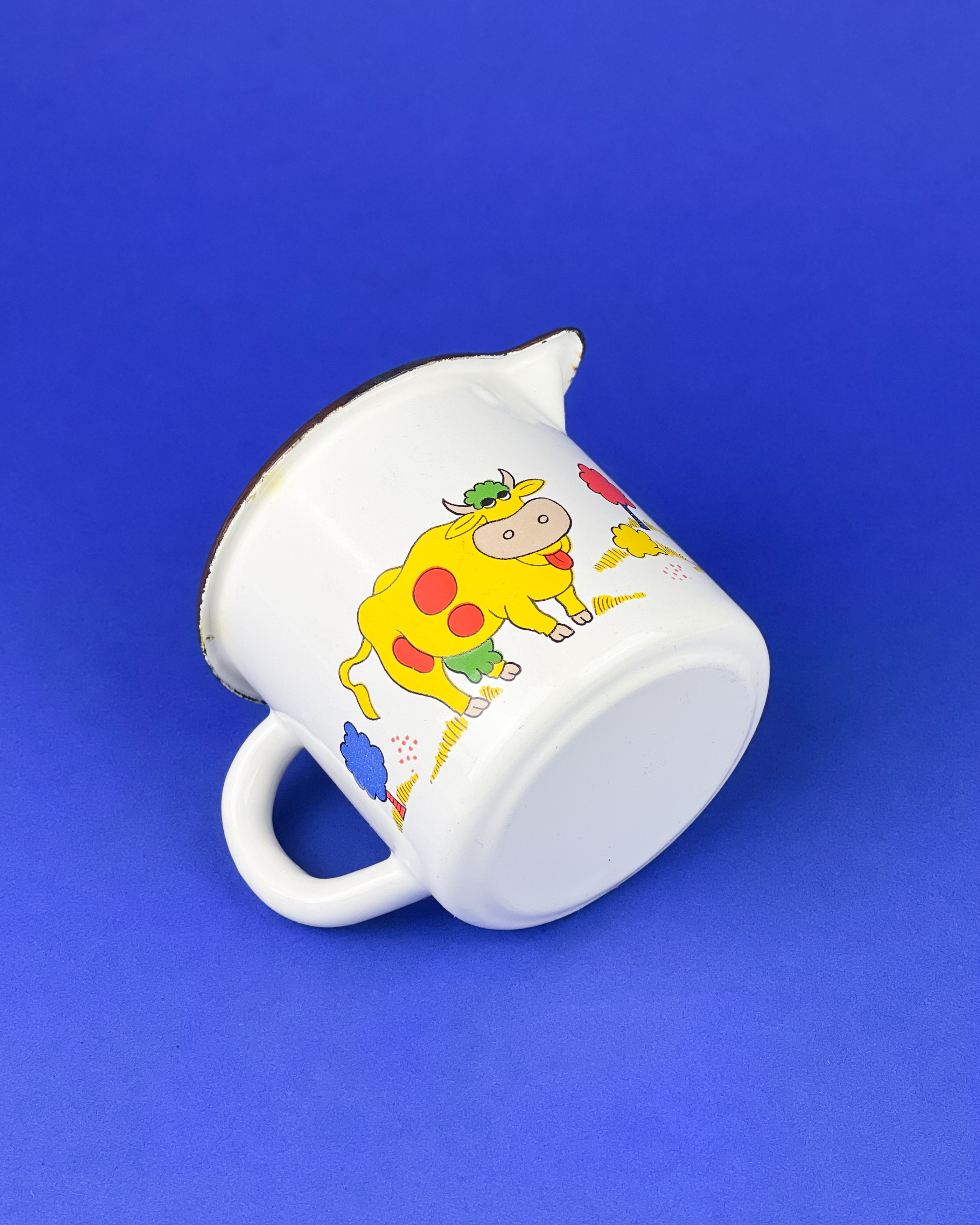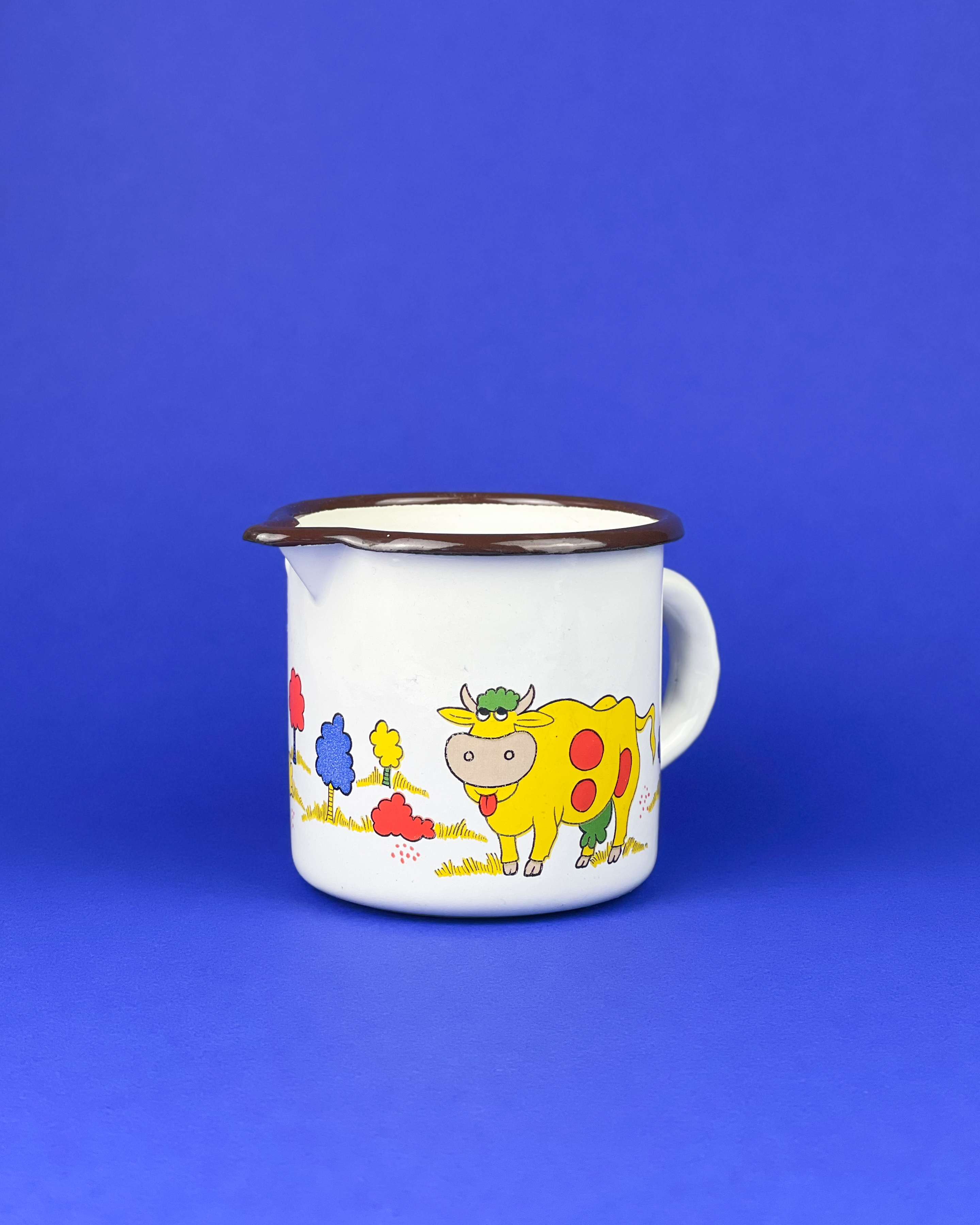 Emaliowany garnuszek w krowy przewracające oczami. Żółte krowy / średnica: 11,5 cm / wysokość: 10 cm / pojemność: 0,7 l, idealny na leki lub jajeczko / 55 zł