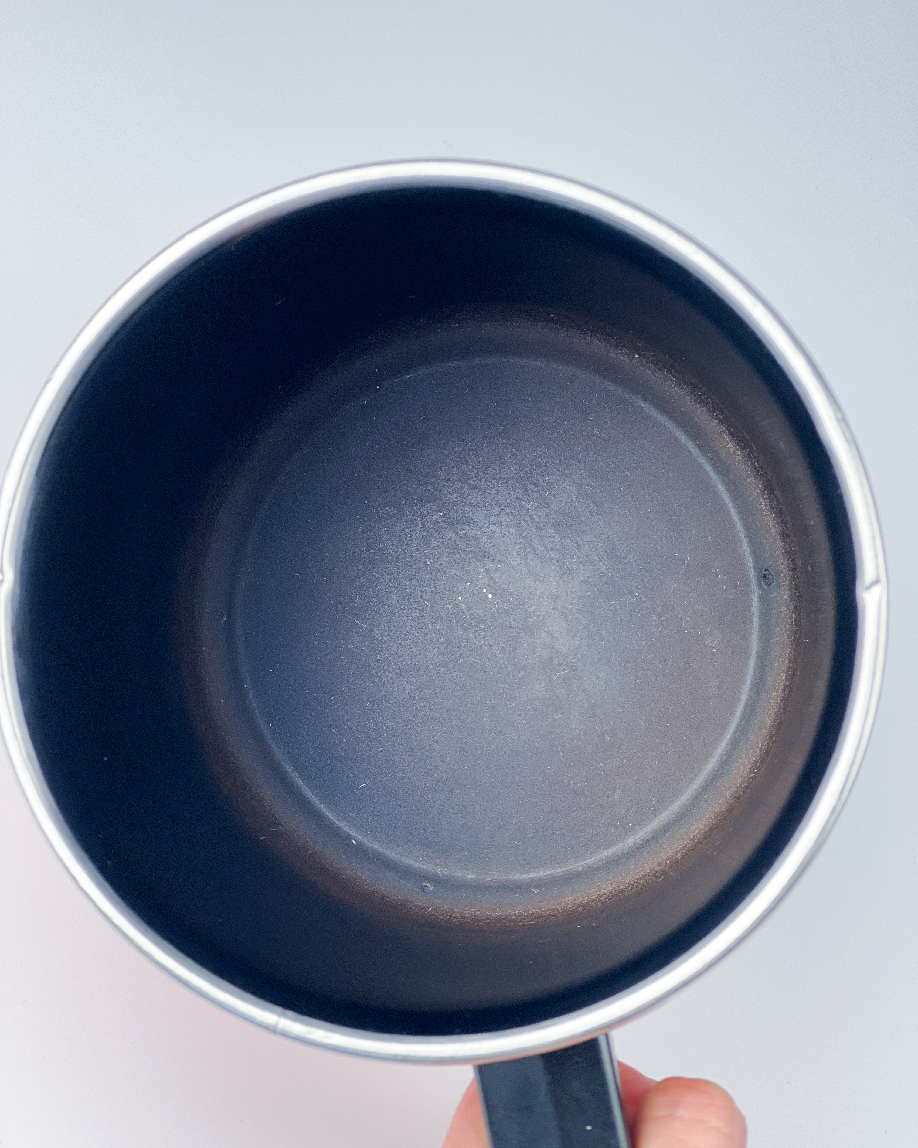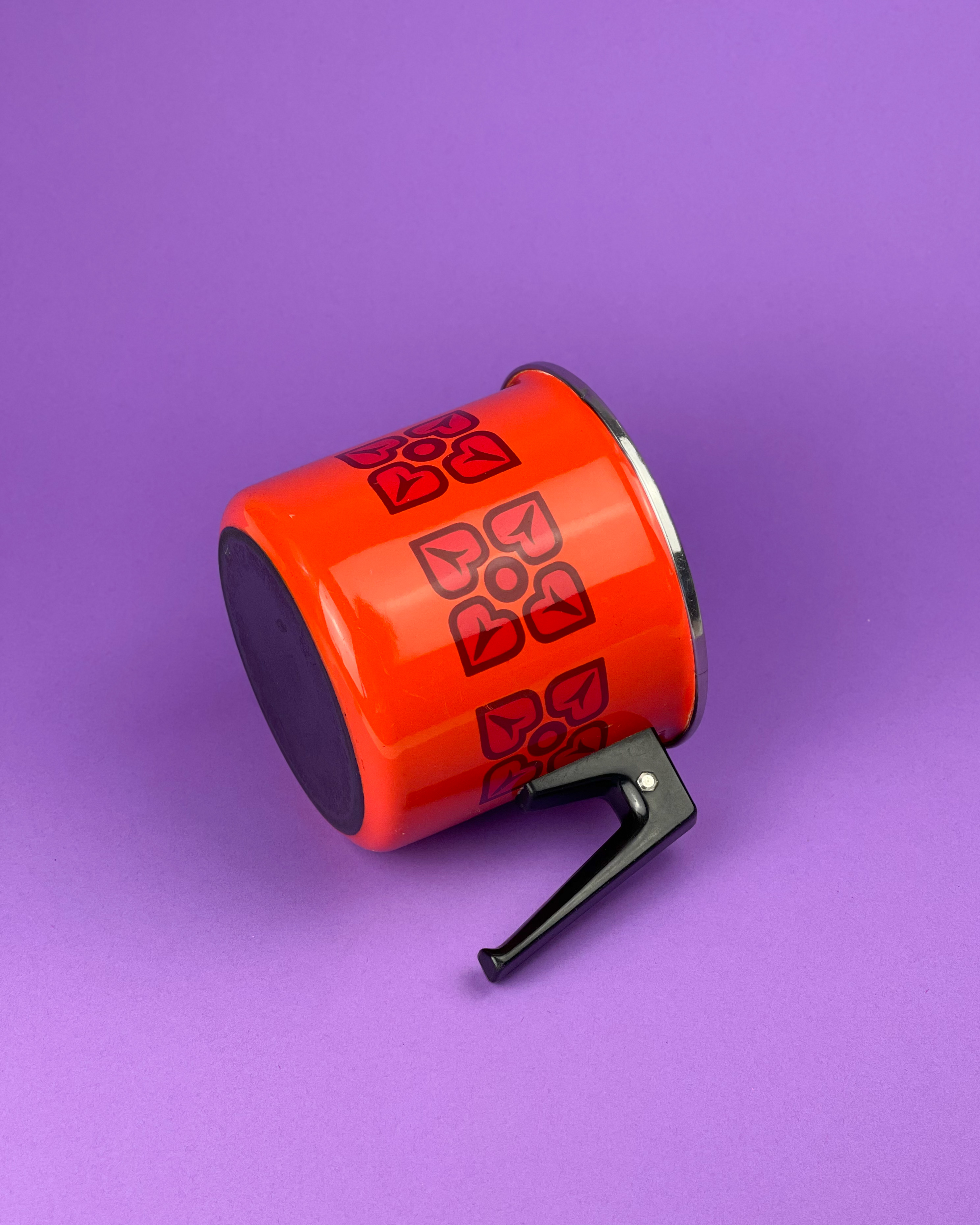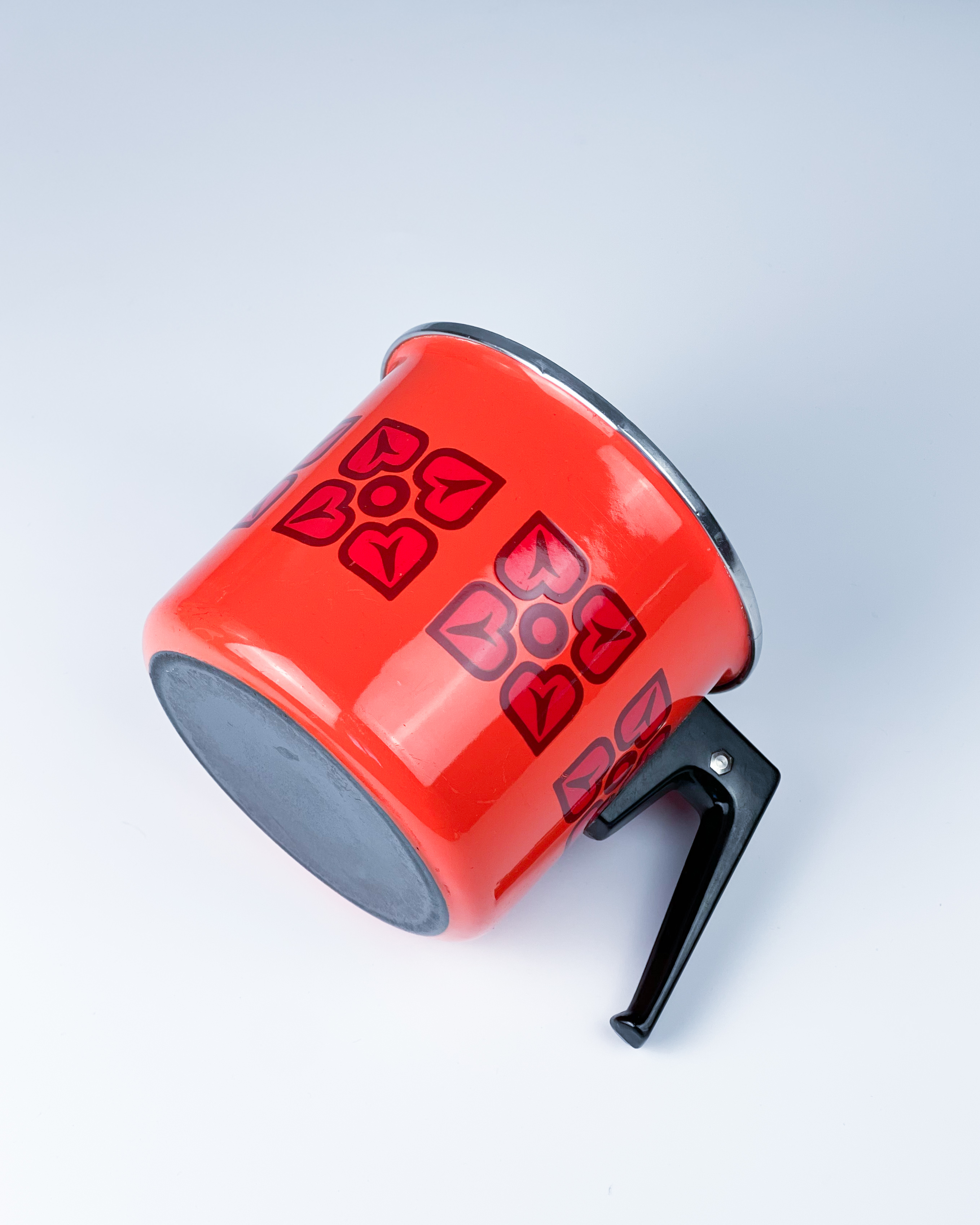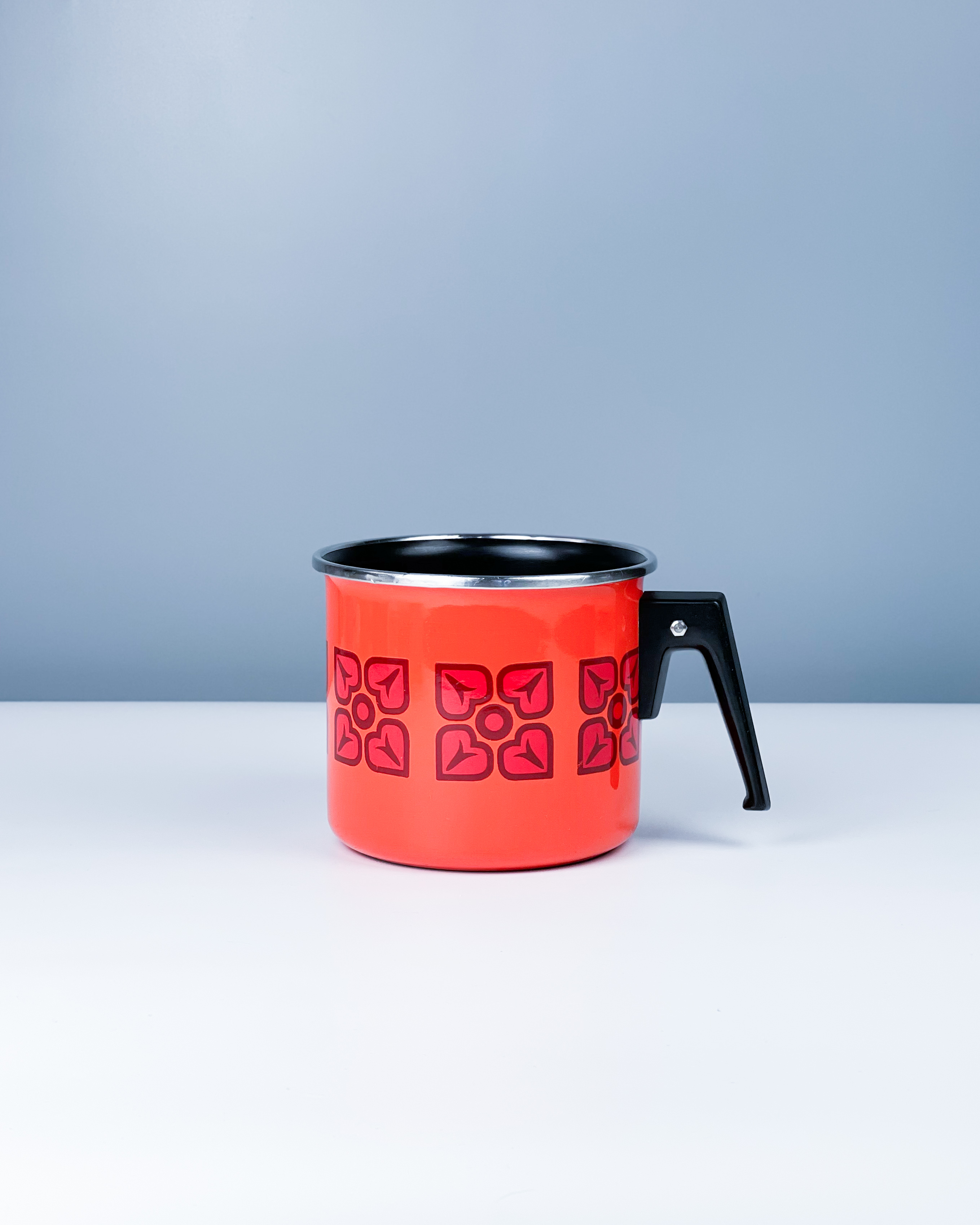 Emaliowany garnek do mleka (lub innych rzeczy) z lat 70. Najprawdopodobniej produkcji niemieckiej marki. Żywe kolorki i charakterystyczny seventisowy wzór. Jakie to jest ciężkie! Co świadczy o naprawdę grubym dnie czyli mleczko lub kasza tak łatwo Wam się nie przypali. Z zewnątrz w perfekcyjnym stanie, spód nosi ślady kontaktu z kuchenką, no bo jak inaczej, w środku trochę zużyty ale nadal działa. Ciepło odporna raczka, pewnie z jakiegoś bakelitu. Kurcze no, myślę że jeszcze posłuży kolejne 60 lat! / średnica: 15 cm / wysokość: 13 cm / pojemność: 1,5 l