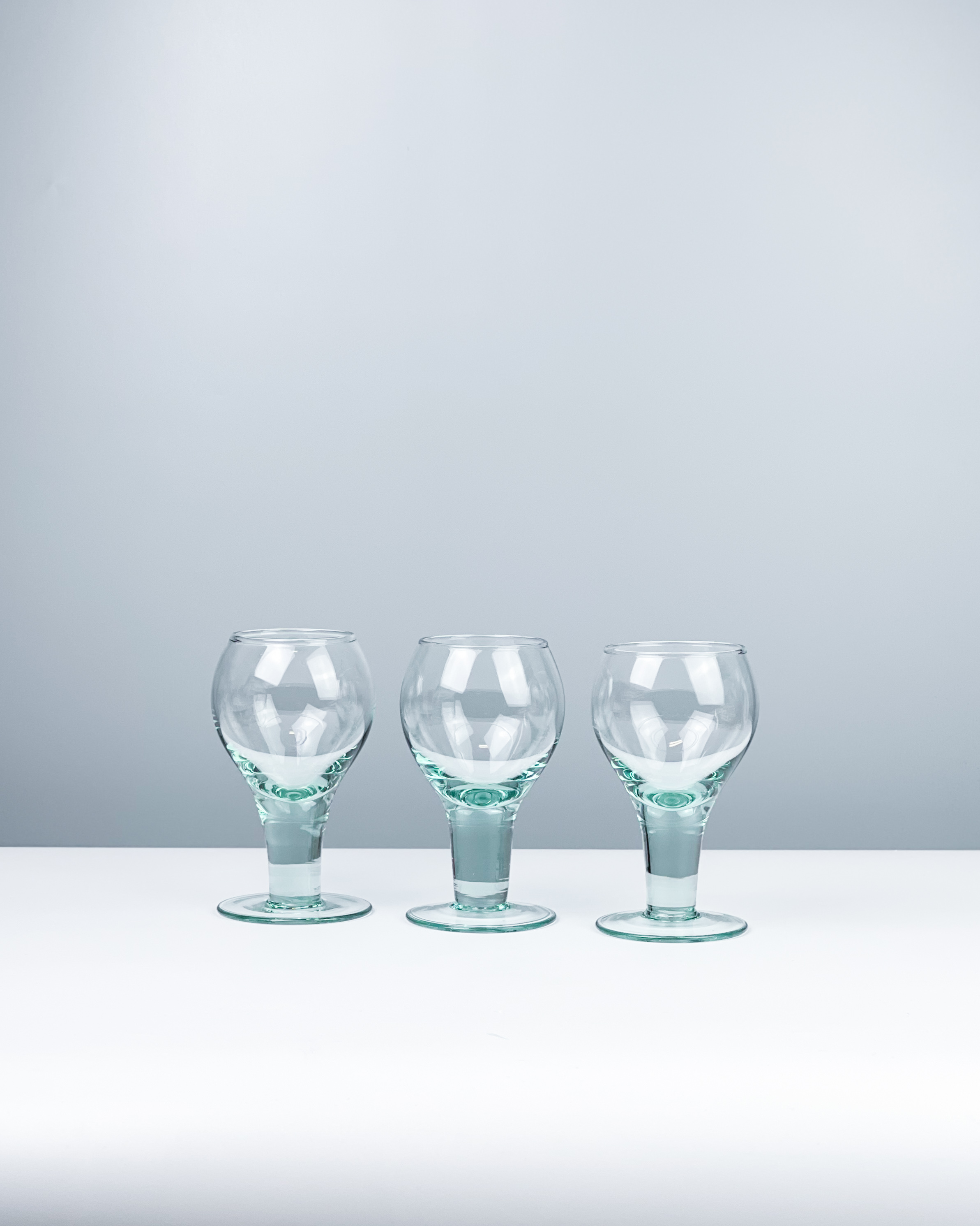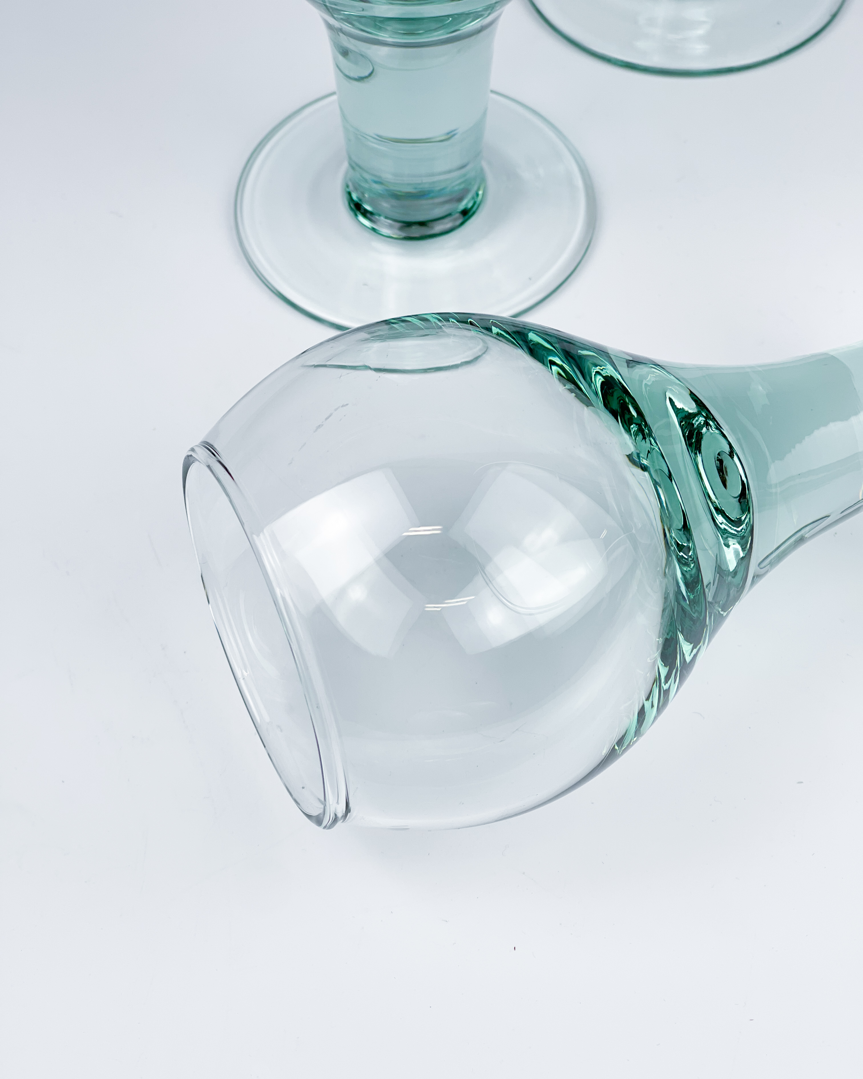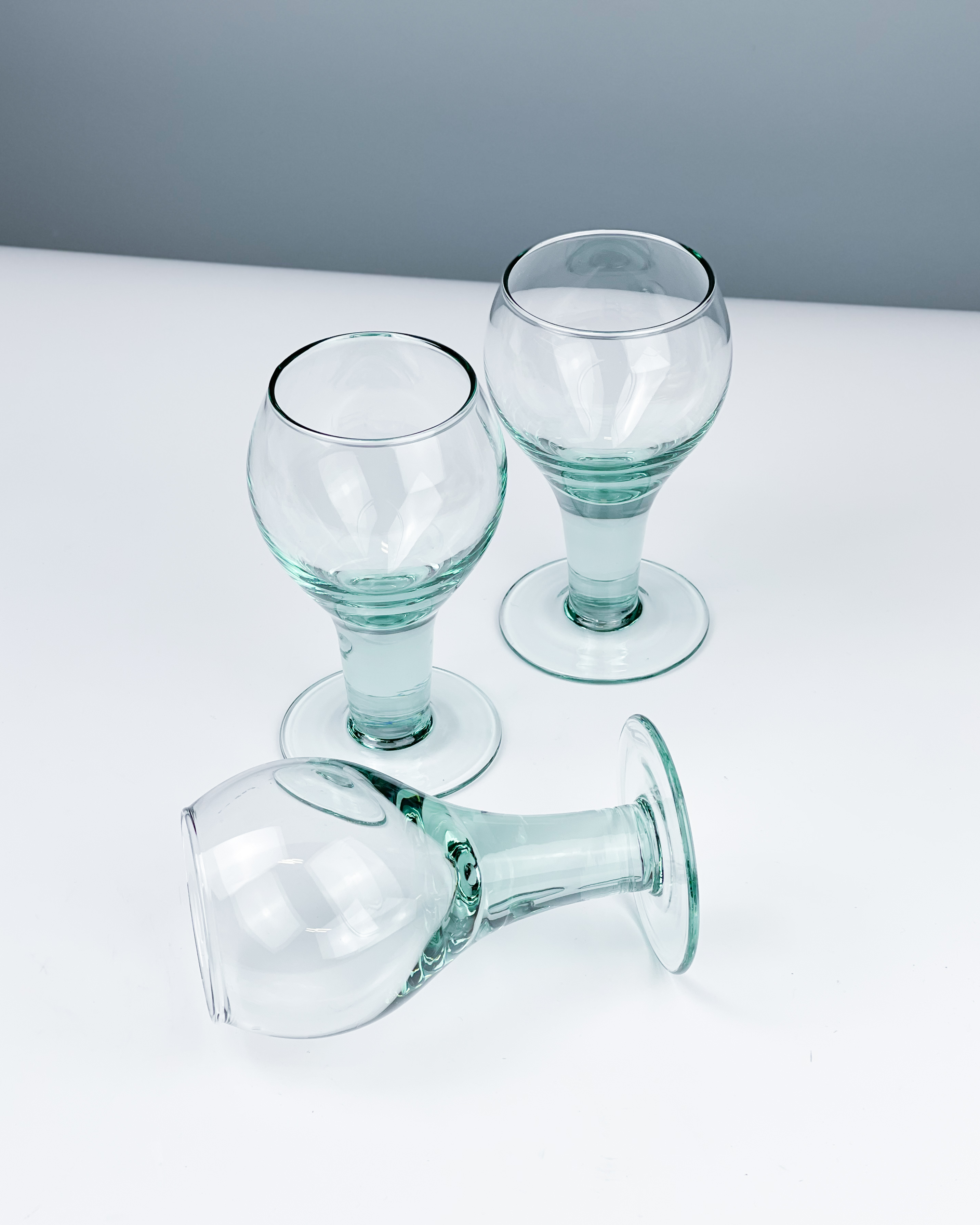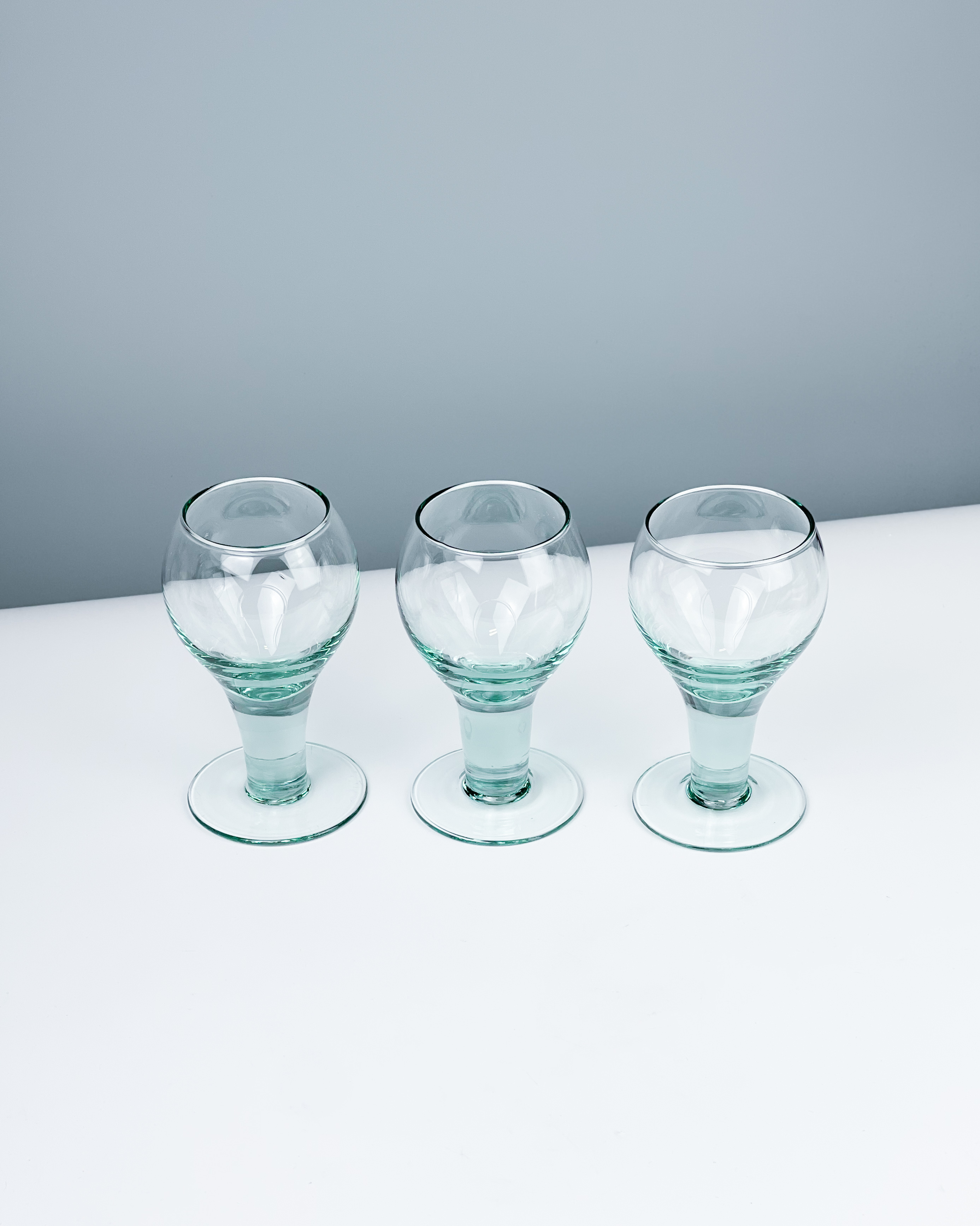 Trzy kieliszki z ręcznie formowanego szkła. Masywne, lekko turkusowe, fajnie leżą w ręku. Bez ubytków, mogą mieć delikatne ryski / wysokość: 15 cm / średnica: 8 cm / pojemność: 250 ml / 120 zł za komplet