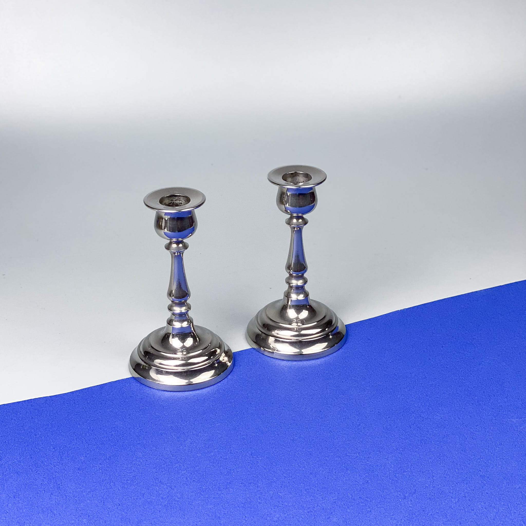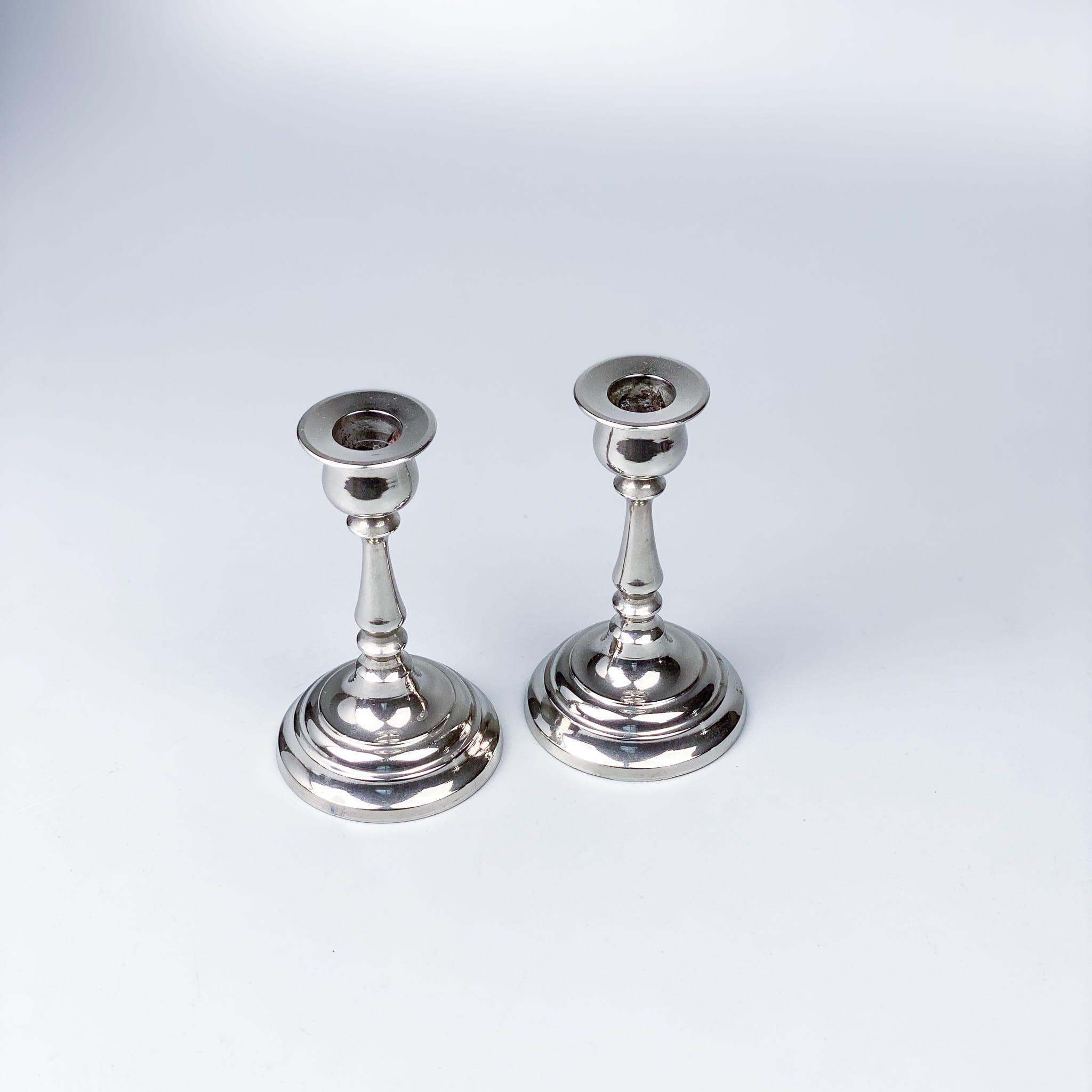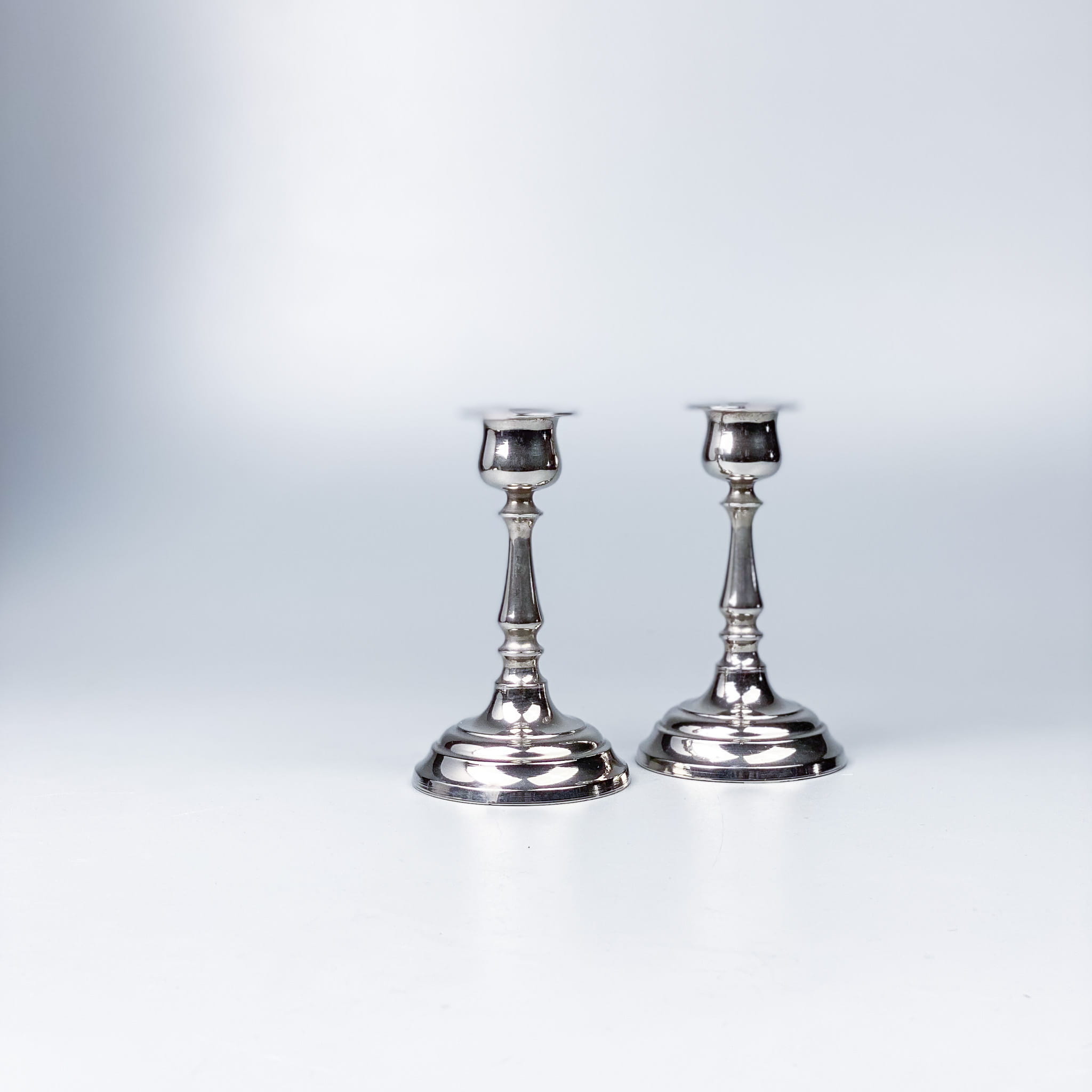 Dwa świeczniki cynowe niklowane, stan bardzo dobry, widoczne delikatne ślady użytkowania / wysokość: 12 cm / średnica dolna: 7 cm / średnica górna: 4 cm / 55 zł za dwa