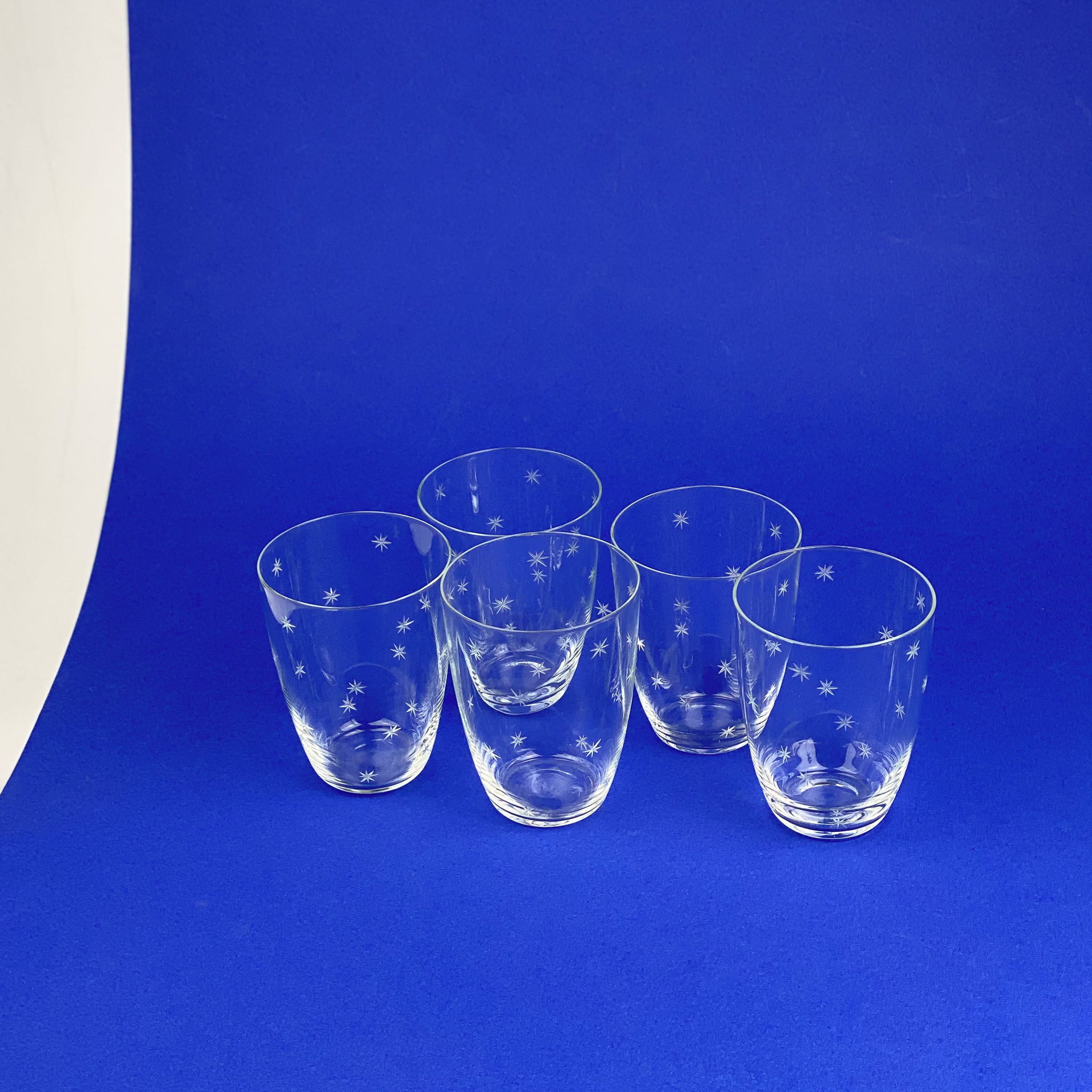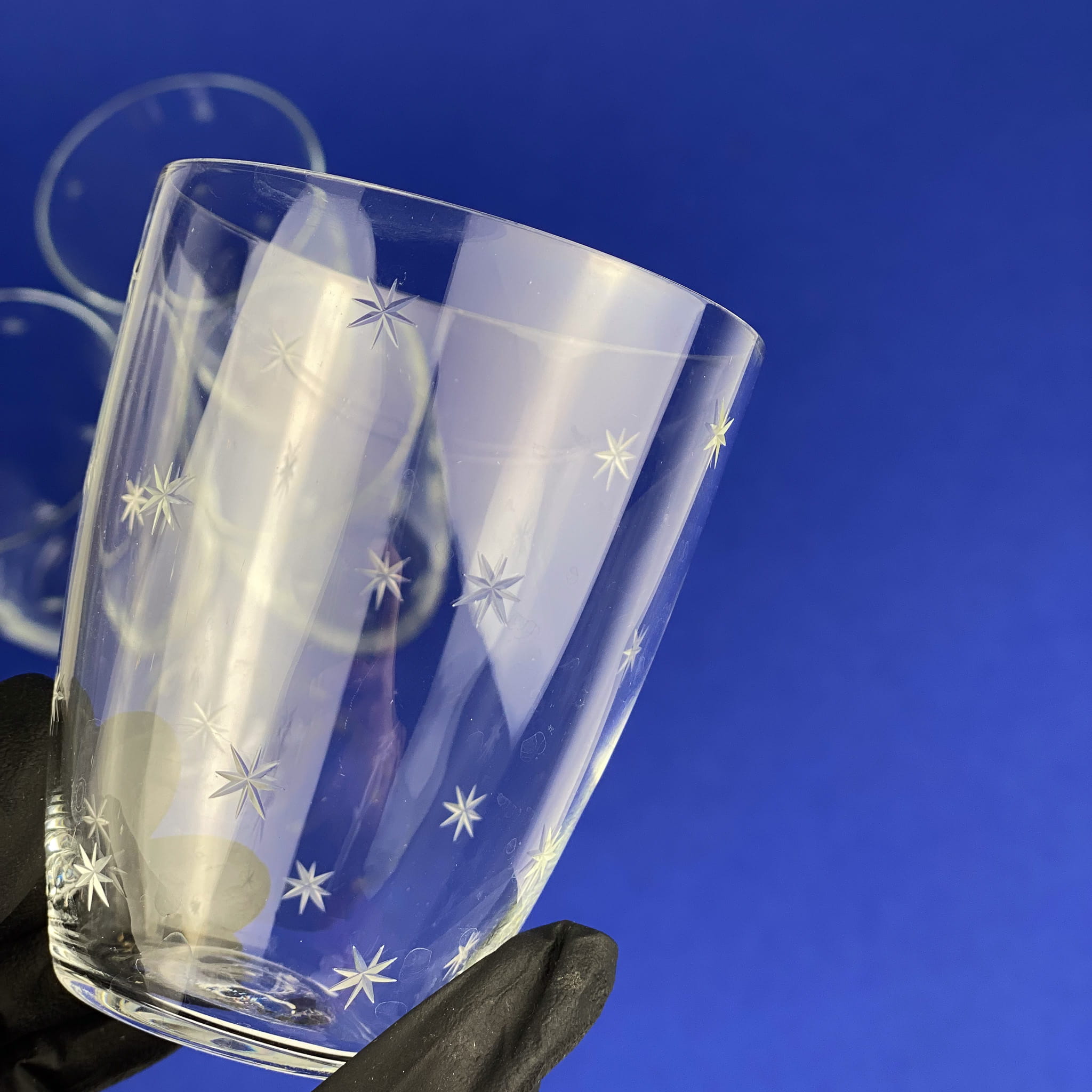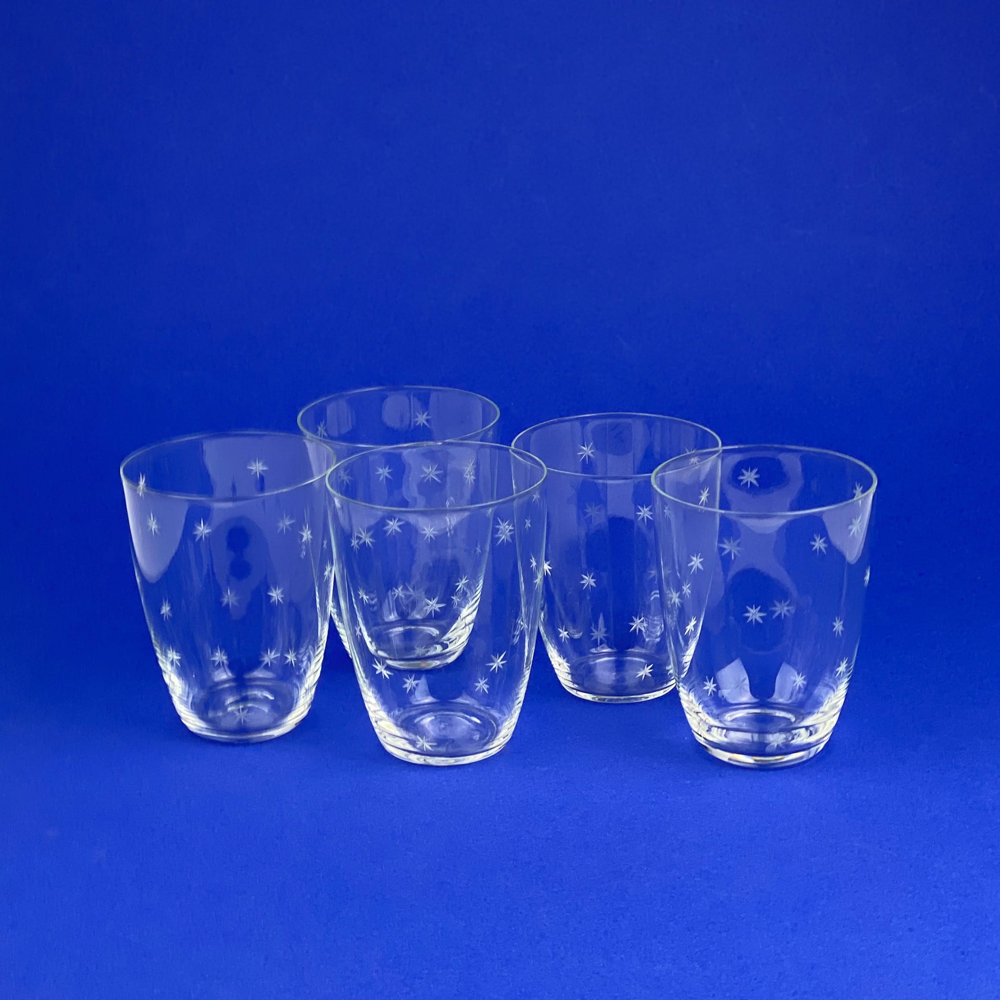 Szklanki z subtelnym szlifem w kształcie gwiazdek. Piękne, stare, ręczna robota, widać że nie takie badziewie jak teraz. Podejrzewam, że szkło kryształowe. Nie mają żadnych uszczerbków, jedna jest niższa od czterech pozostałych ale takie już uroki ręcznych wyrobów. Cudne! / średnica: 7 cm / wysokość: 10 cm / pojemność: 225 ml / 190 zł za komplet pięciu
