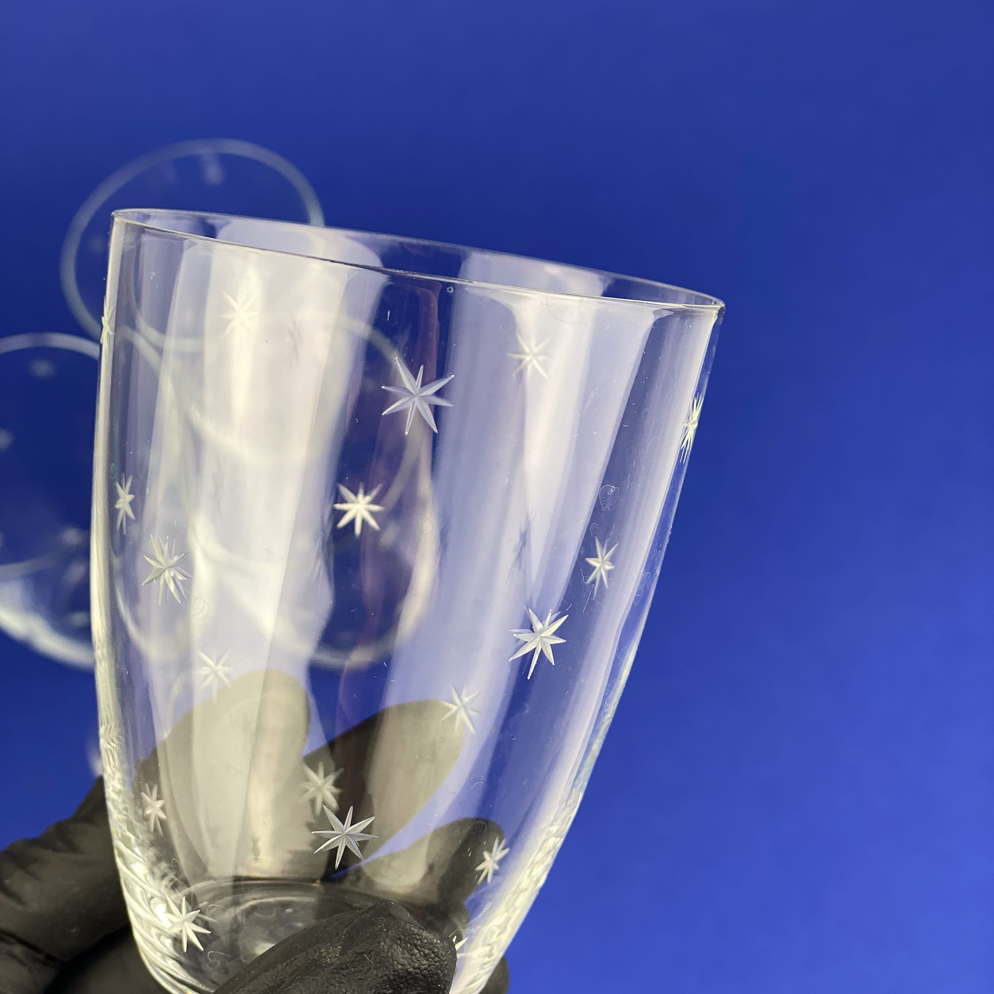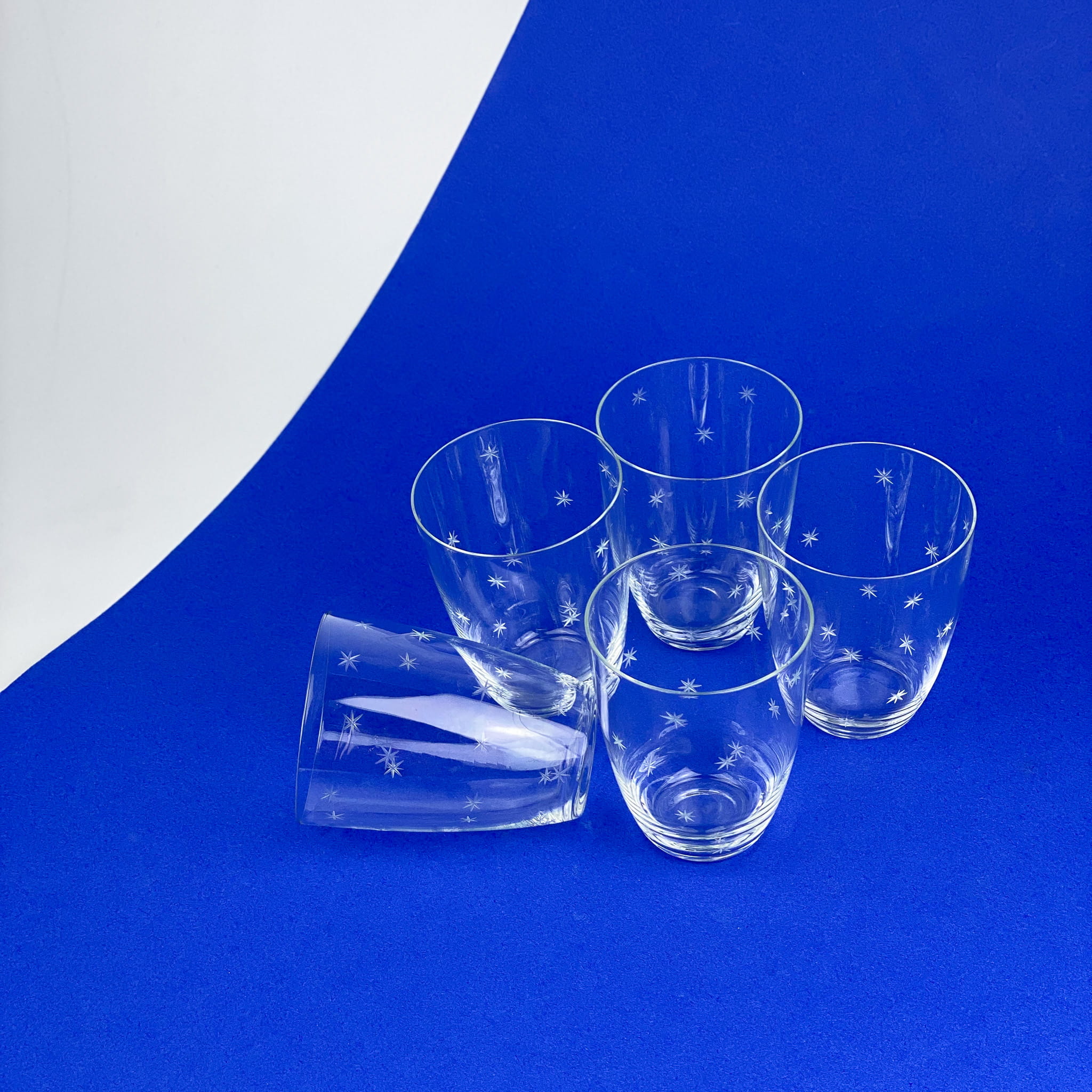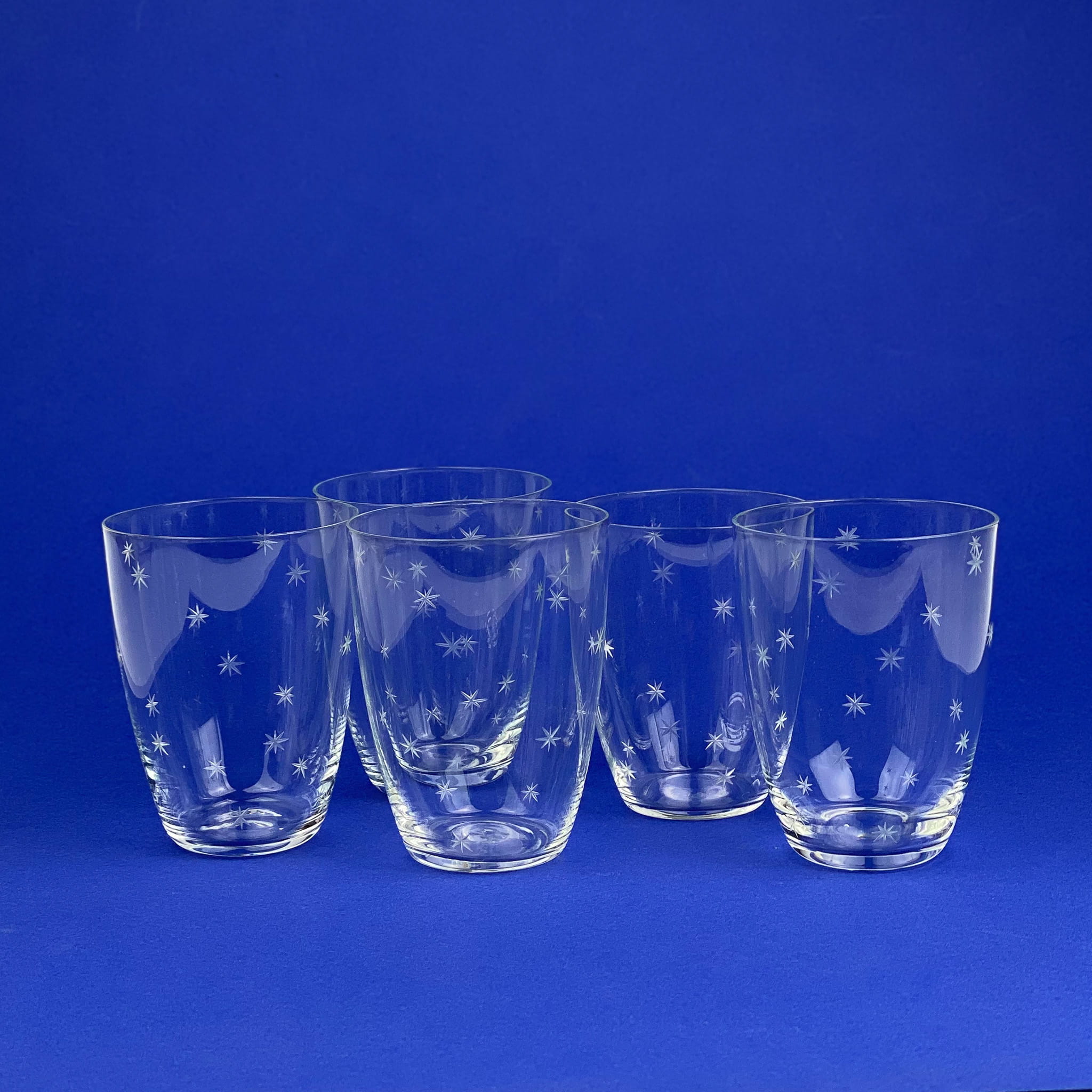 Szklanki z subtelnym szlifem w kształcie gwiazdek. Piękne, stare, ręczna robota, widać że nie takie badziewie jak teraz. Podejrzewam, że szkło kryształowe. Nie mają żadnych uszczerbków, jedna jest niższa od czterech pozostałych ale takie już uroki ręcznych wyrobów. Cudne! / średnica: 7 cm / wysokość: 10 cm / pojemność: 225 ml / 190 zł za komplet pięciu