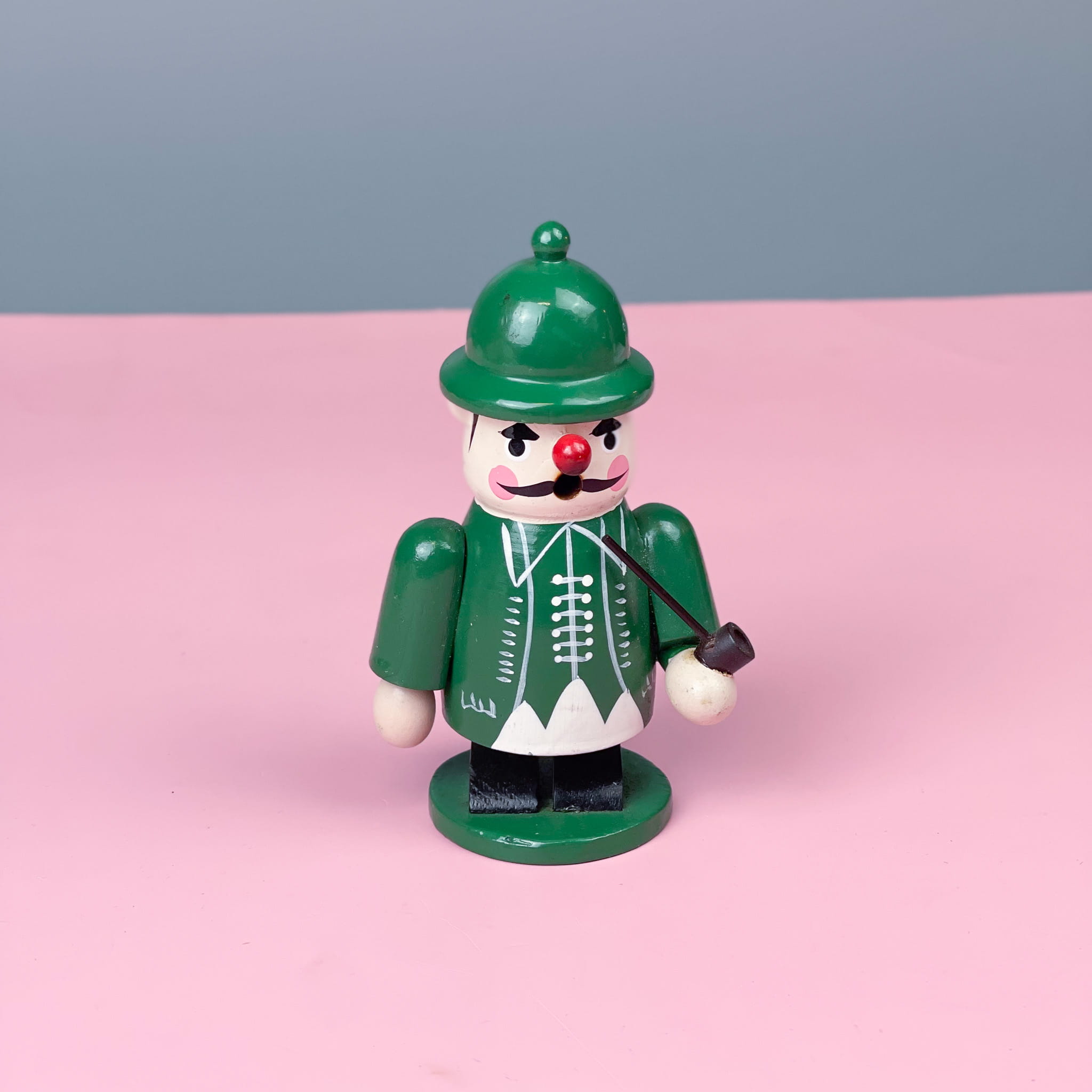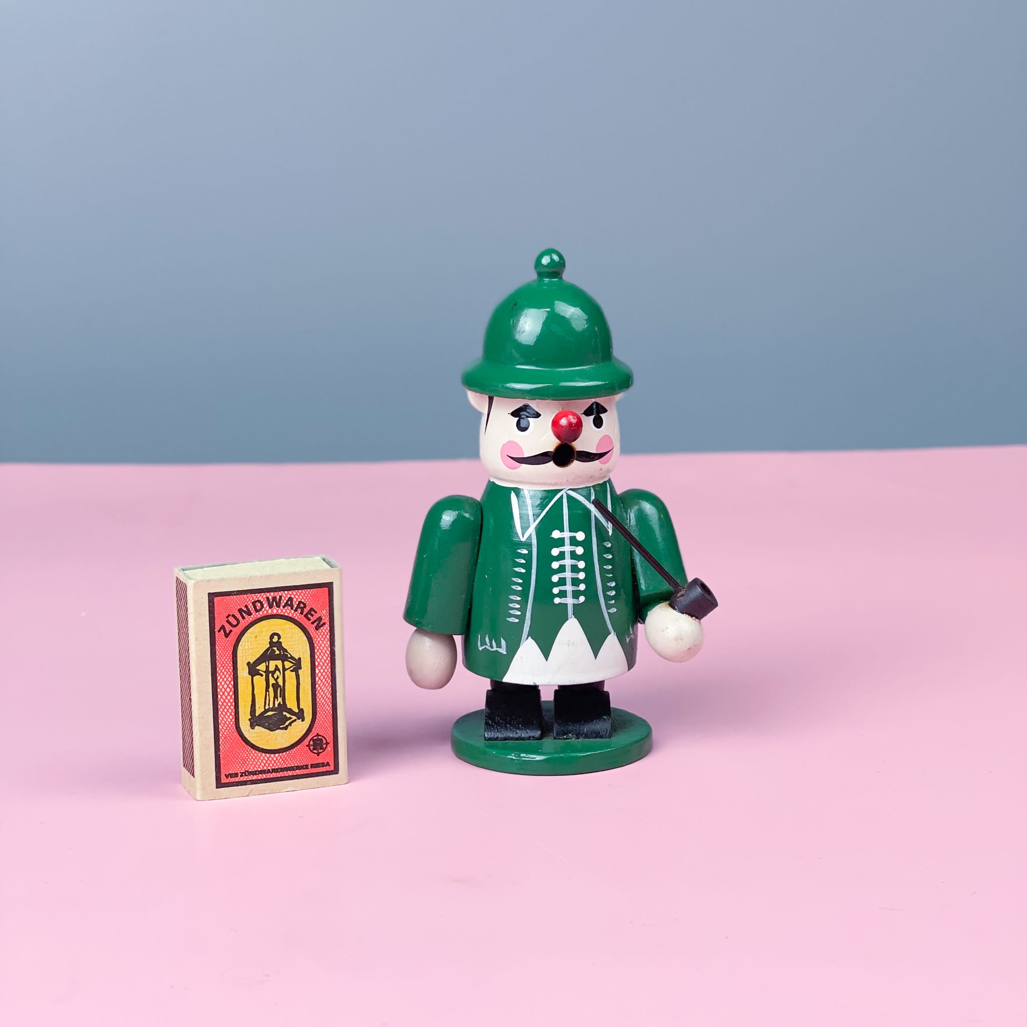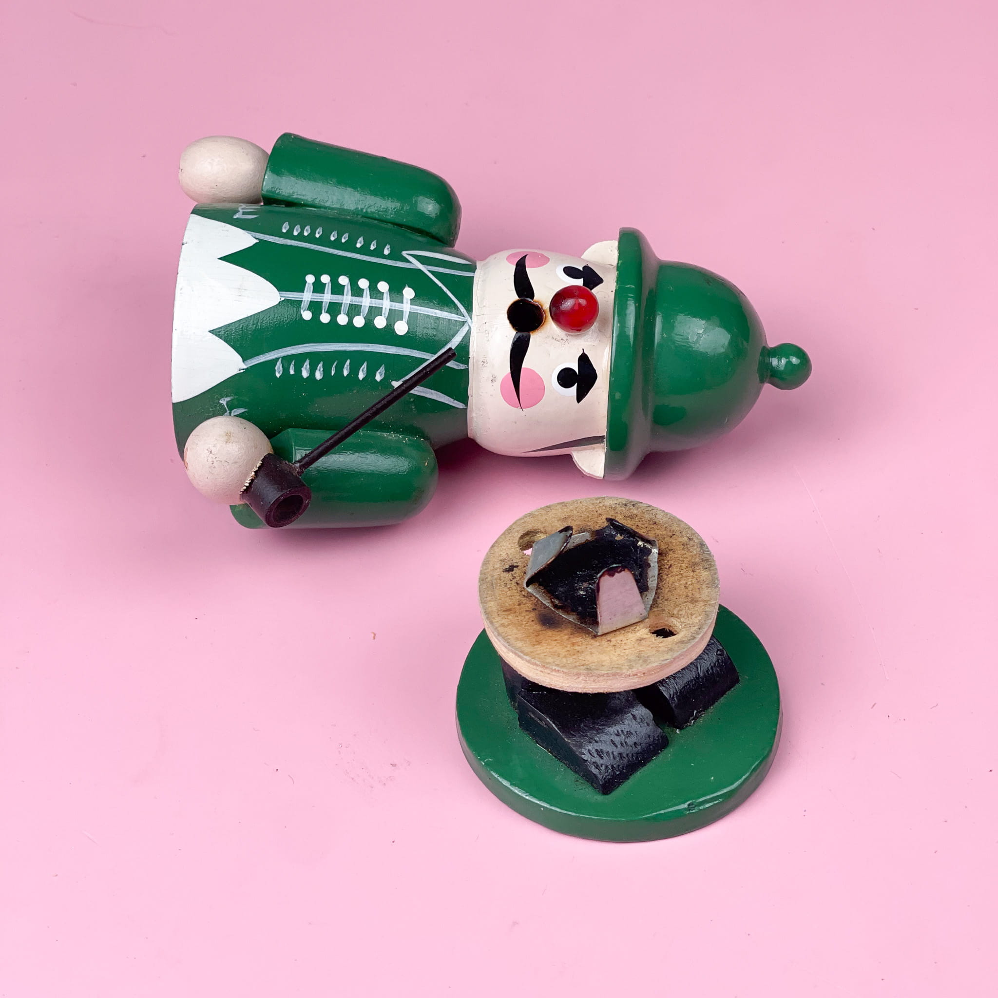 Świąteczna ozdoba, figurka górnika, która się otwiera, do środka wkładamy zapalone kadzidełko stożkowe, zamykamy i dziadek wygląda jakby pykał fajeczkę bo z buzi leci mu dymek. Klasyczna ręcznie robiona figurka świąteczna z rejonu Rudaw, ta z lat 80., używana ale w bardzo dobrym stanie / wysokość: 13 cm / średnica podstawy: 5 cm