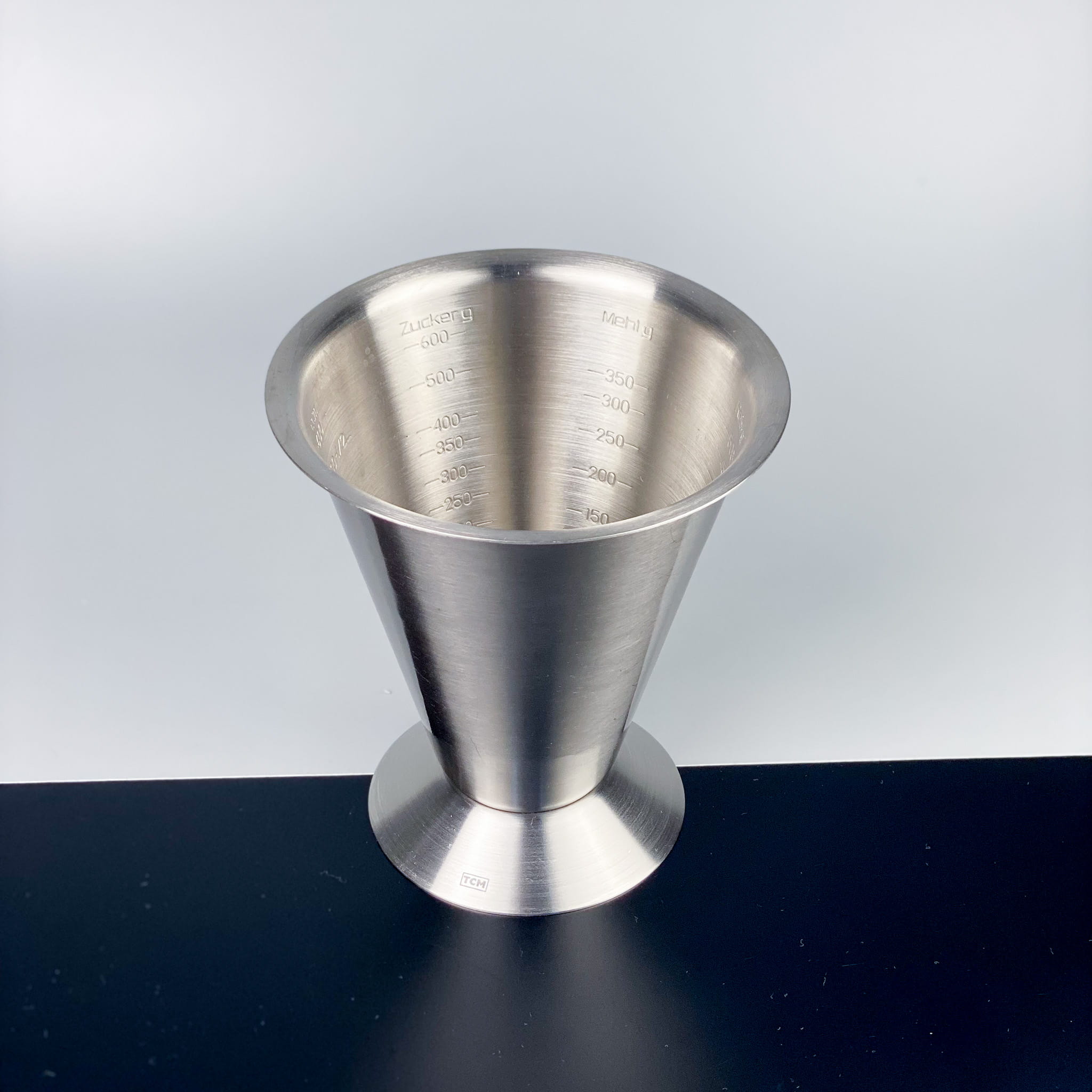 Miarka ze stali nierdzewnej, podziałka na mąkę, cukier, kakao i drobną kaszę. Stan praktycznie idealny / średnica górna: 13,5 cm / wysokość: 15 cm