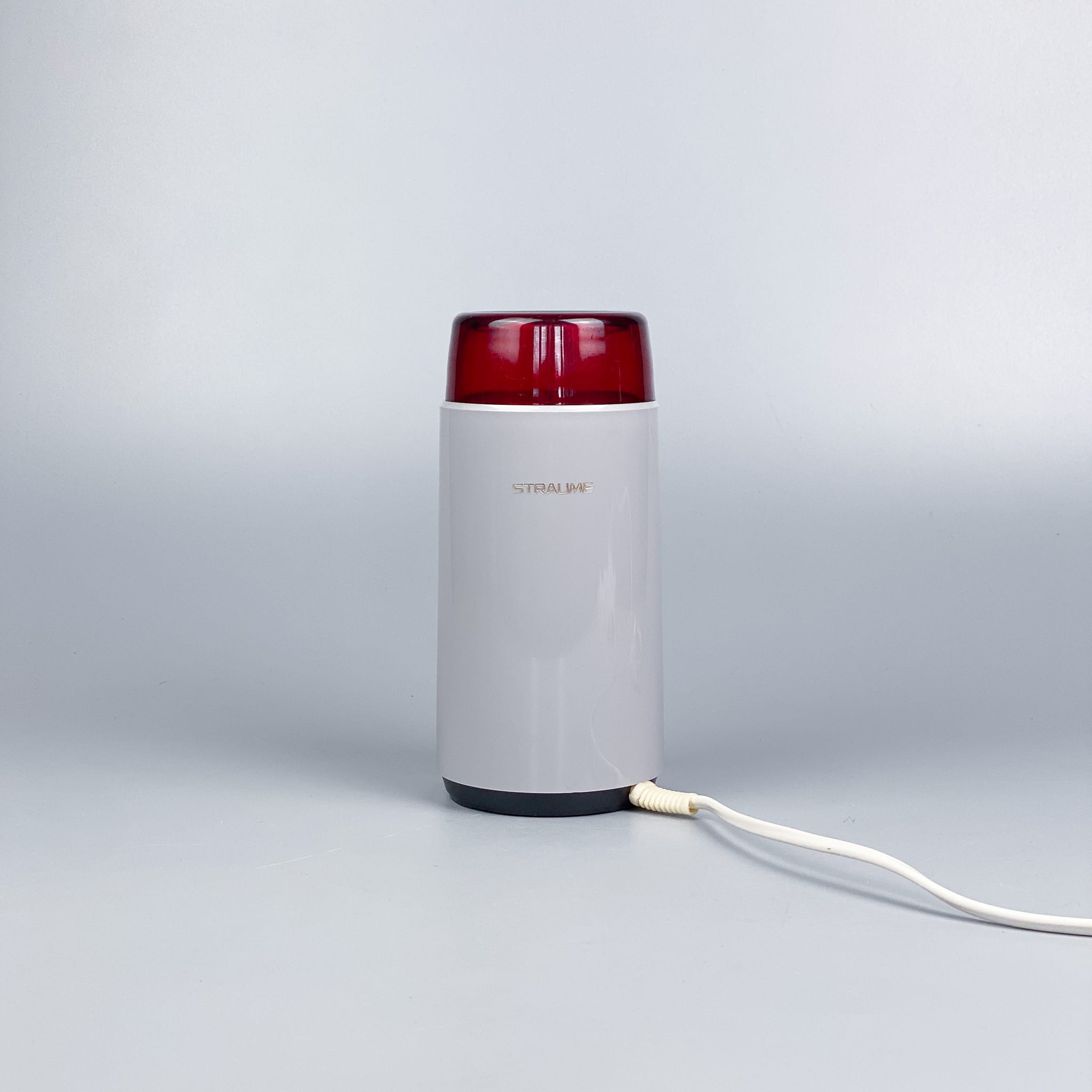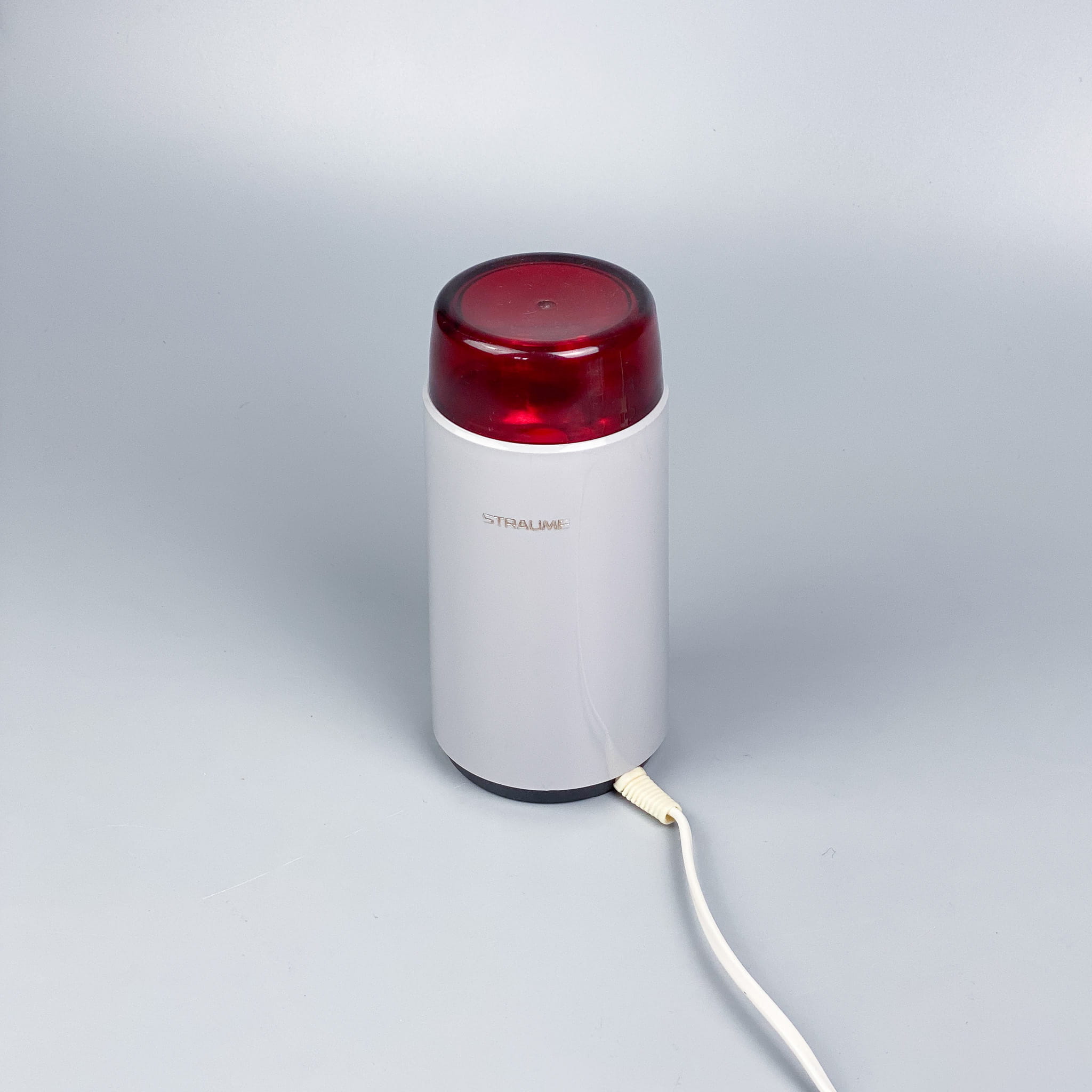 Szary młynek STRAUME z półprzeźroczystą ciemnoczerwoną przykrywką – klasyczny radziecki młynek udarowy z lat 70.–80., popularny w polskich domach w okresie PRL. Wyposażony w solidny silnik i stalowy mechanizm mielący, dedykowany do mielenia kawy, cukru pudru czy przypraw. Obudowa wykonana z tworzywa sztucznego. Prosty w obsłudze, trwały i niezawodny. Ten w wyjątkowym stanie.