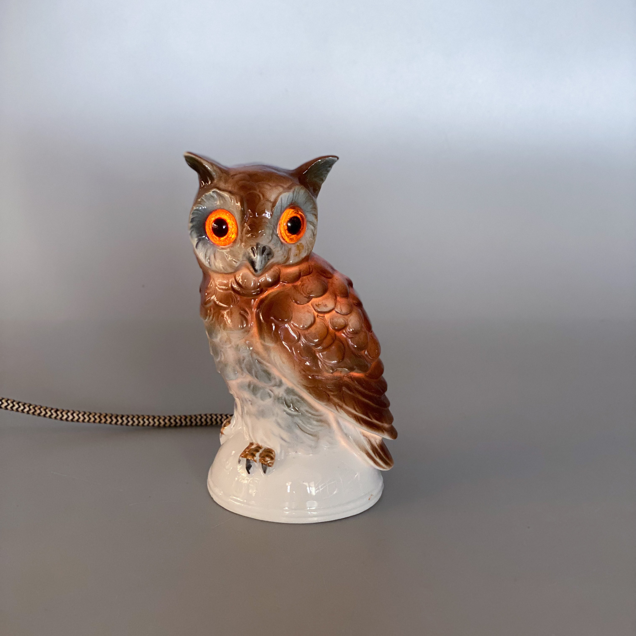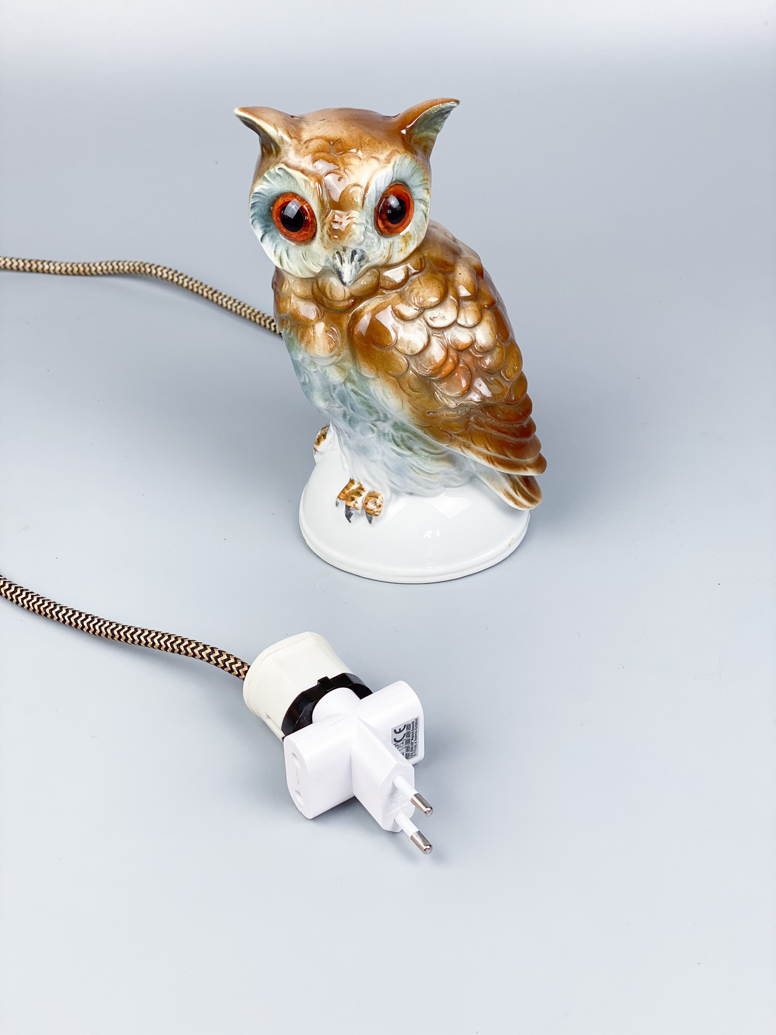 Zabytkowa niemiecka porcelanowa lampa perfumowa w kształcie sowy, znana również jako „Rauchverzehrer” lub „połykacz” dymu. Oprócz tego że świeci to można do niej wlać olejek zapachowy i ciepło żarówki wyzwala zapach jak w kominku zapachowym. Ten konkretny egzemplarz pochodzi z fabryki porcelany Carl Scheidig KG, sygnowany orłem z inicjałami CS i napisem „Germany”. Sygnatura była używana w latach 1935-1972. Jest w idealnym stanie. / 10 cm x 10 cm / wysokość: 16 cm