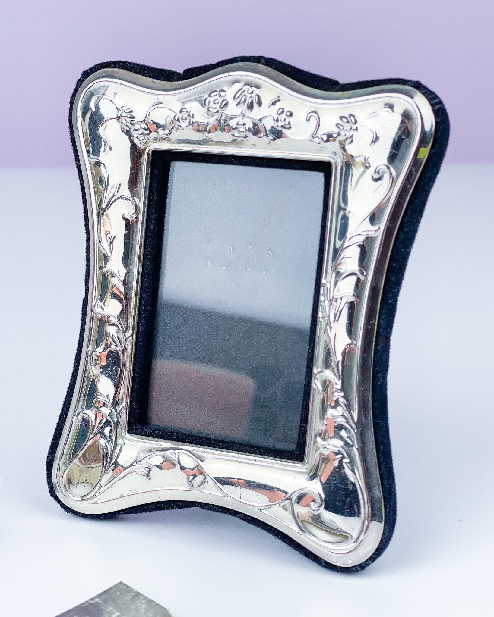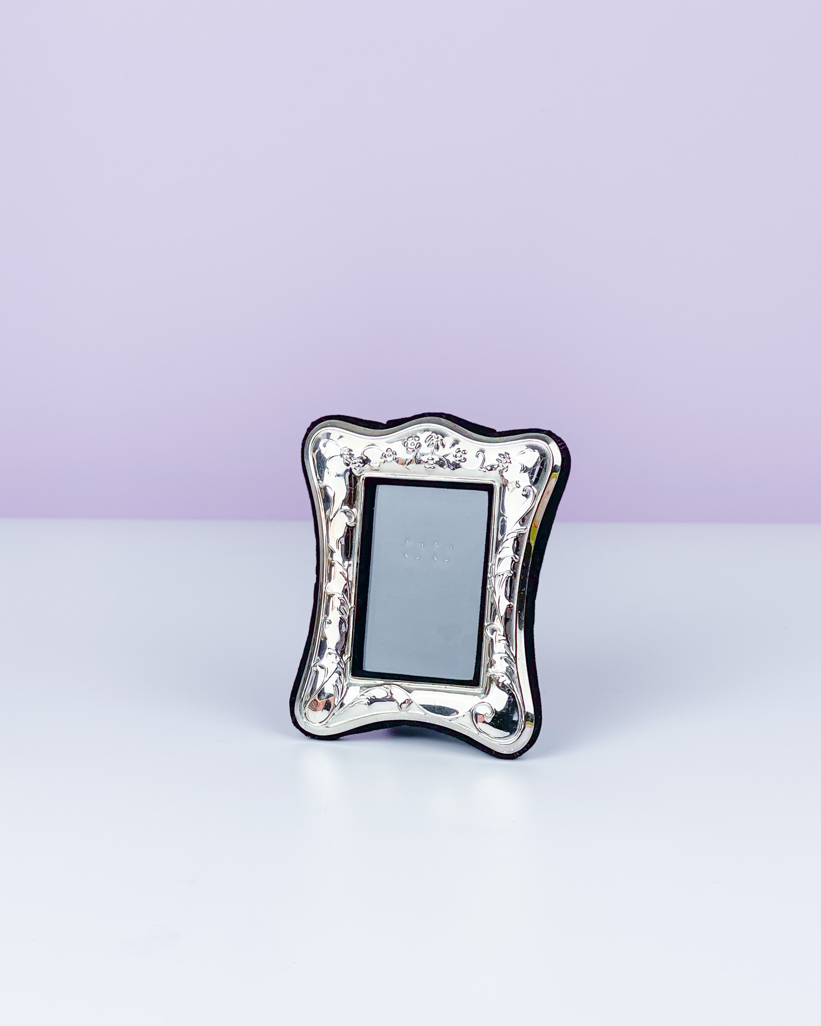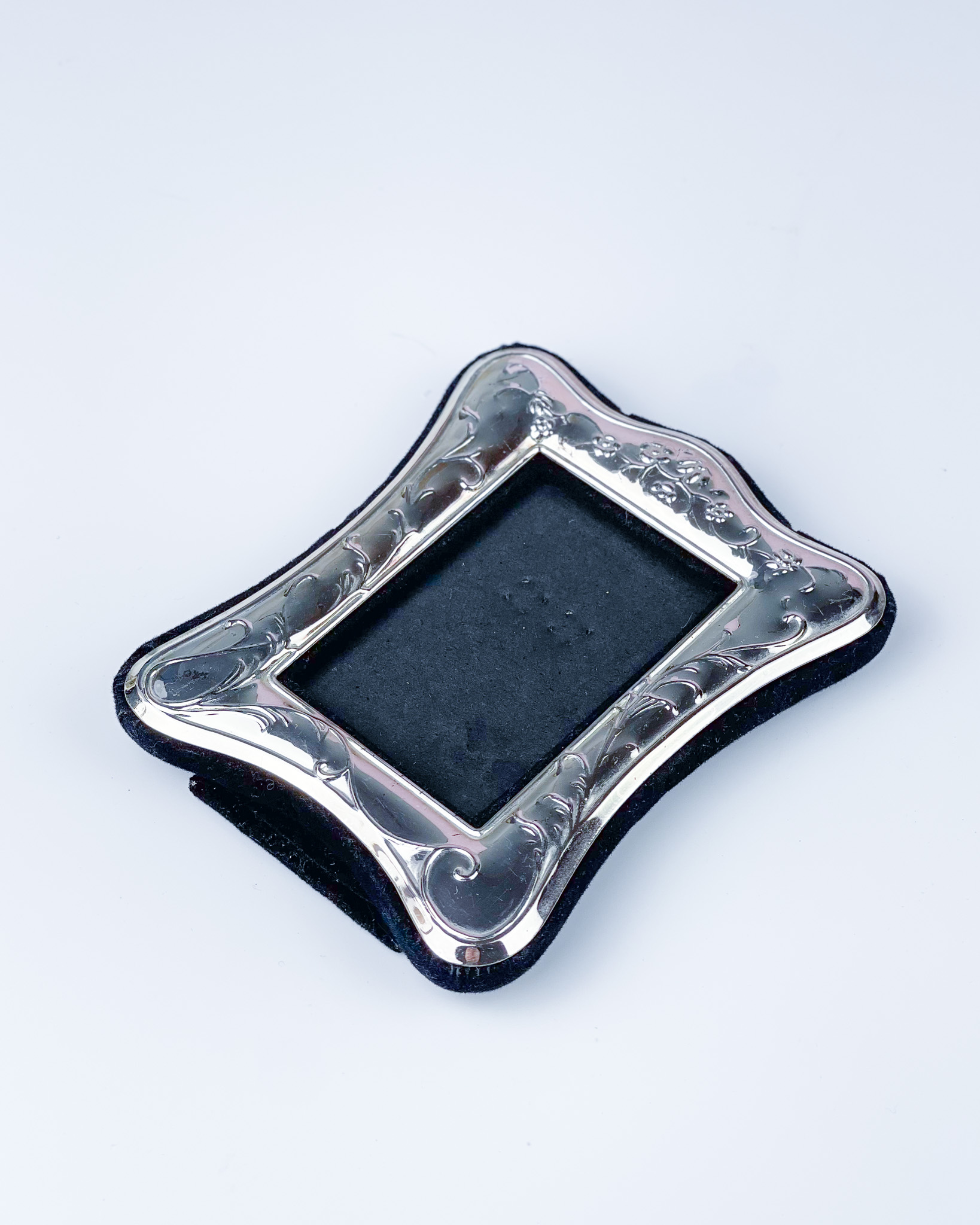 Metalowa posrebrzana rameczka z zaokrąglonymi krawędziami i ozdobną, repusowaną bordiurą z motywem kwiatowym. Tył obity aksamitem. Otwór na obraz ma wymiary 8 cm x 5,5 cm / wymiary zewnętrzne: 11 cm x 9,5 cm / otwór w którym widać będzie zdjęcie/grafikę: 6,5 x 4 cm / 145 zł