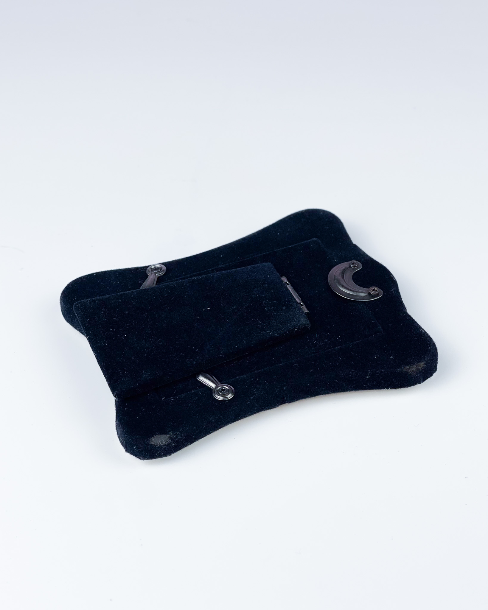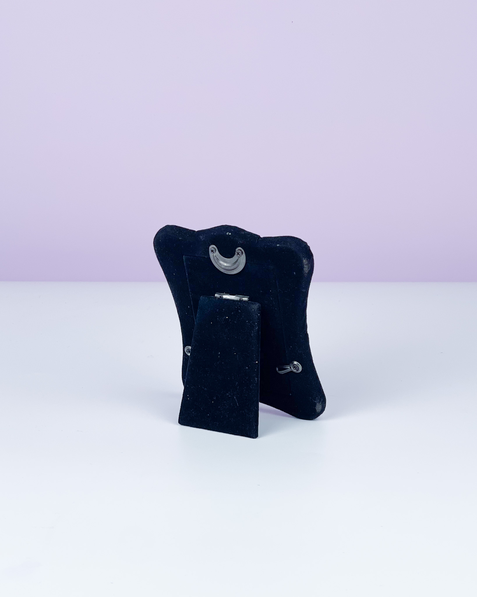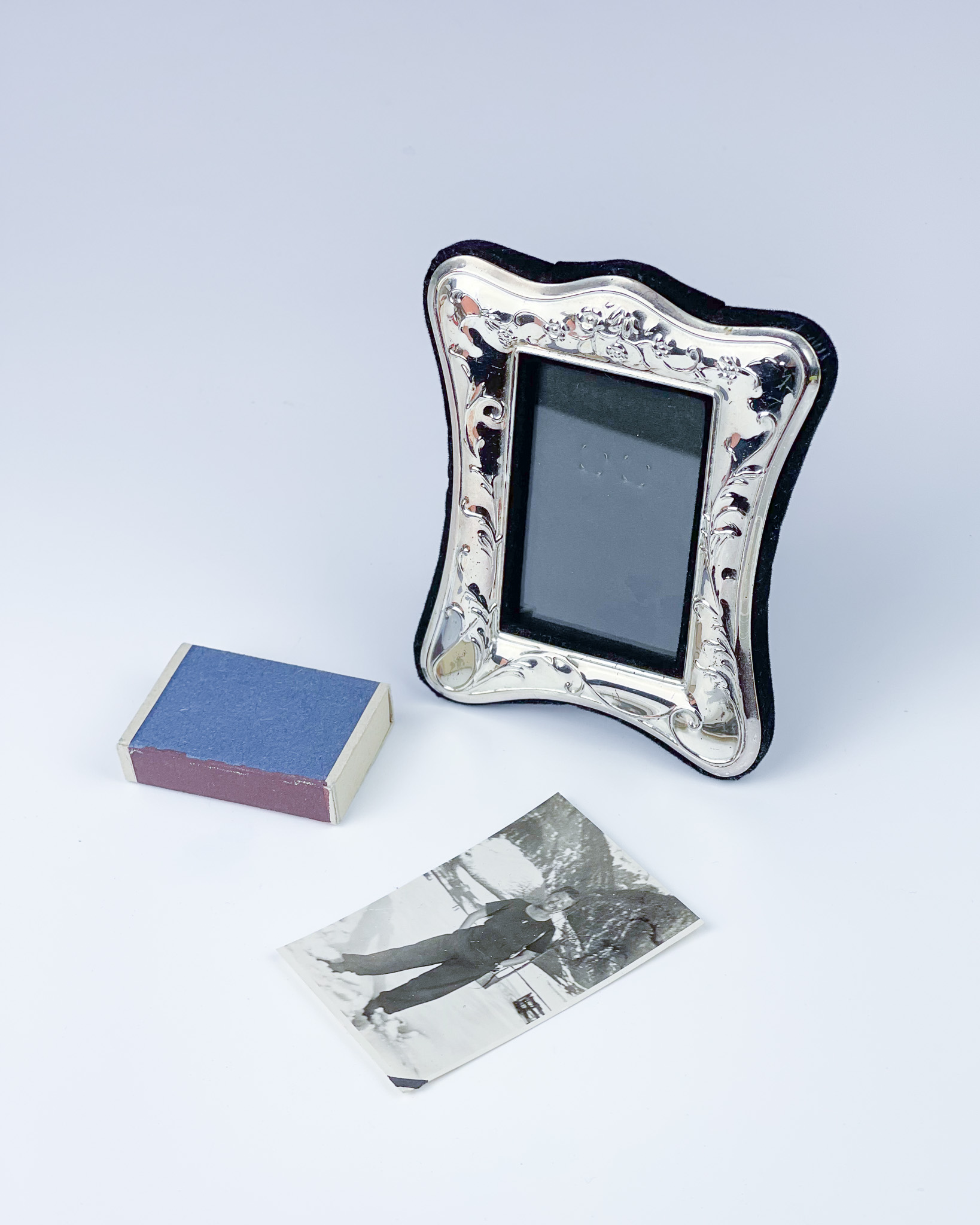 Metalowa posrebrzana rameczka z zaokrąglonymi krawędziami i ozdobną, repusowaną bordiurą z motywem kwiatowym. Tył obity aksamitem. Otwór na obraz ma wymiary 8 cm x 5,5 cm / wymiary zewnętrzne: 11 cm x 9,5 cm / otwór w którym widać będzie zdjęcie/grafikę: 6,5 x 4 cm / 145 zł
