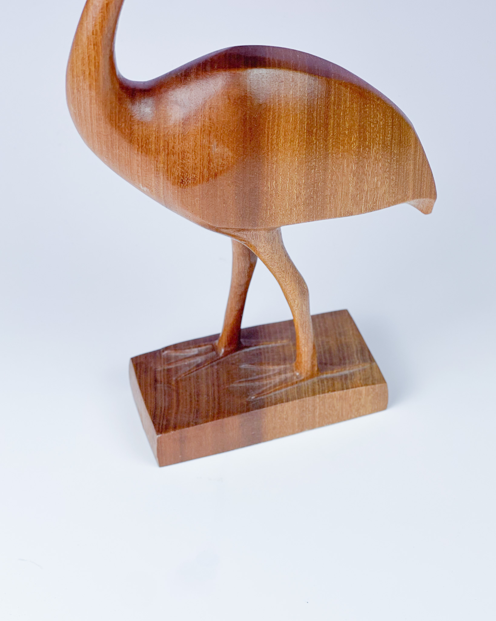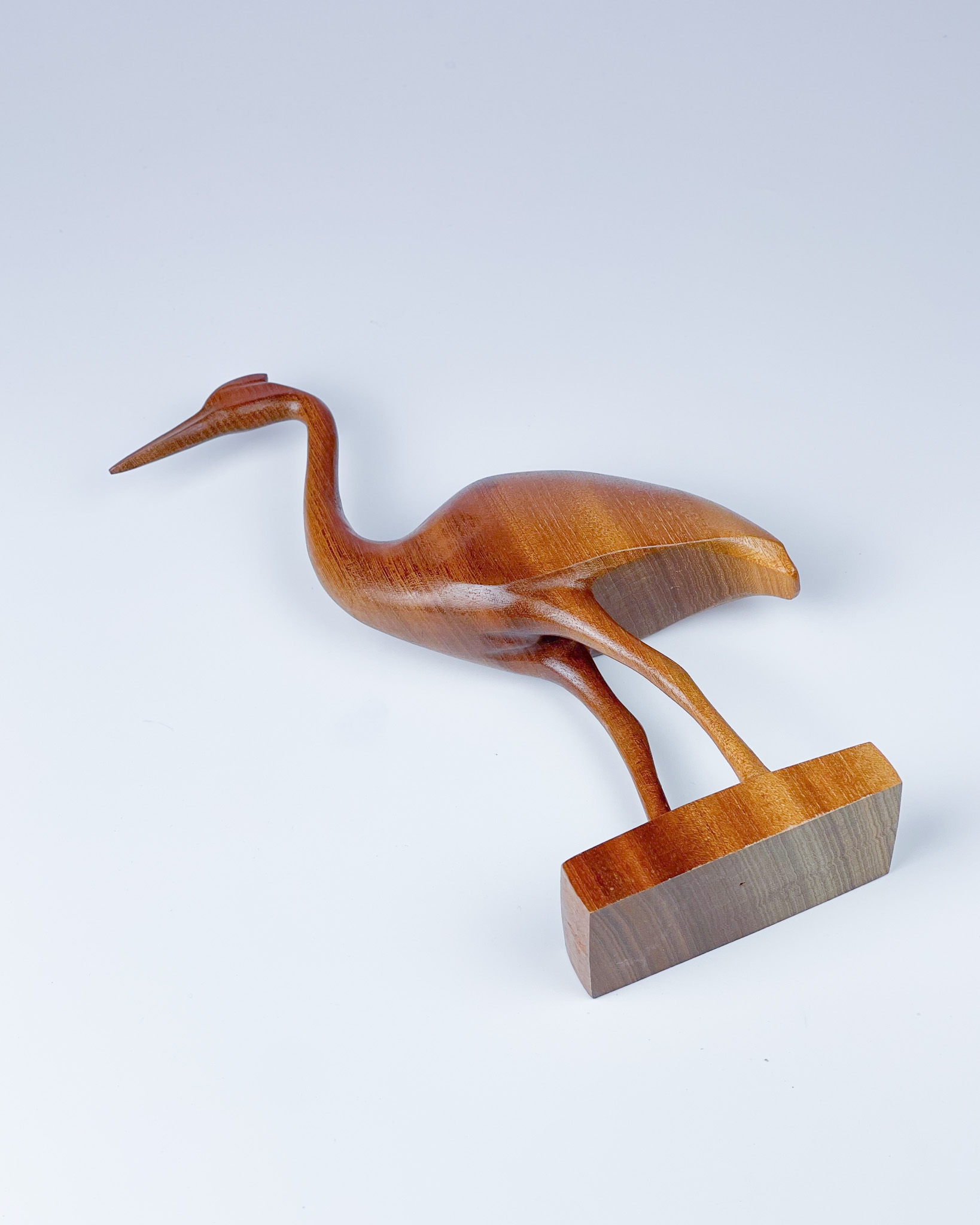 Delikatna rzeźba żurawia z pięknego kawałka litego drewna egzotycznego, mid-century, minimalistyczna, elegancka i pięknie wykonana. Oczywiście ręcznie. Vintage z lat 70. conajmniej / podstawa: 9,5 x 4,5 cm / wysokość: 25 cm / długość: 18 cm / 230 zł