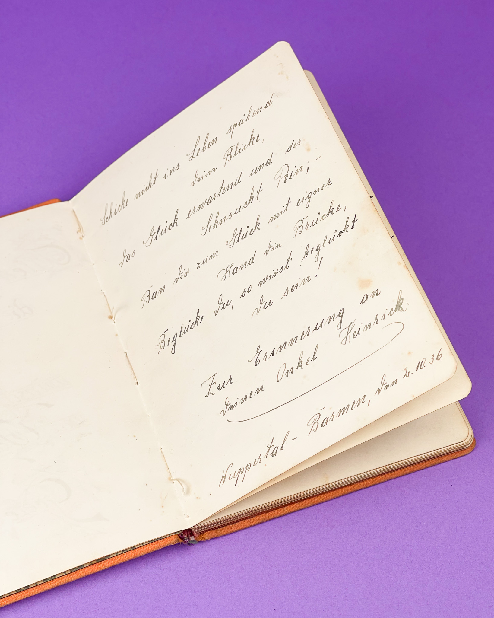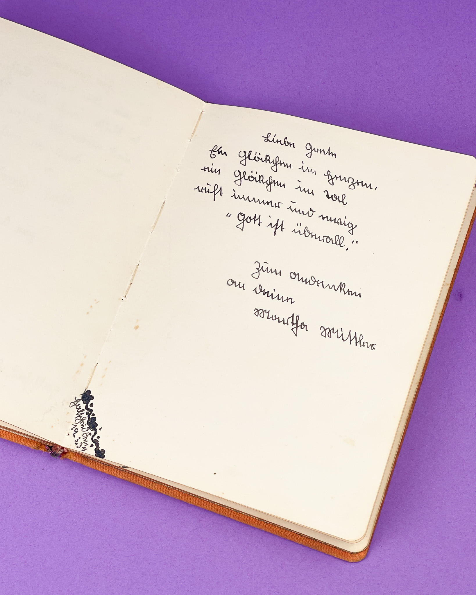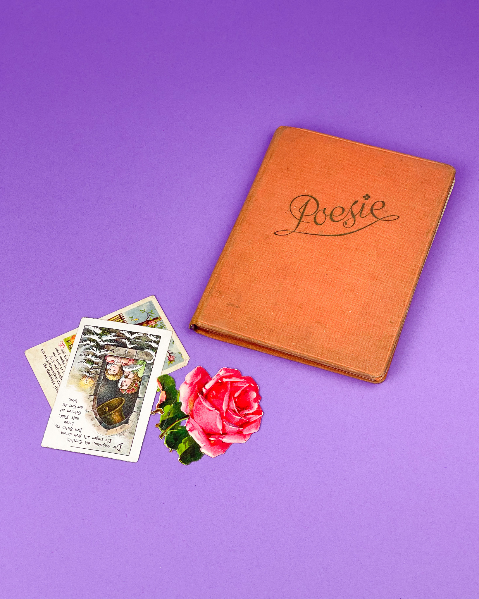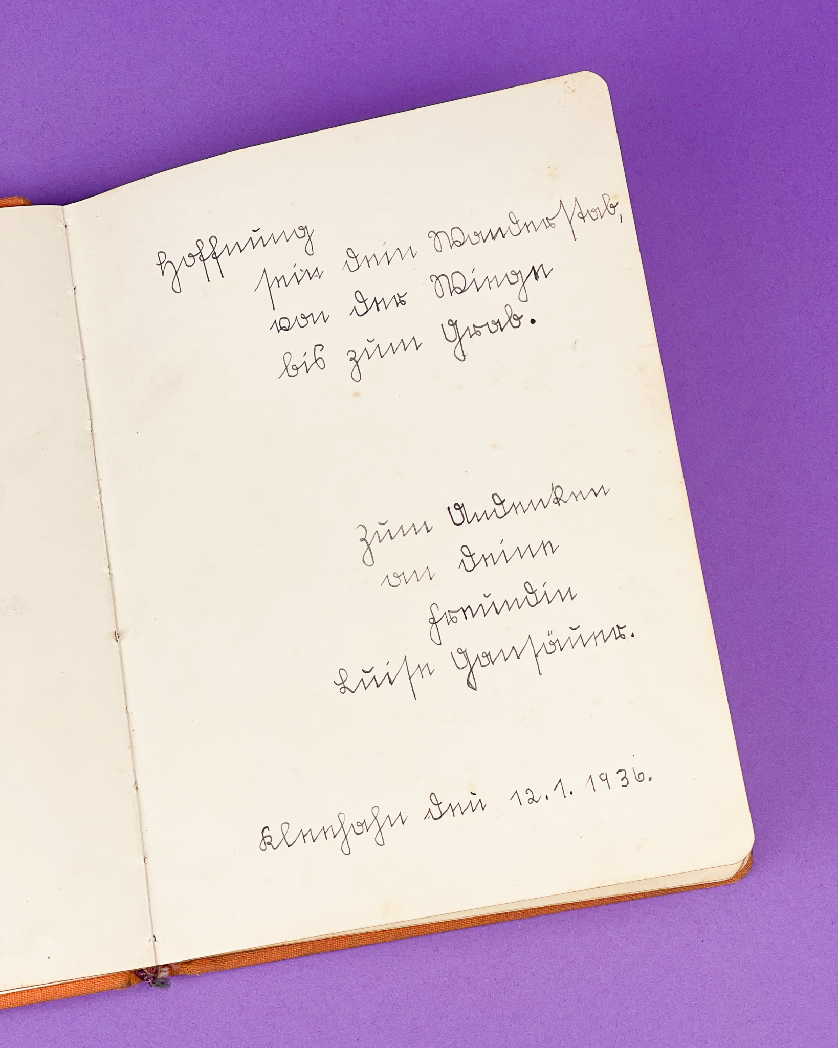 Stary pamiętnik z lat 30. z wpisami przyjaciół Ten zeszyt! Te kroje pisma! Te wycięte róże! / 18 x 13 cm / 70 zł