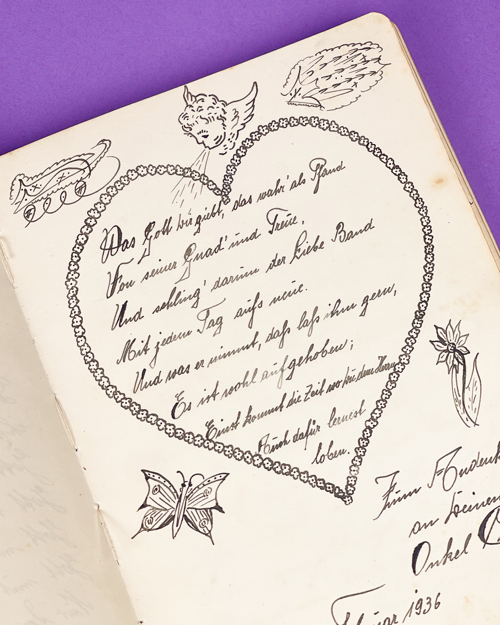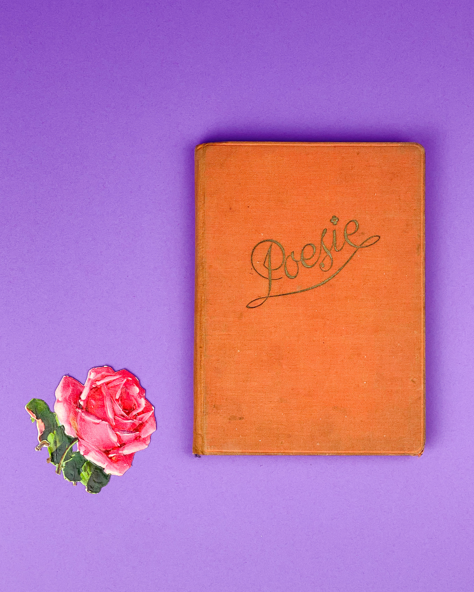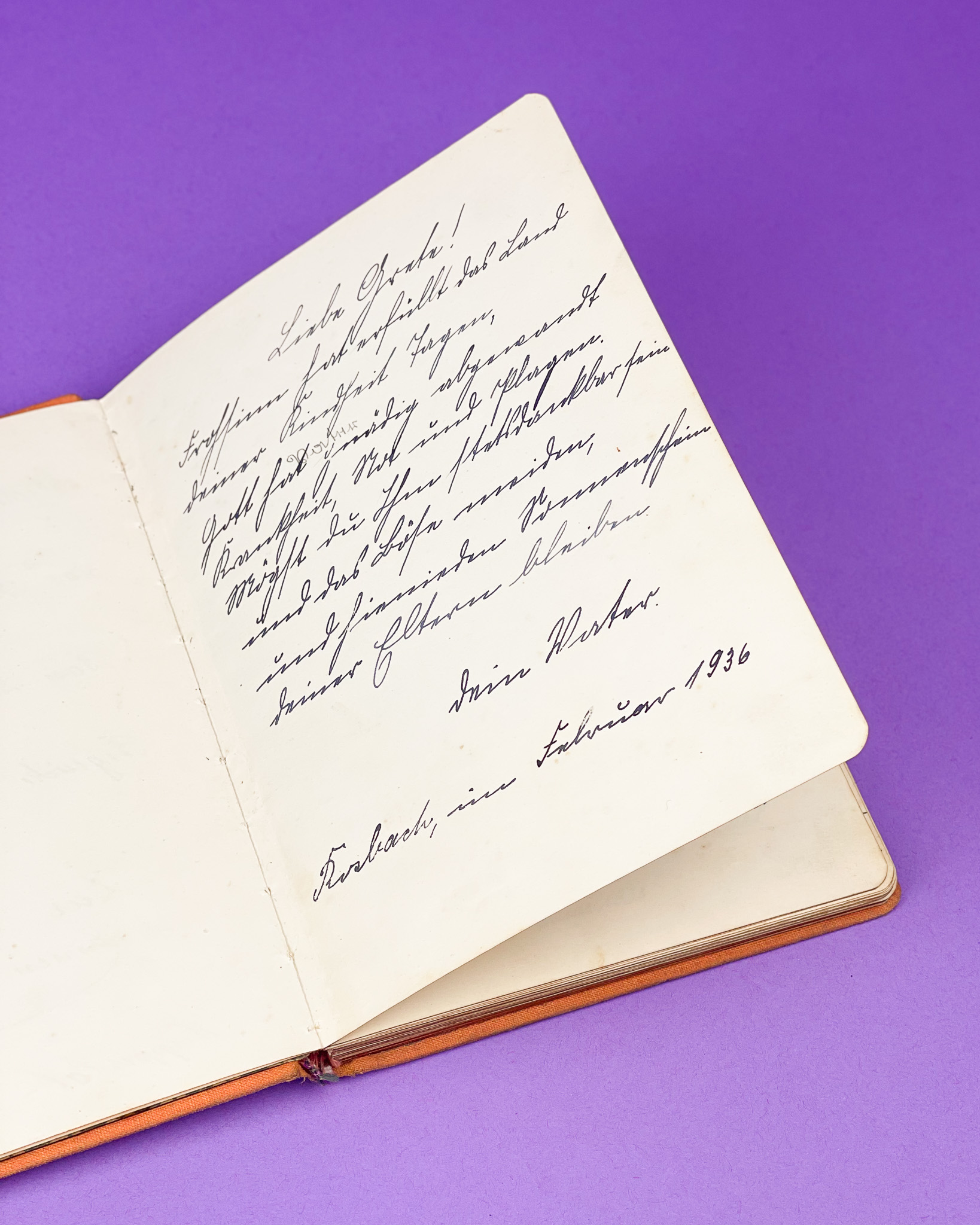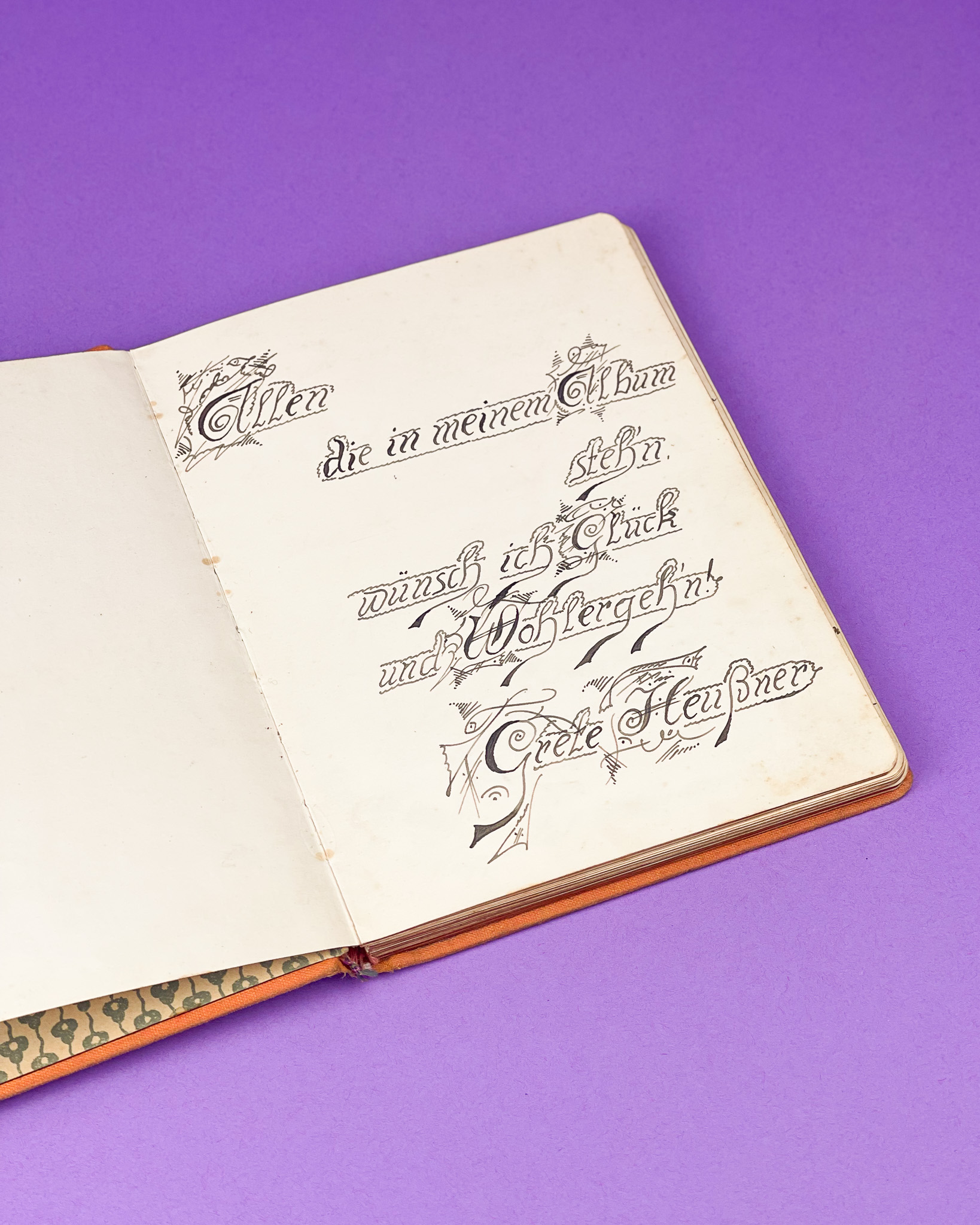 Stary pamiętnik z lat 30. z wpisami przyjaciół Ten zeszyt! Te kroje pisma! Te wycięte róże! / 18 x 13 cm / 70 zł
