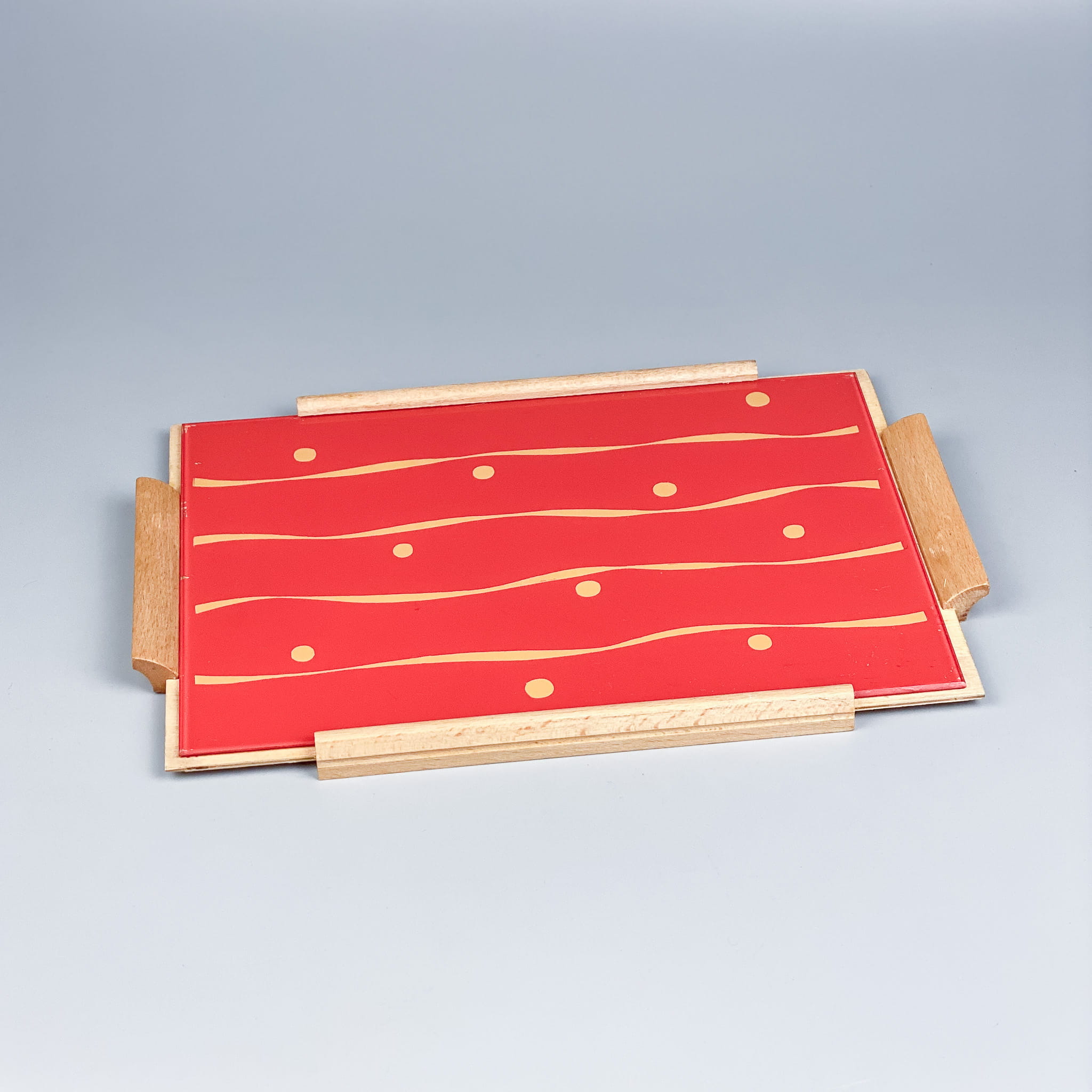 Słodka tacka (na drineczki!), drewno plus malowane szkło (malatura jest pod spodem). Lata 60. moim zdaniem, ma jeszcze fragment naklejki - wykonana w wytwórni luster w Gorlitz. Stan zachowania bardzo dobry jak na swój wiek ale ma drobne niedoskonałości - minimalne ubytki farby w okolicy narożników / 34 x 21,5 cm / 60 zł