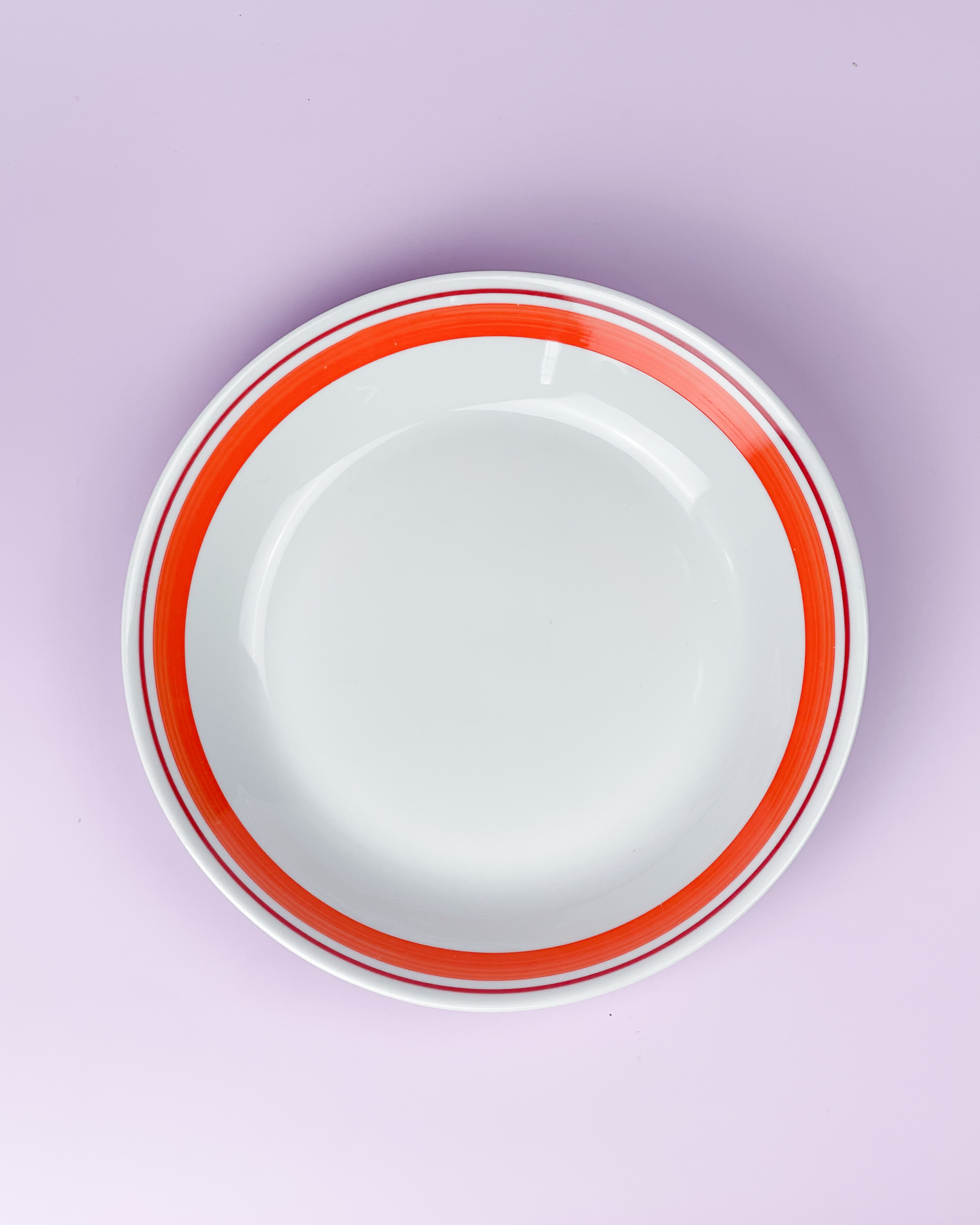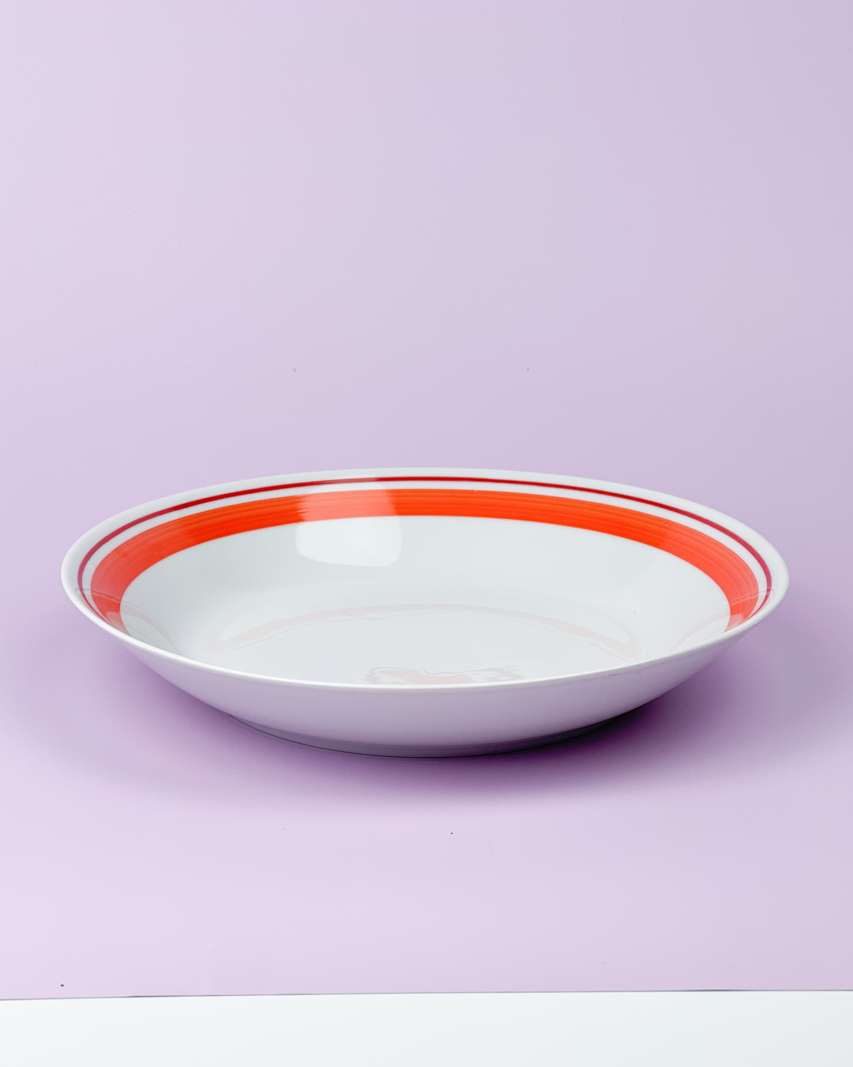 Półgłęboki talerz z pięknymi paskami - jednym cienkim czerwonym i drugim pomarańczowym z widocznym śladem pędzla. No super jest, robi kolorystycznie robotę na stole / paski naszkliwne / średnica: 22 cm / 23 zl