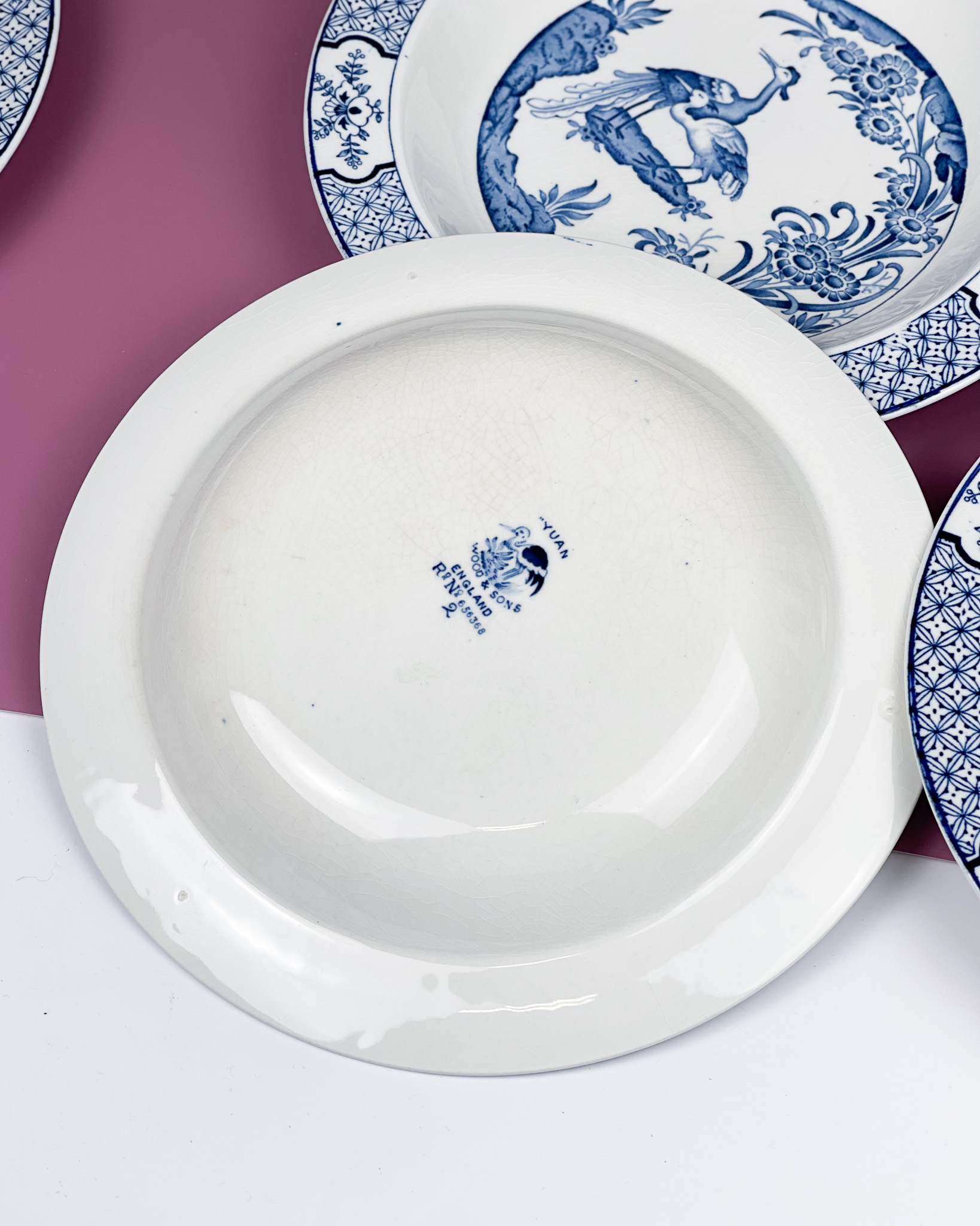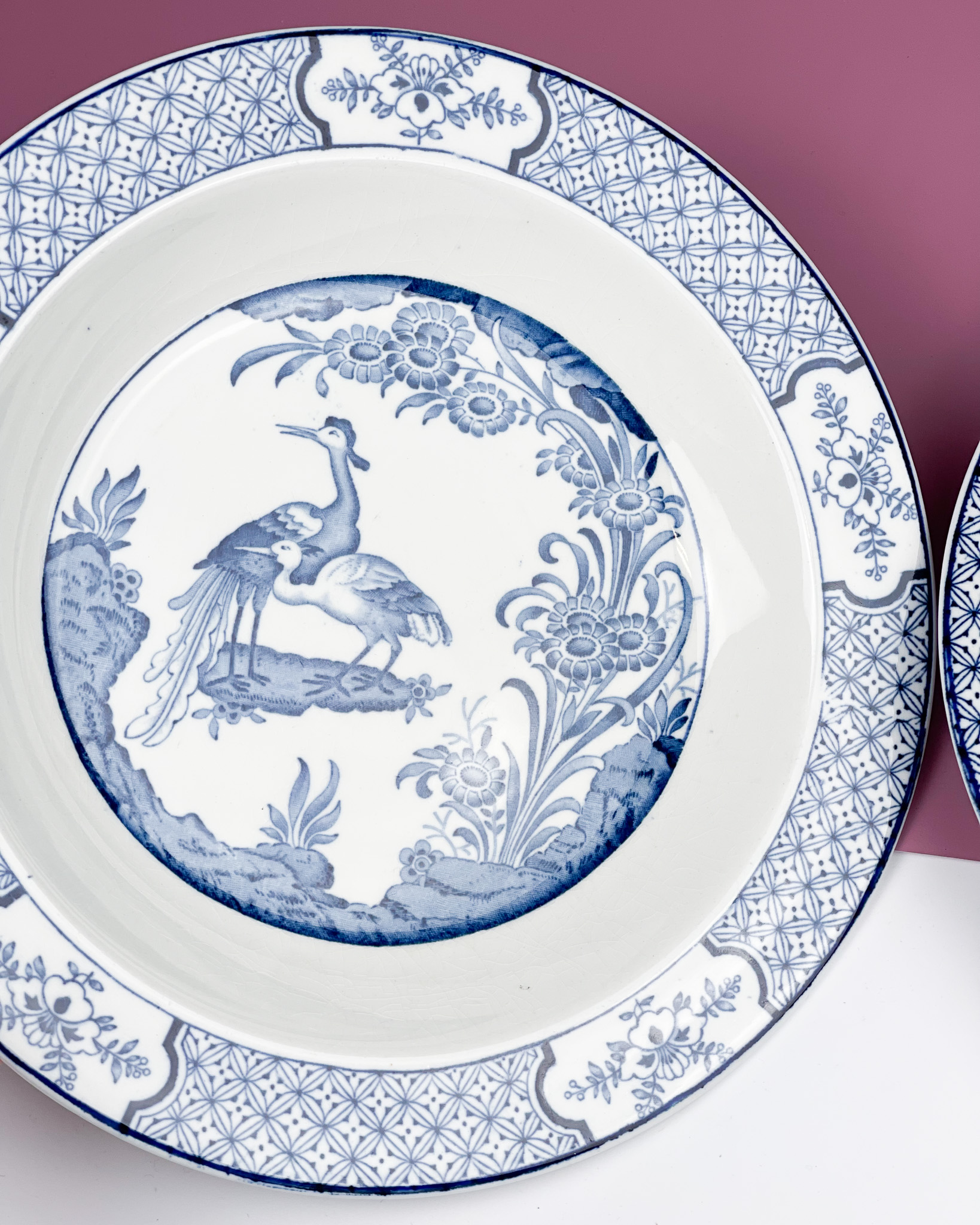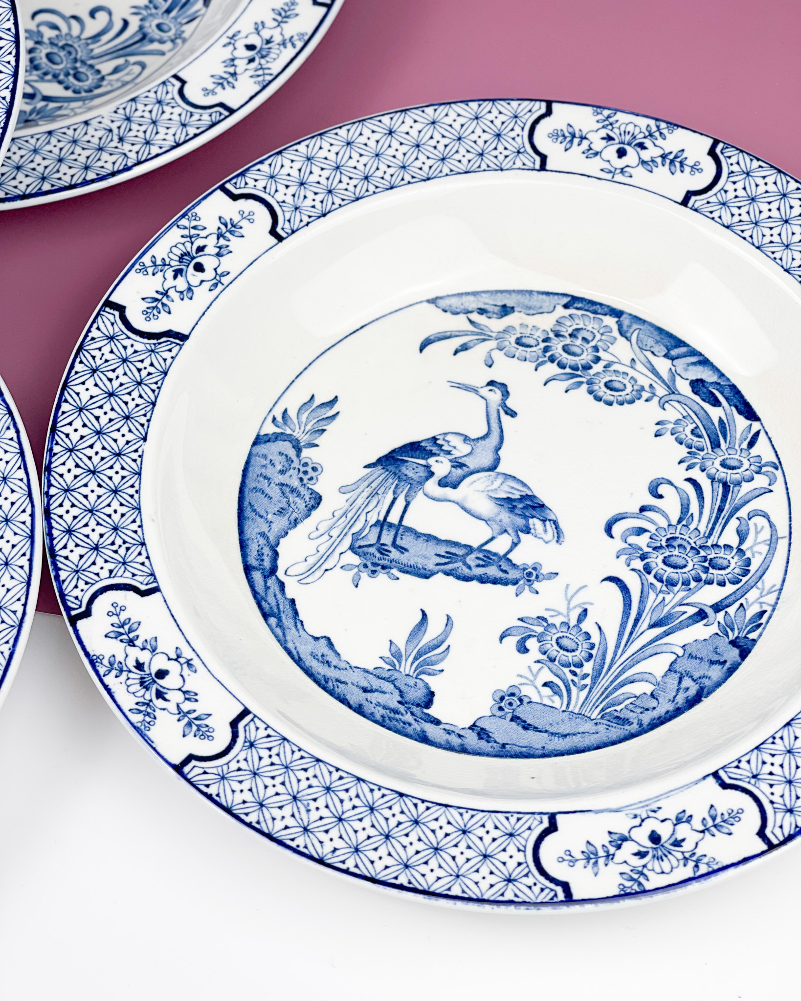 Oryginalne talerze obiadowe półgłębokie (salad plate) Wood & Sons of England z motywem żurawia w stylu chinoiserie, otoczony rzadką japońską geometryczną obwódką z liści konopi (asanoha). Wzór ten powstał w okresie tuż po II wojnie światowej, w okresie angielskiego boomu eksportowego, poszukiwany przez kolekcjonerów. Talerze są w bardzo dobrym stanie - mają jedynie delikatne przebarwienia - wszystko jest na zdjęciach, każda sztuka jest sfotografowana / średnica: 23 cm / komplet 5-ciu sztuk: 350 zł (70 zł za sztukę)