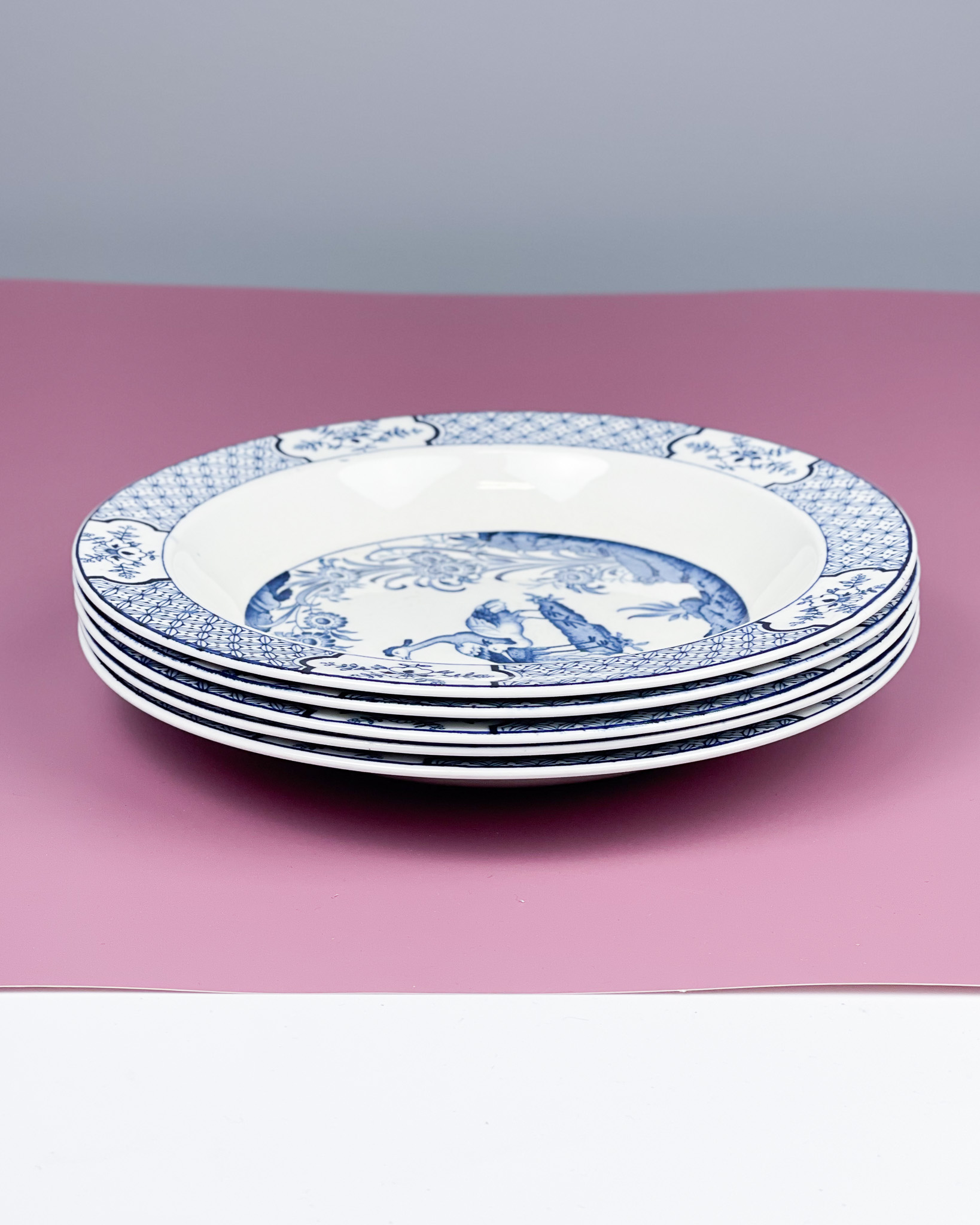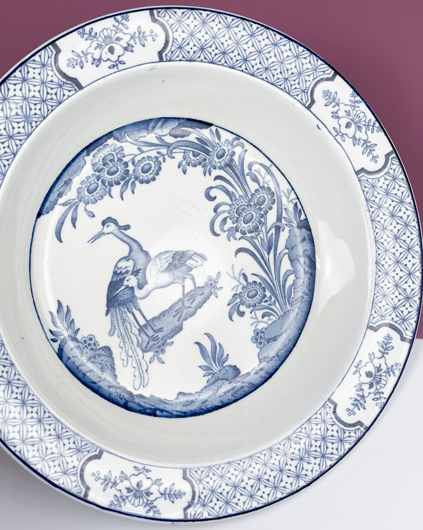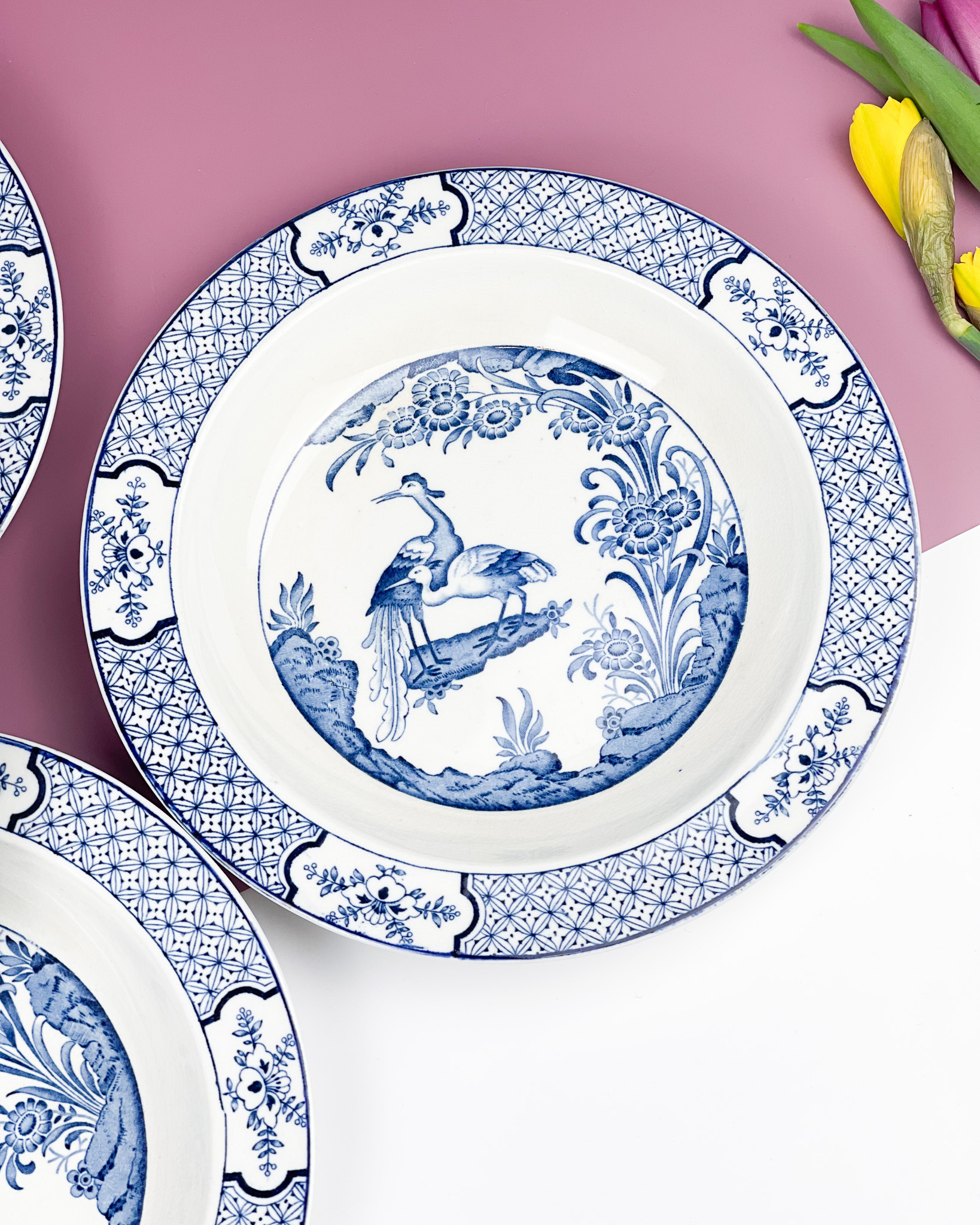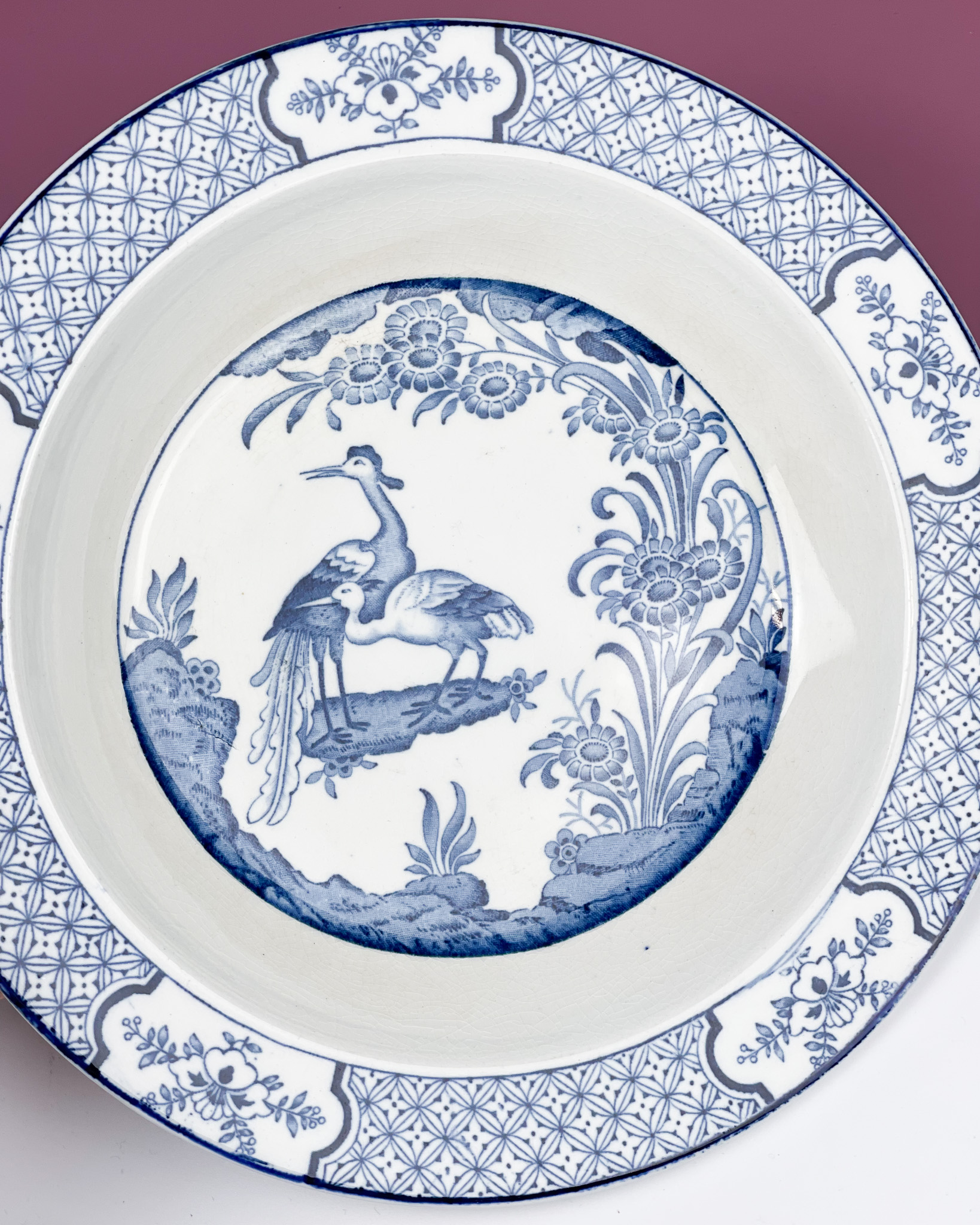 Oryginalne talerze obiadowe półgłębokie (salad plate) Wood & Sons of England z motywem żurawia w stylu chinoiserie, otoczony rzadką japońską geometryczną obwódką z liści konopi (asanoha). Wzór ten powstał w okresie tuż po II wojnie światowej, w okresie angielskiego boomu eksportowego, poszukiwany przez kolekcjonerów. Talerze są w bardzo dobrym stanie - mają jedynie delikatne przebarwienia - wszystko jest na zdjęciach, każda sztuka jest sfotografowana / średnica: 23 cm / komplet 5-ciu sztuk: 350 zł (70 zł za sztukę)