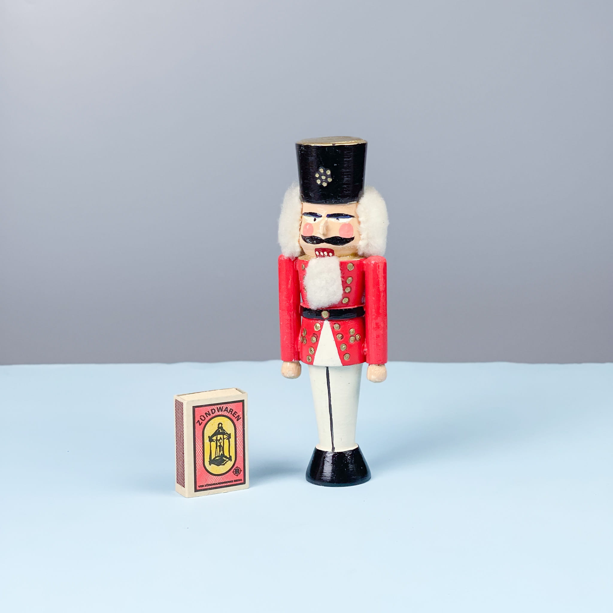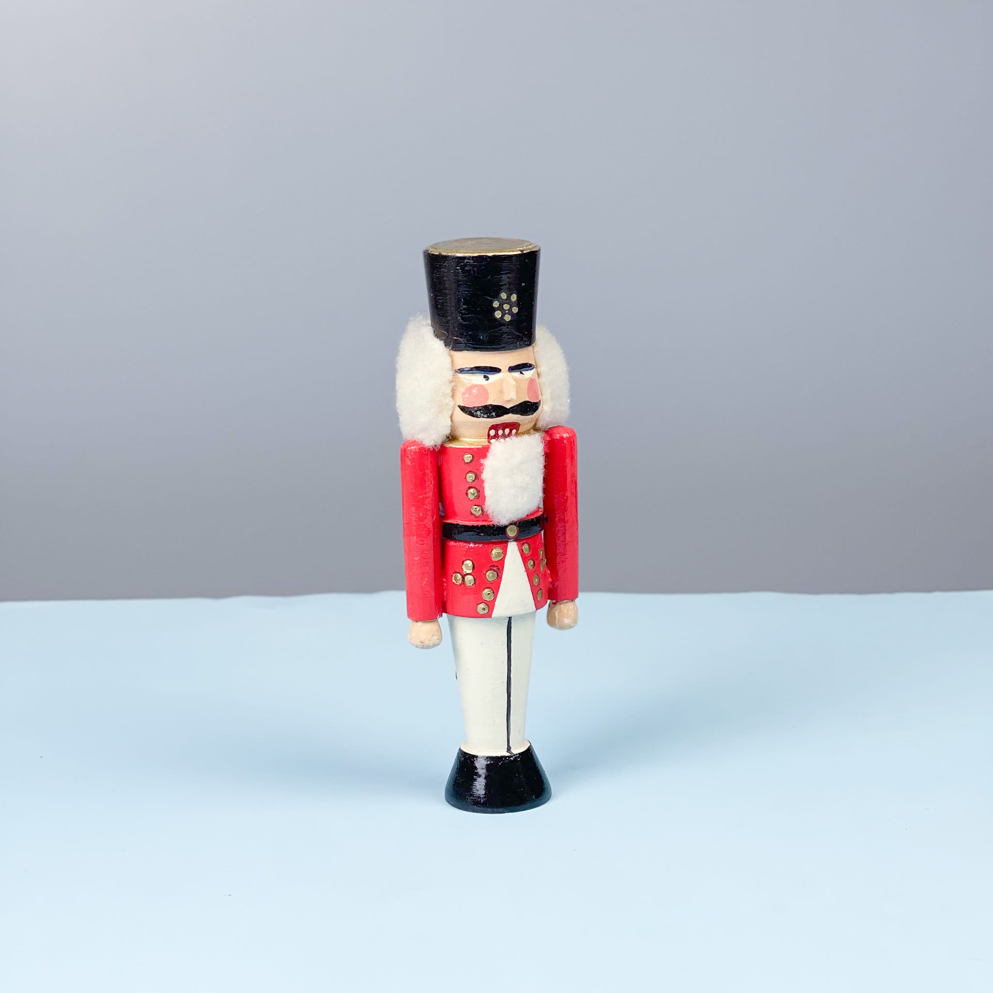 Zabytkowy dziadek do orzechów. Pochodzi z niemieckich Rudaw słynących z wyrobu drewnianych świątecznych zabawek / posiada ruchomy mechanizm / wysokość: 18,5 cm