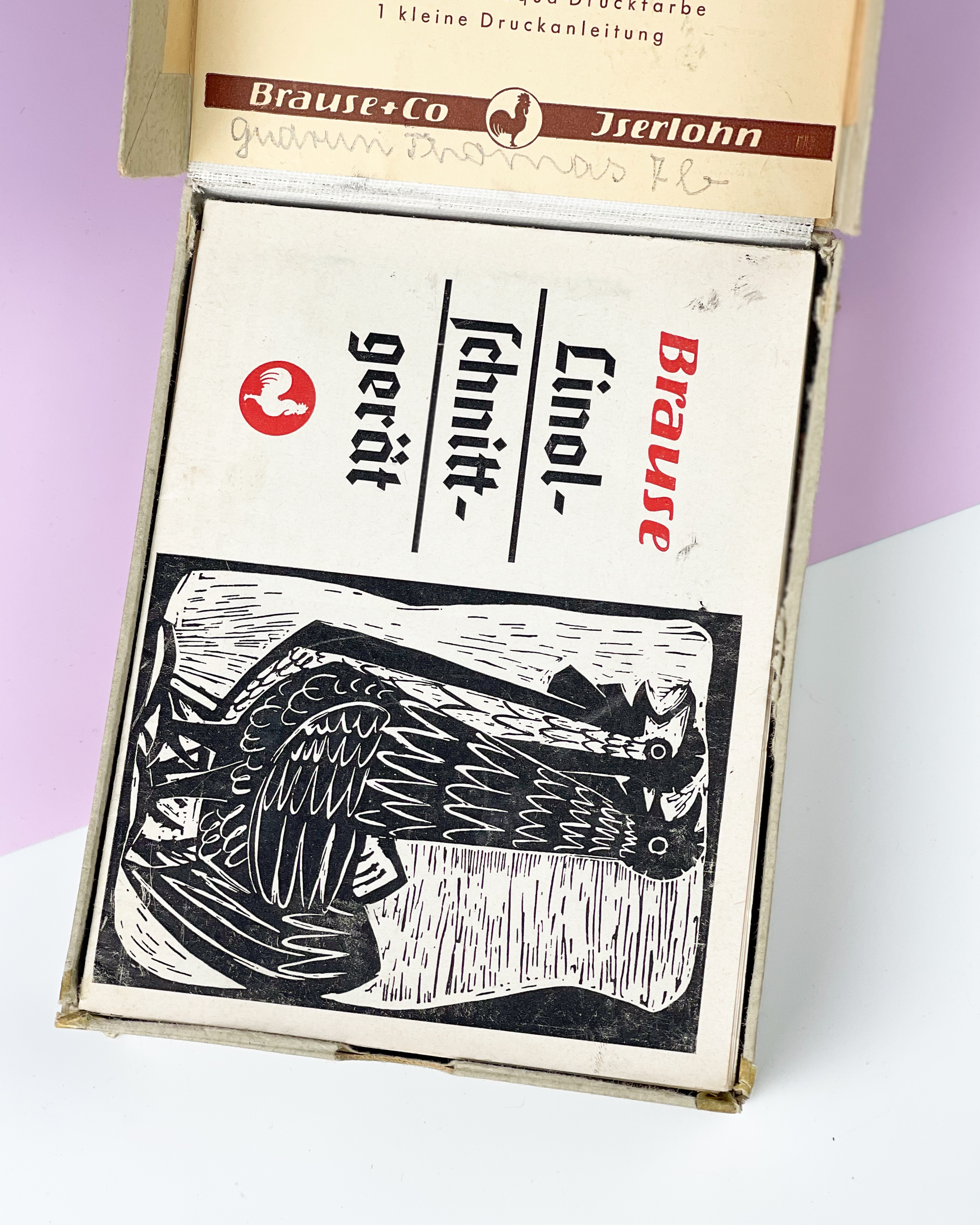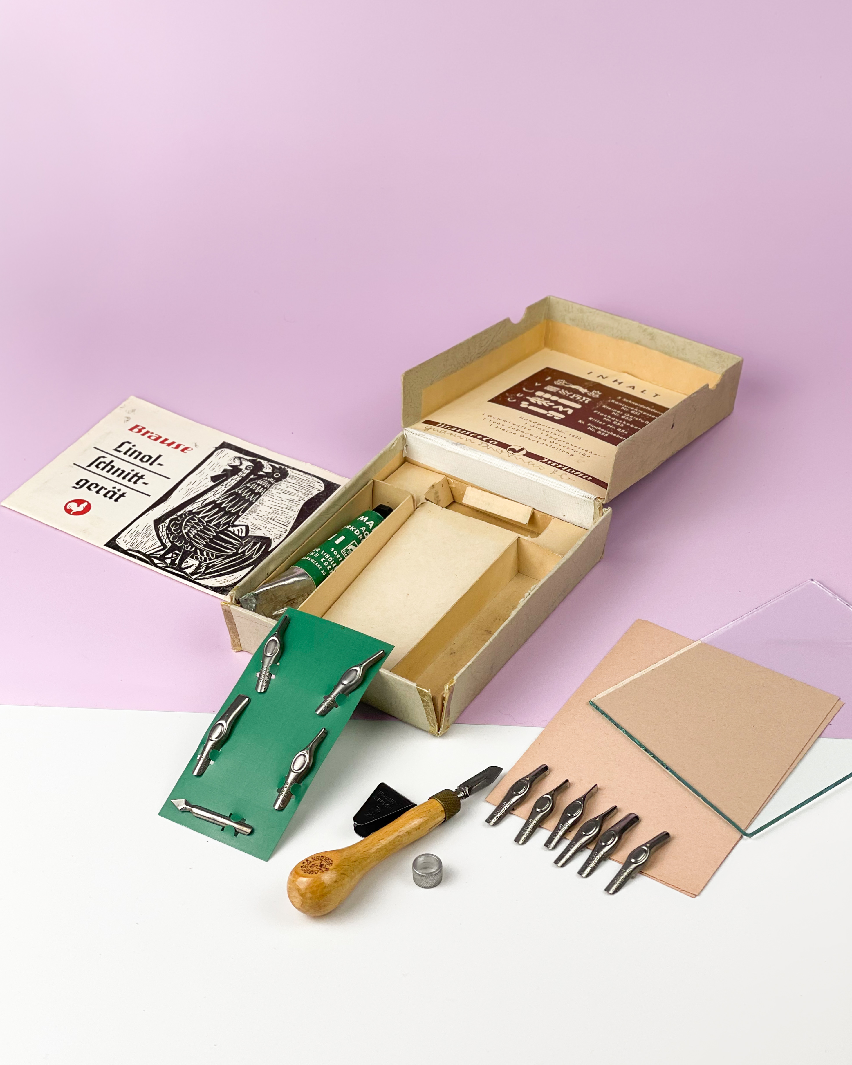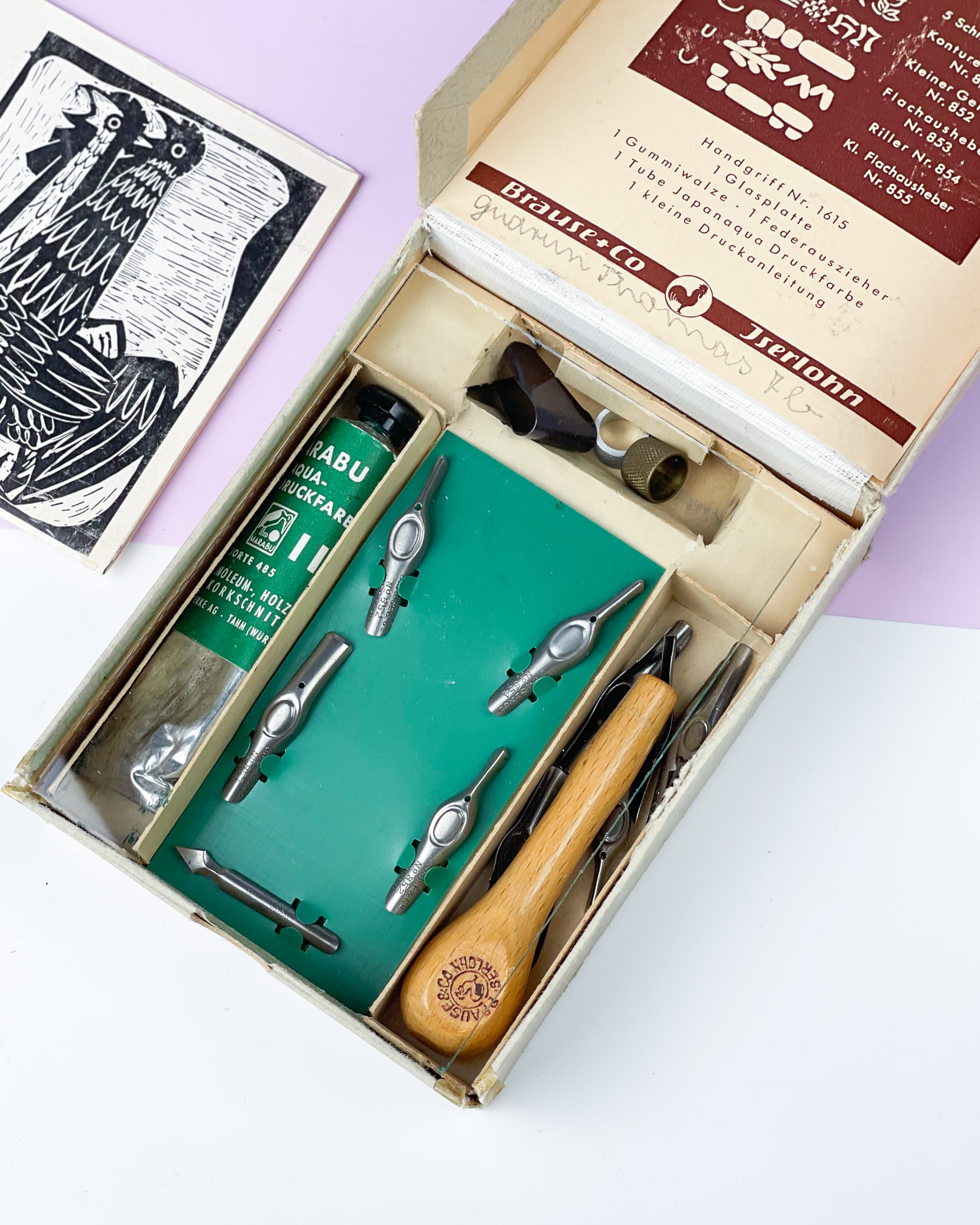 Vintage zestaw narzędzi do linorytu Linolschnitt-Besteck Nr. 872 wyprodukowany przez Brause & Co w Iserlohn, Niemcy. Piękny! I porządny, to nie to co szajs z temu. Trzynaście (!) rodzajów noży, szkiełko do rozprowadzania farby, rączka do noży. Brakuje gumowego wałka, trochę rozklejone pudełko. Farbę wzięłabym nową;) Poza tym w pięknym stanie / 14,5 x 11,5 x 3,5 cm / 160 zł
