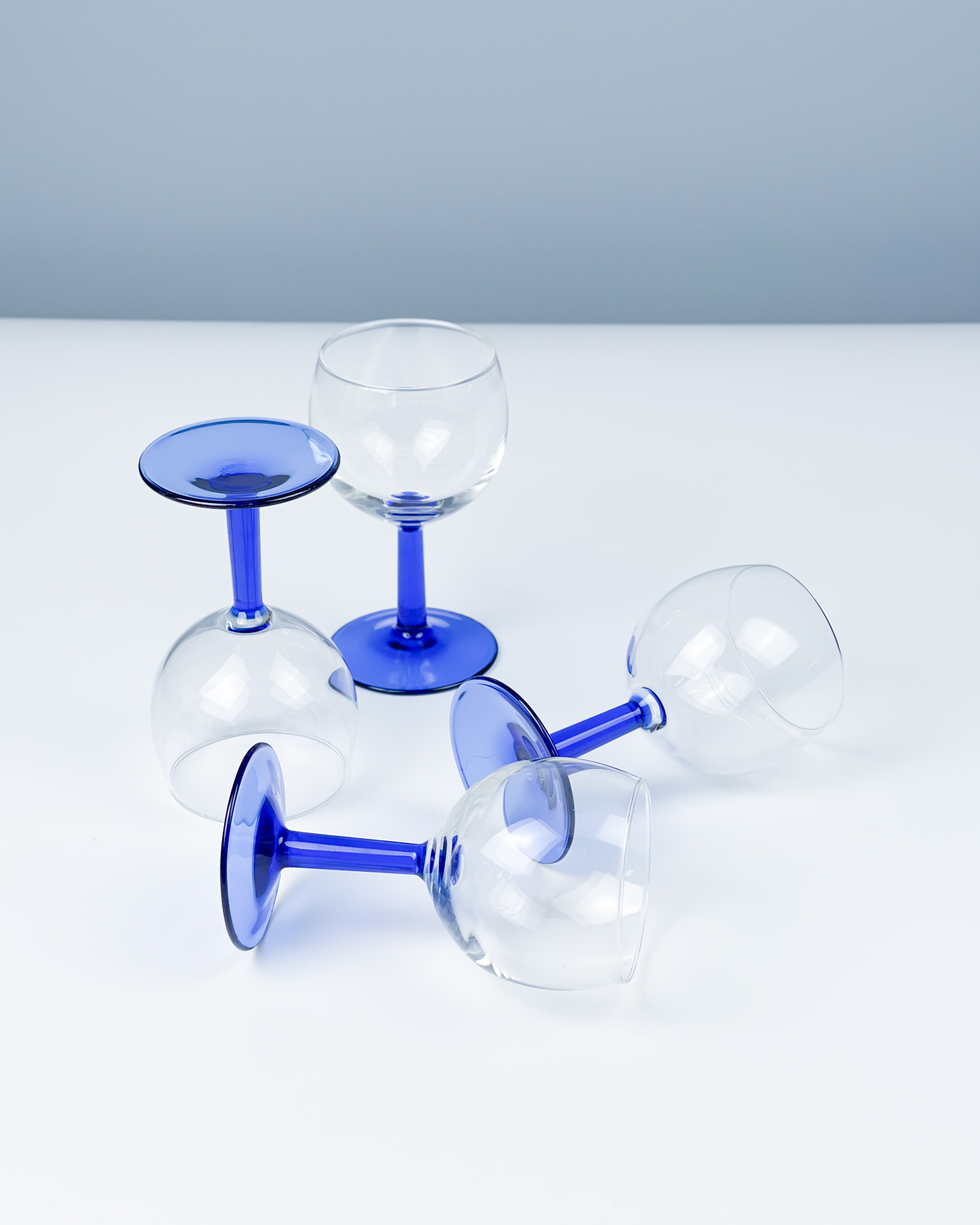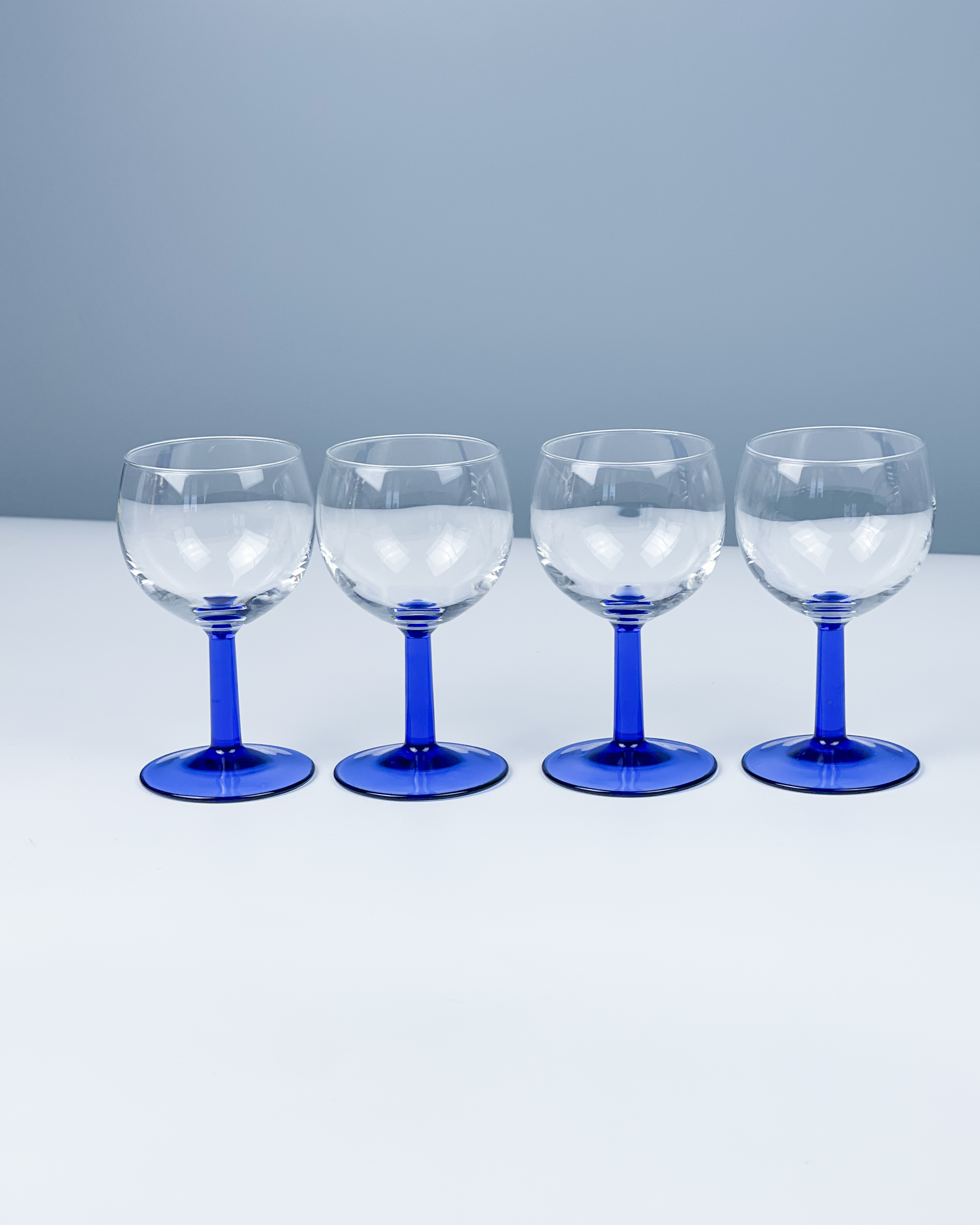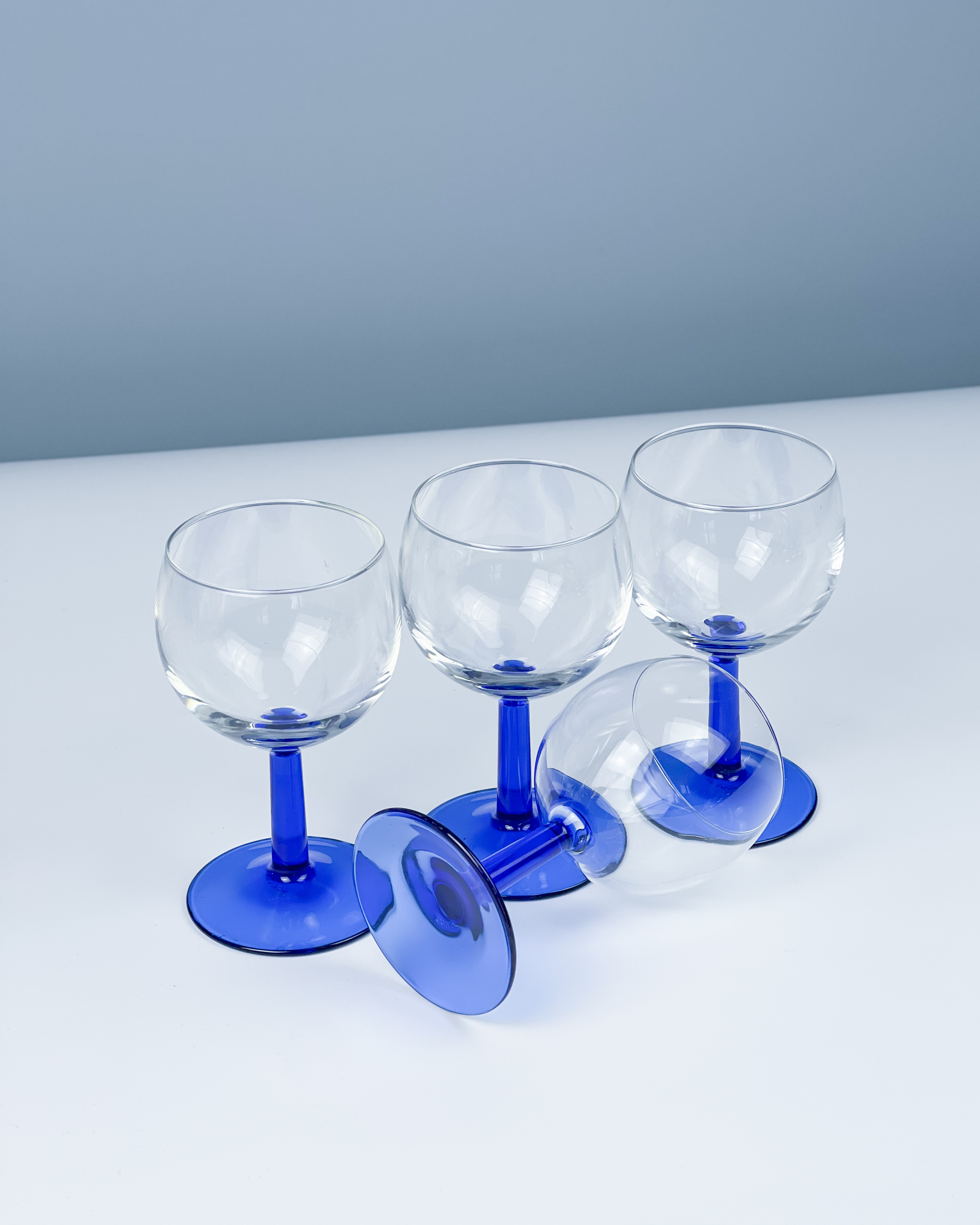 Komplet 4 vintage kieliszków do wina z lat 80. Arcoroc z kobaltową nóżką / made in France / stan bardzo dobry-, rysy na szkle / średnica: 7 cm / wysokość: 13 cm / pojemność: 125 ml / 95 zl za komplet
