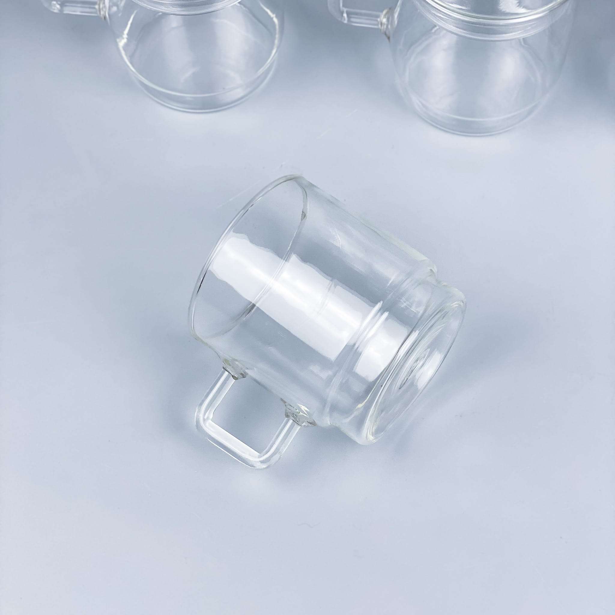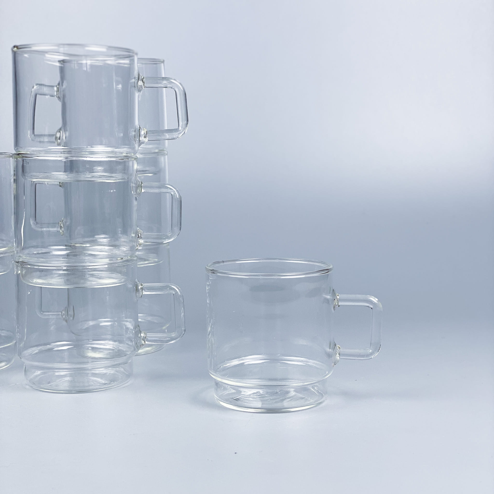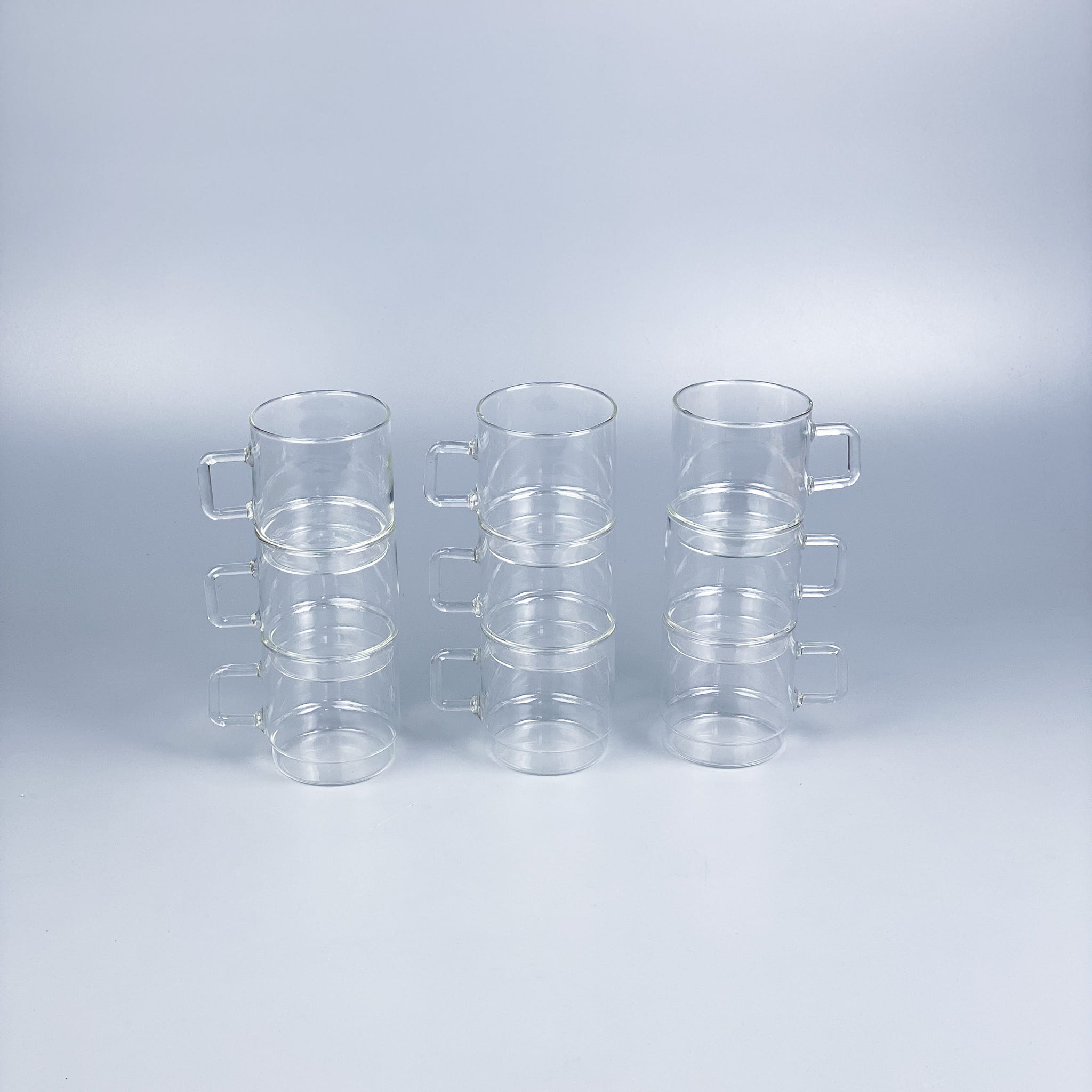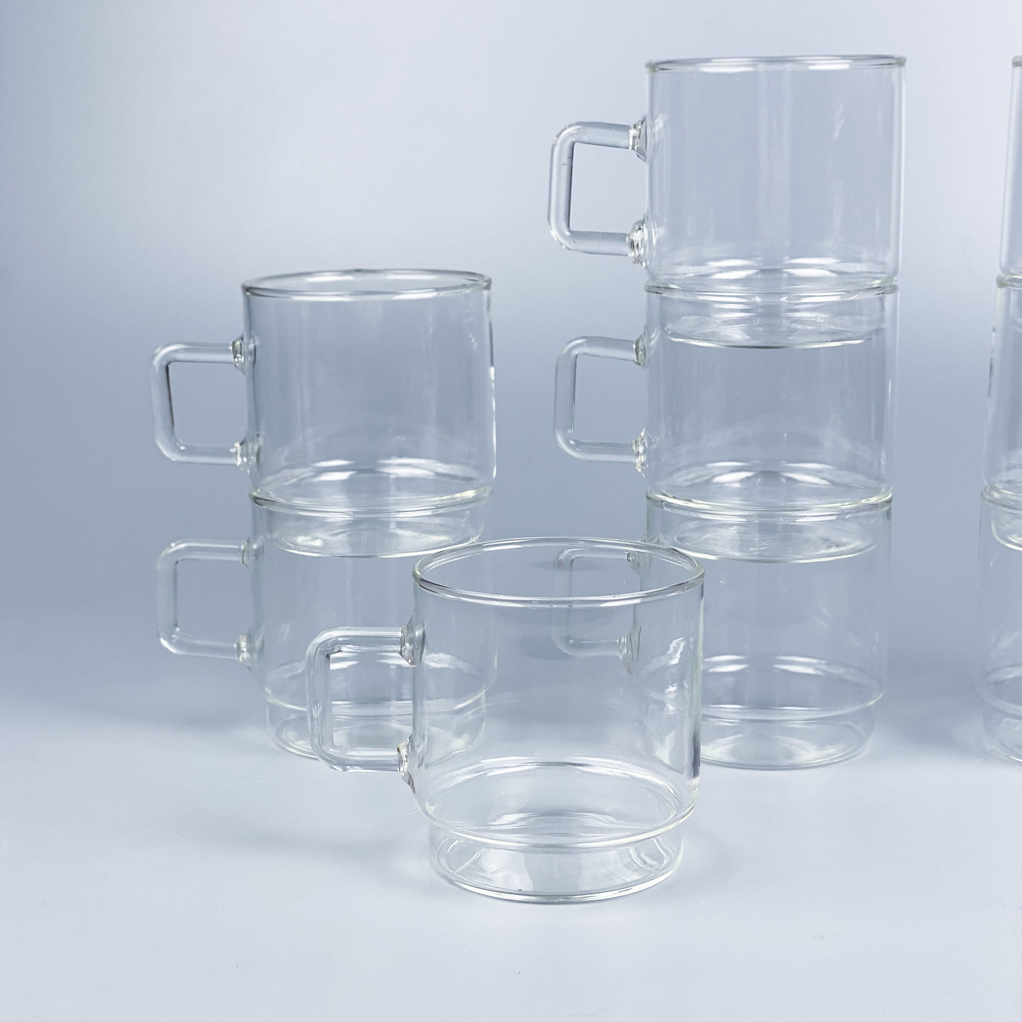Zestaw szklanek ze szkła borokrzemowego Jena Glas. Fajny rozmiar, wygodne uszko, odporne na temperatury. Stan bardzo dobry, minimalne ślady użytkowania / wysokość: 7,5 cm / średnica: 7 cm / pojemność: 0,2l / 170 zł zestaw 5 sztuk