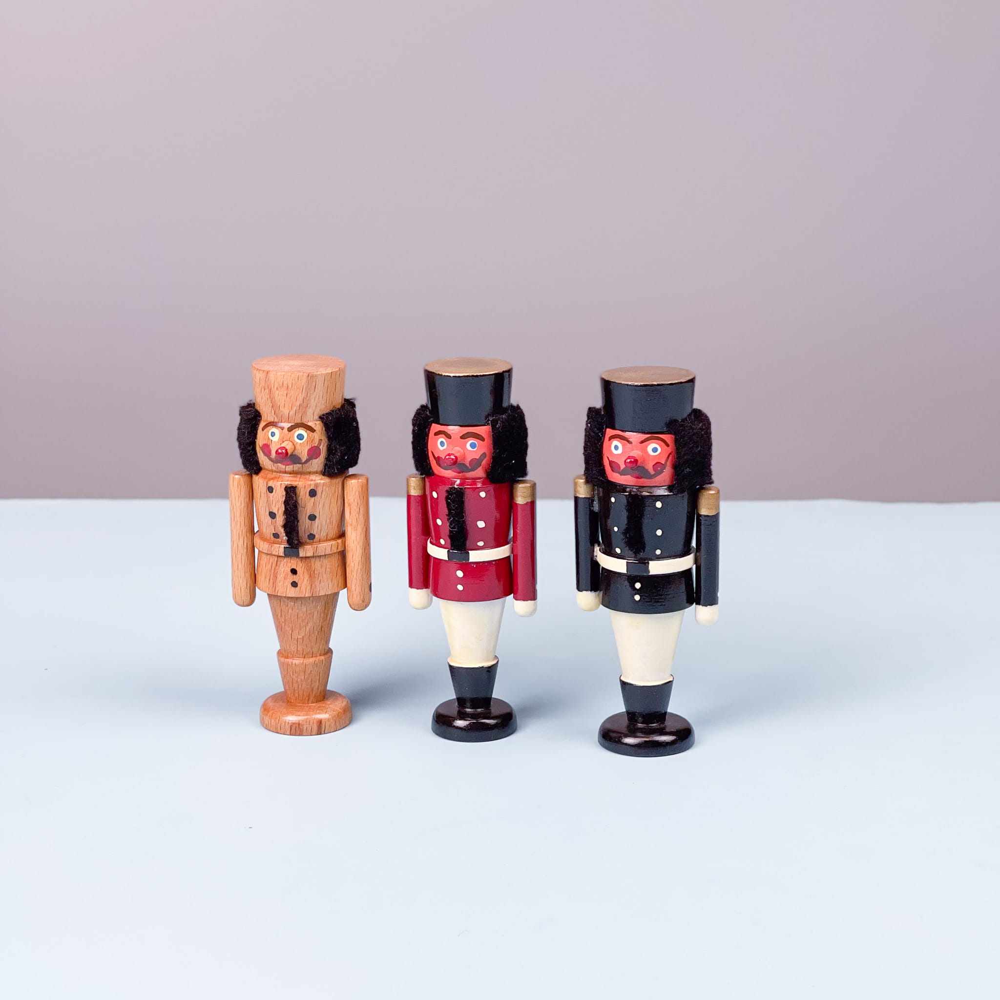 Zestaw trzech mniejszych vintage dziadków do orzechów. Pochodzą z niemieckich Rudaw słynących z wyrobu drewnianych świątecznych zabawek. Ręcznie robione. / wysokość: 11 cm